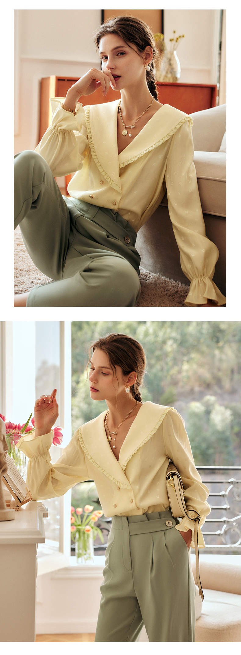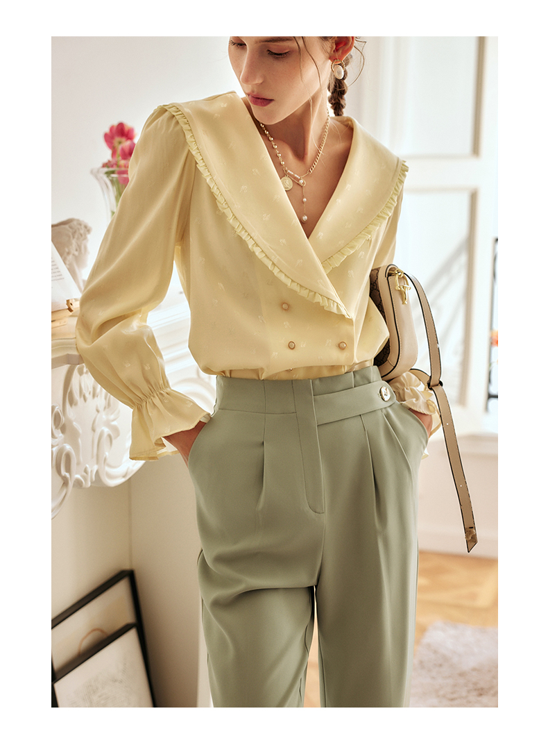欧芮儿缎面长袖衬衫女秋季2022新款宽松显瘦时尚气质翻领提花衬衣