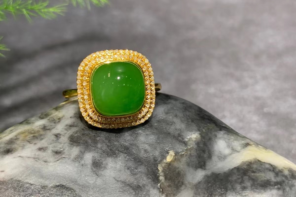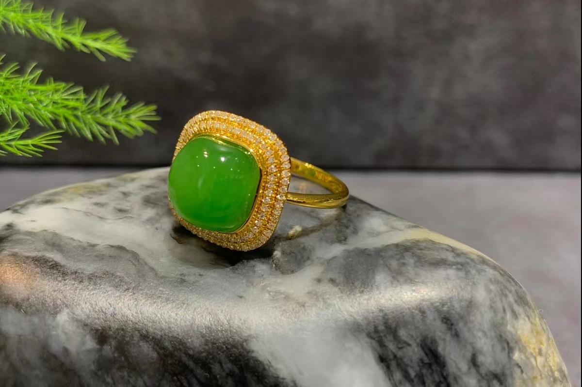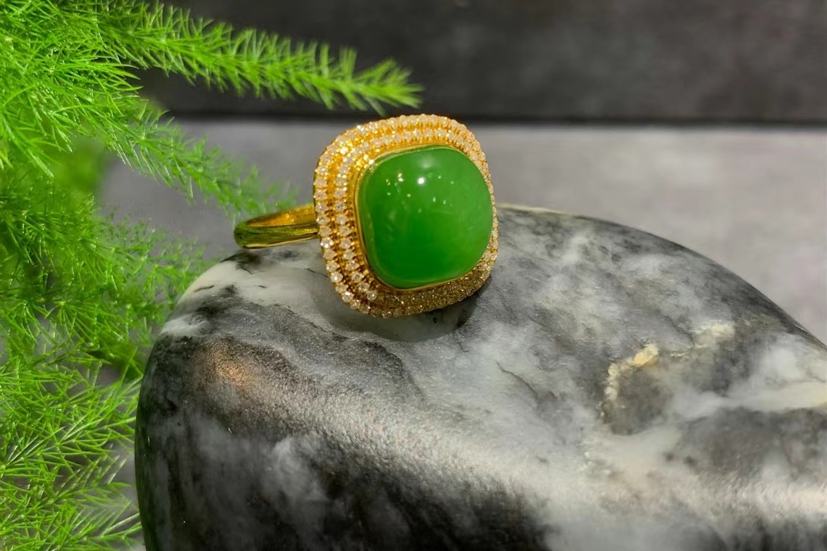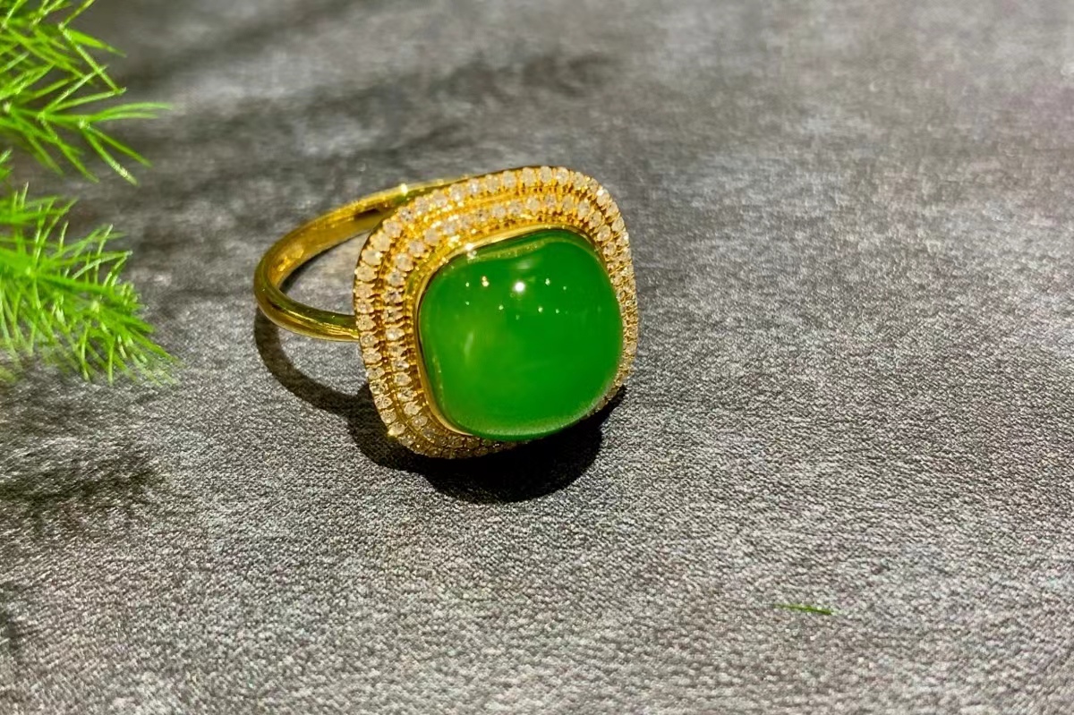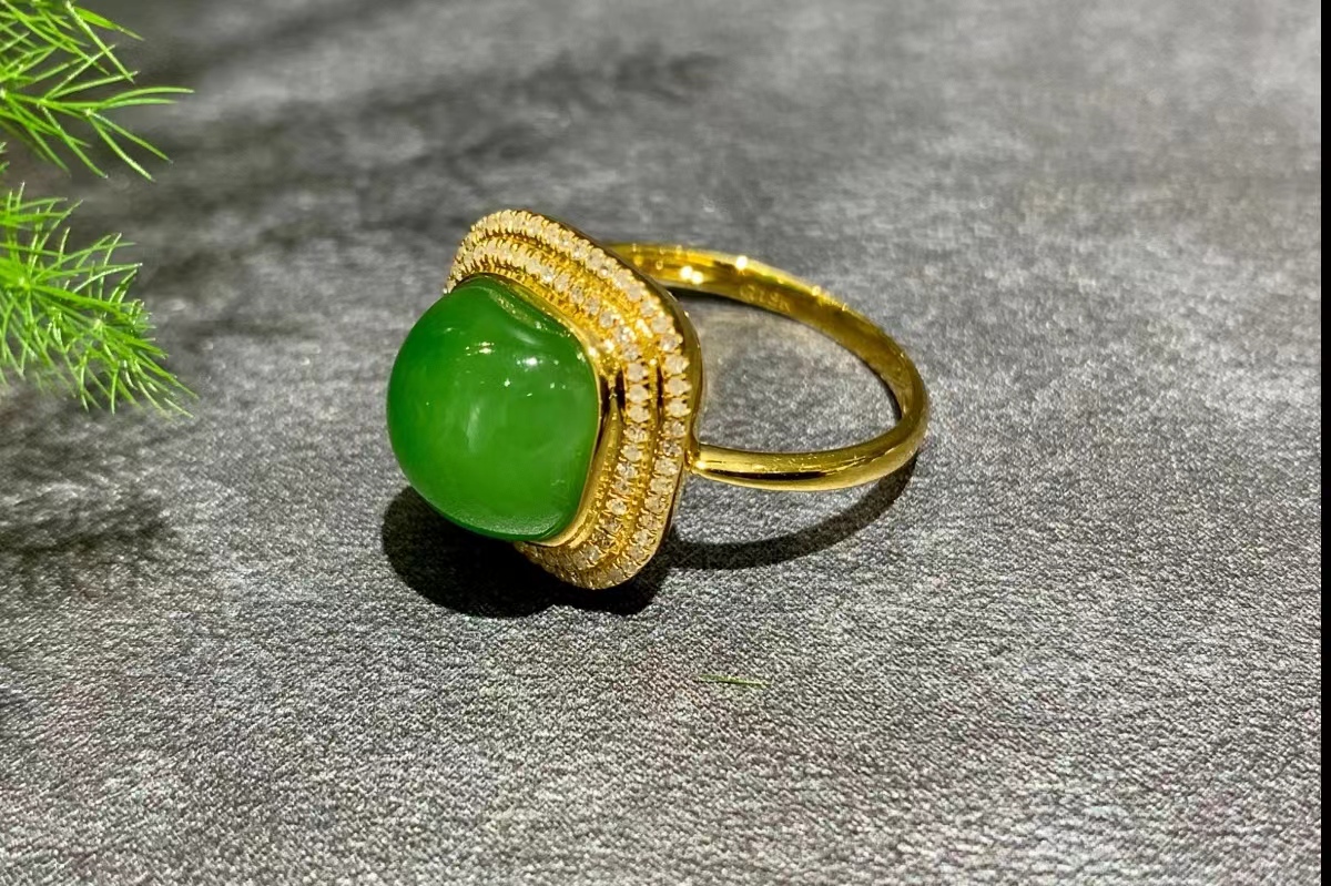 该款金镶碧玉戒指为青翠的果绿色,宛如春日新叶,清新脱俗🍀