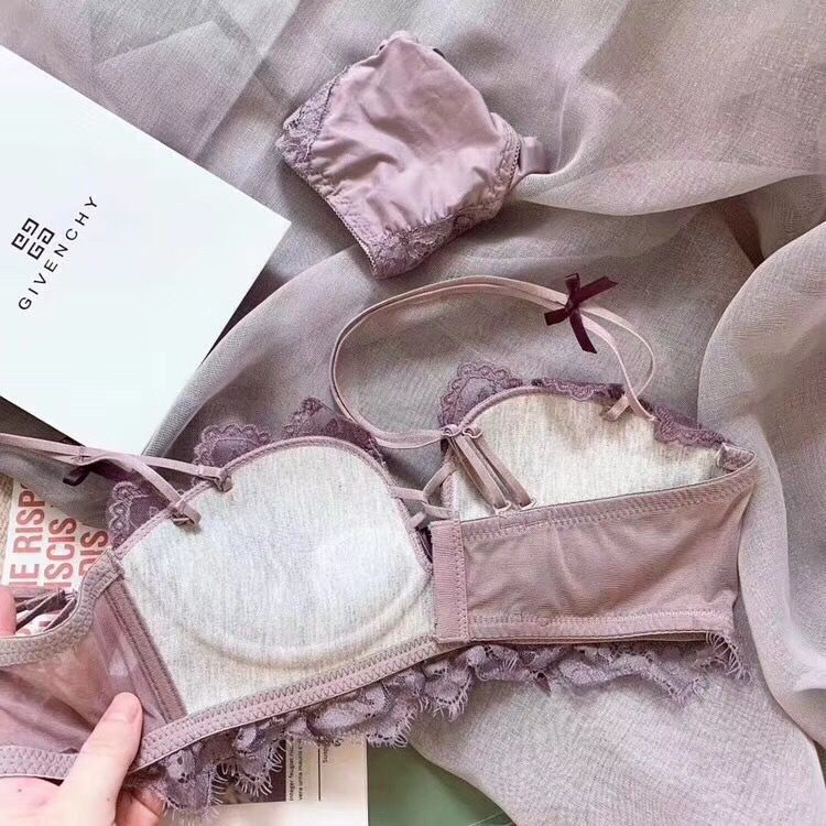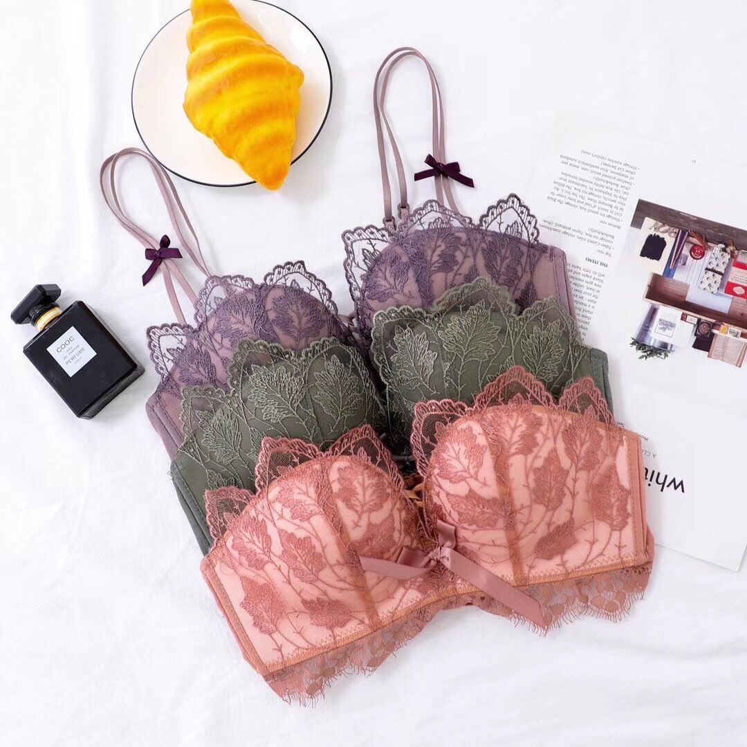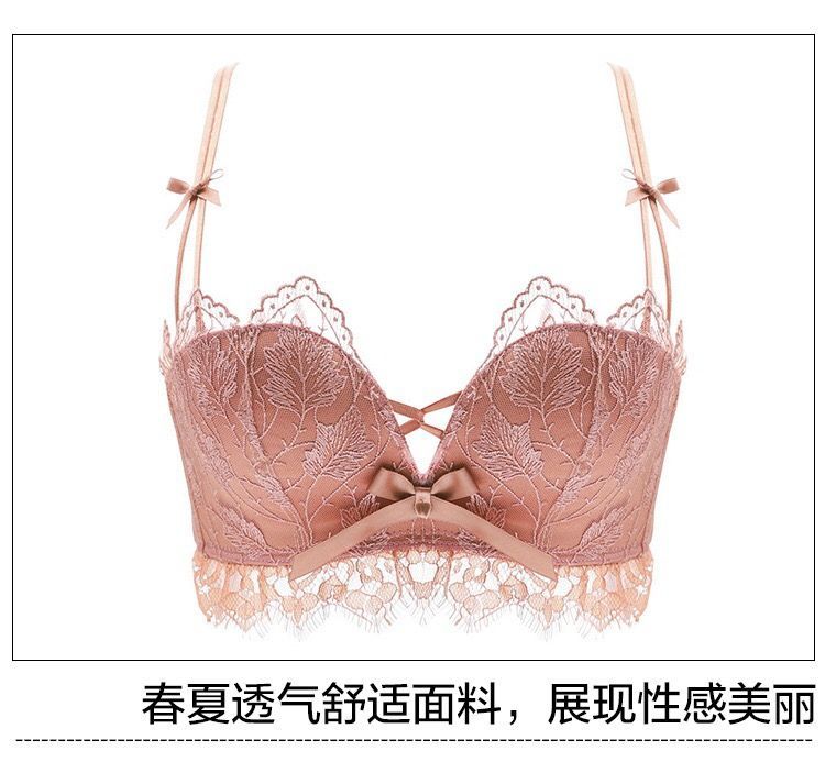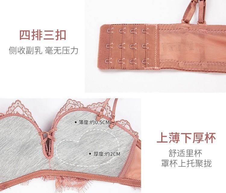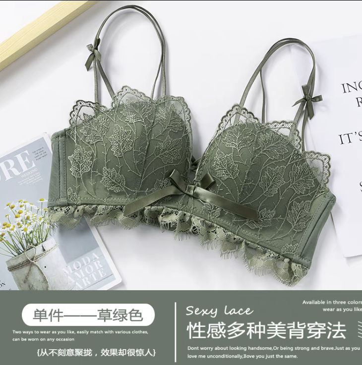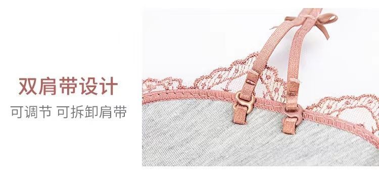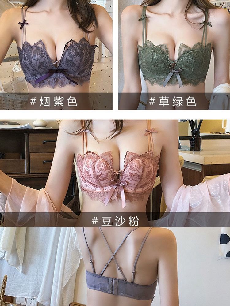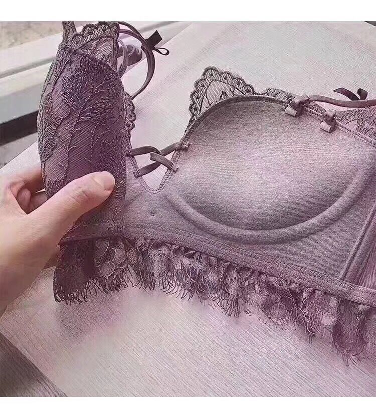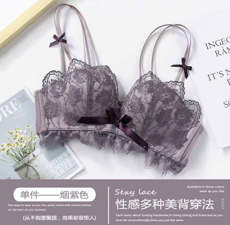 黛唯梵薰衣草无钢圈美背交叉小胸聚拢内衣调整型上托文胸女士蕾丝性感文胸内衣裤套装