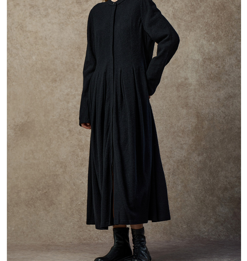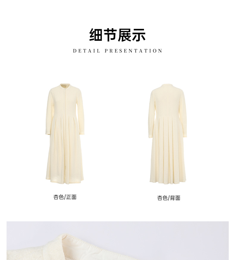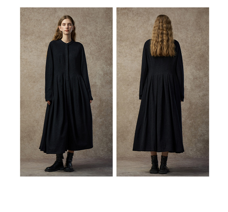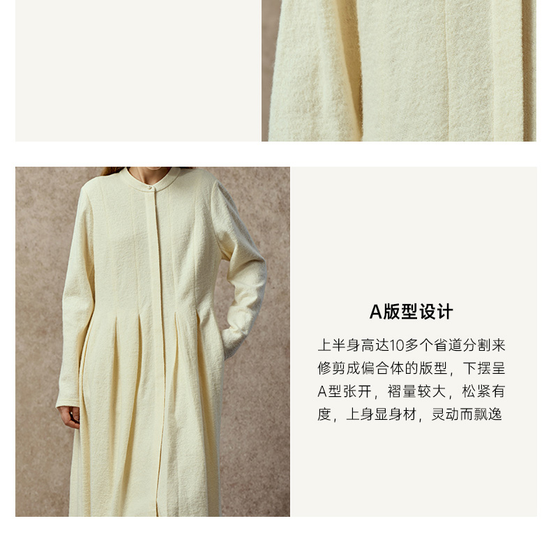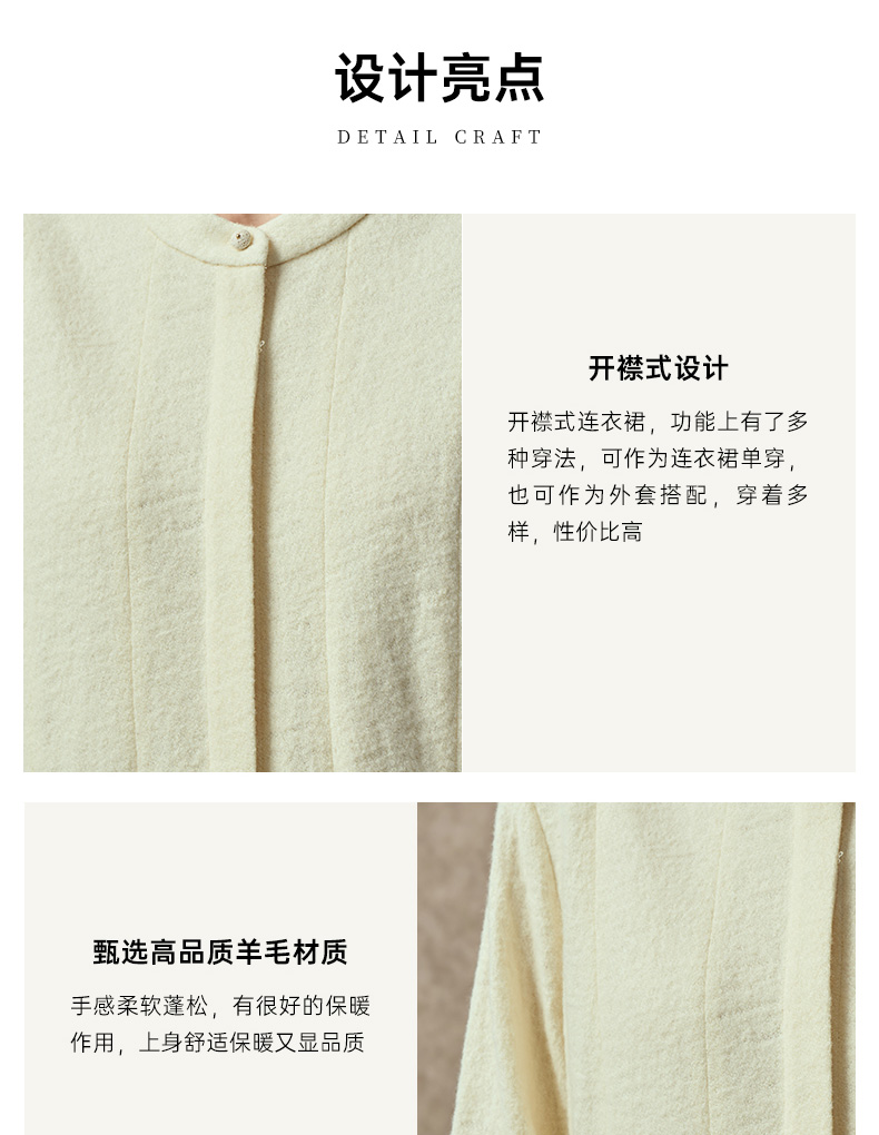Famecoco简约经典肌理感羊毛开襟连衣裙中式圆领A字长裙FAC8FA017