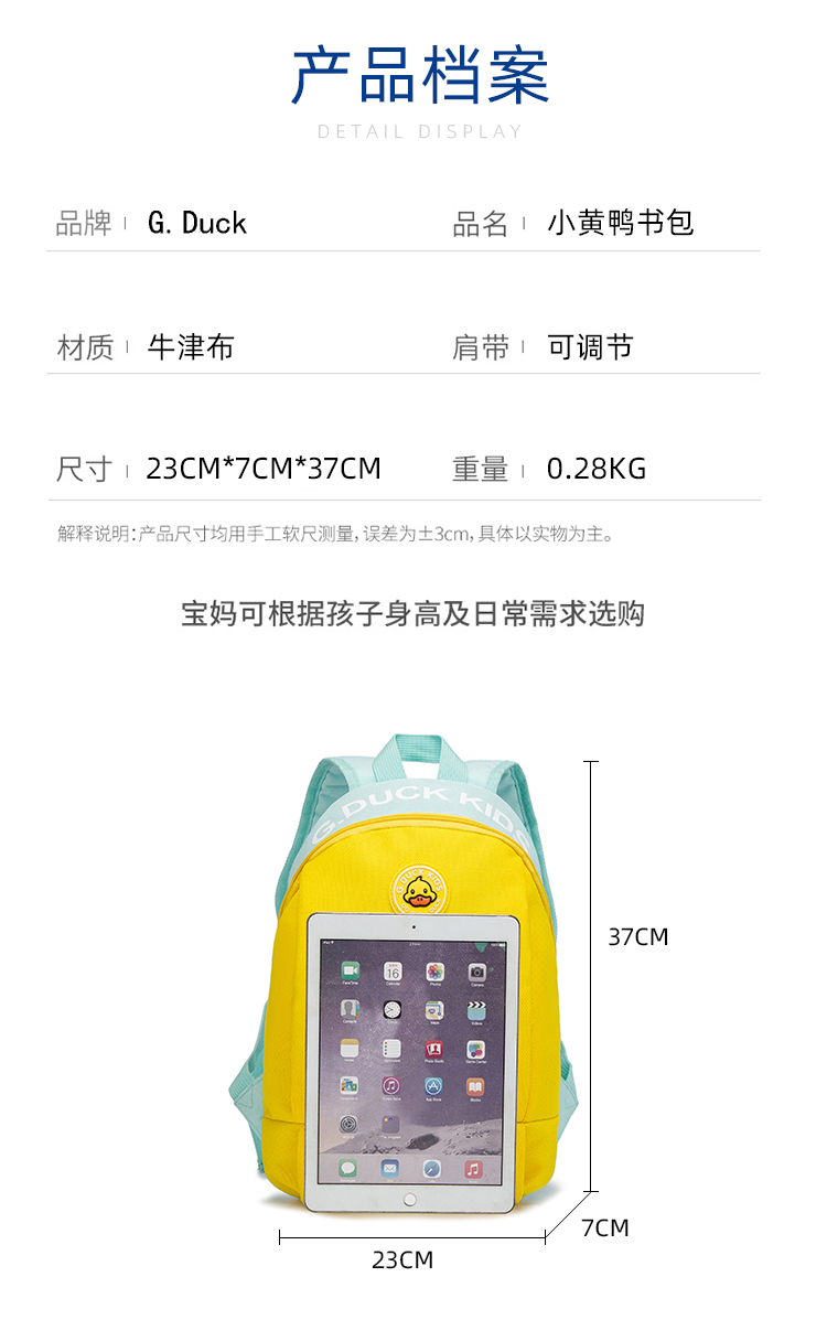 G.DUCK小黄鸭儿童书包 上学户外旅游双肩包 轻便易携带 高颜值可爱萌宠图案