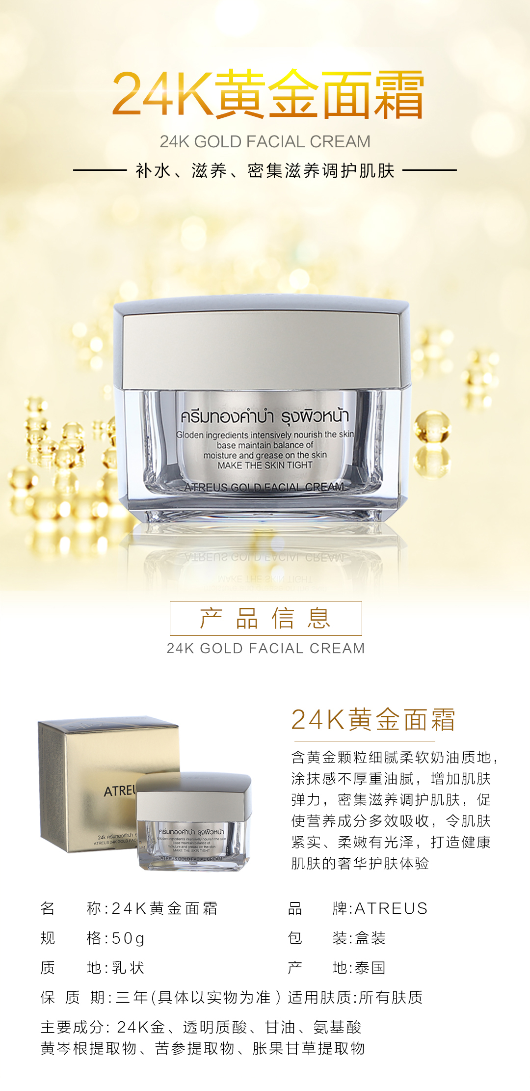 【中欧班列精选】 泰国ATREUS 24K黄金面霜50G MMT
