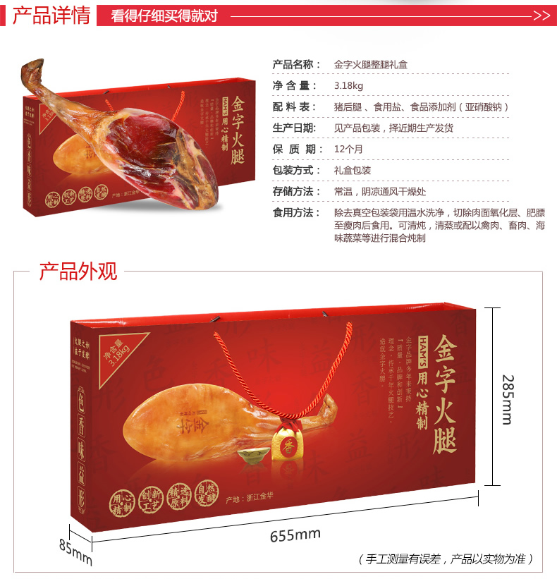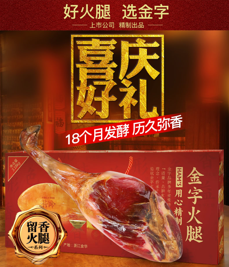 【送礼佳选 喜庆中国红】金字金华火腿整腿 3.18kg 送礼佳品 浙江特产 国家非物质文化遗产