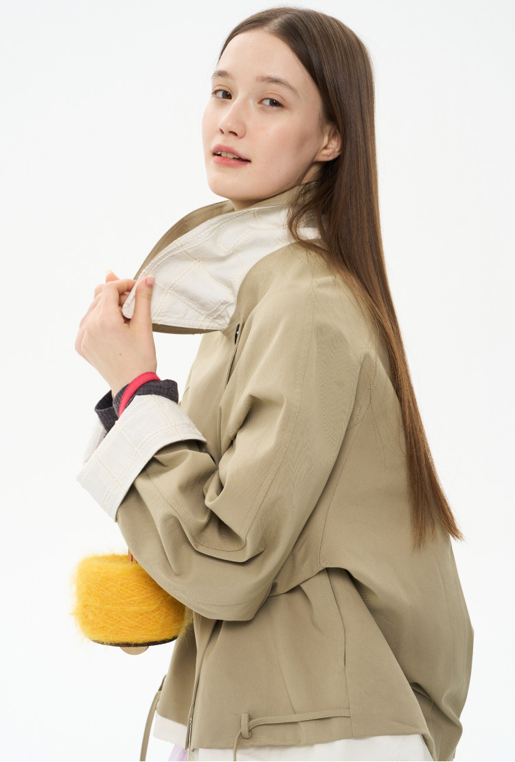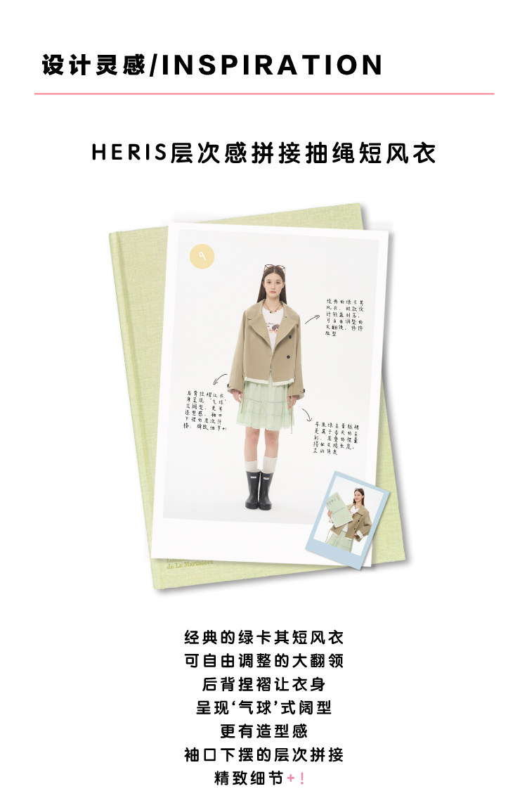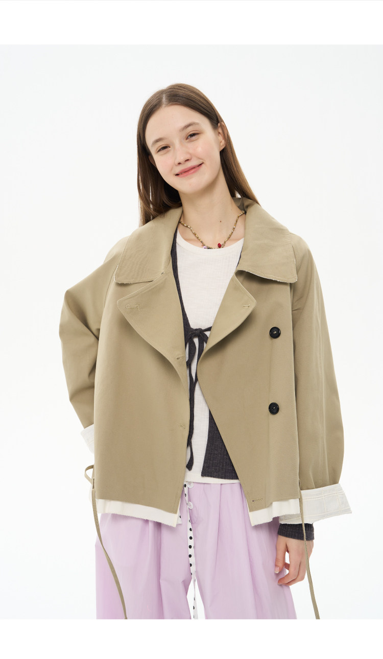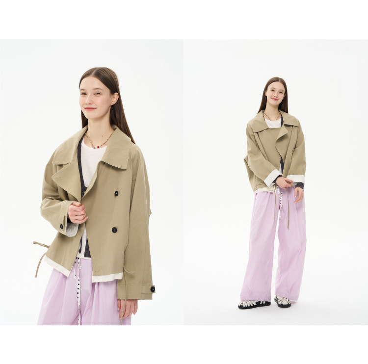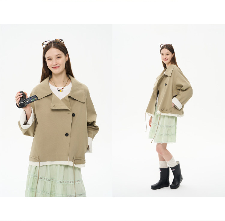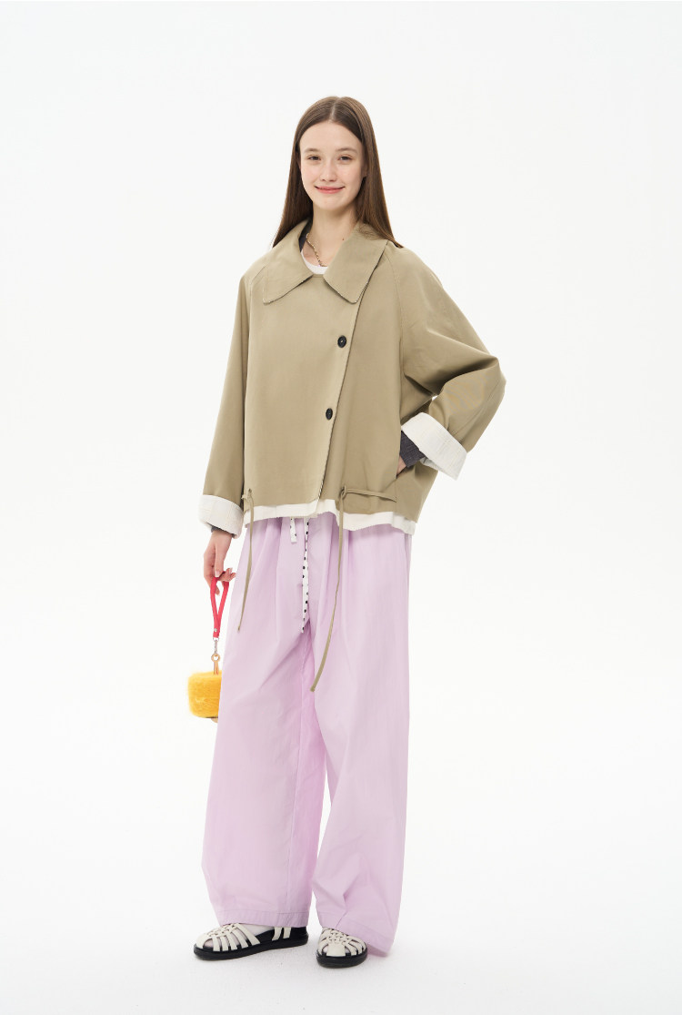 heris/H61110/ 立体翻领侧门襟 艺术感层次拼接 抽绳阔型短款风衣外套