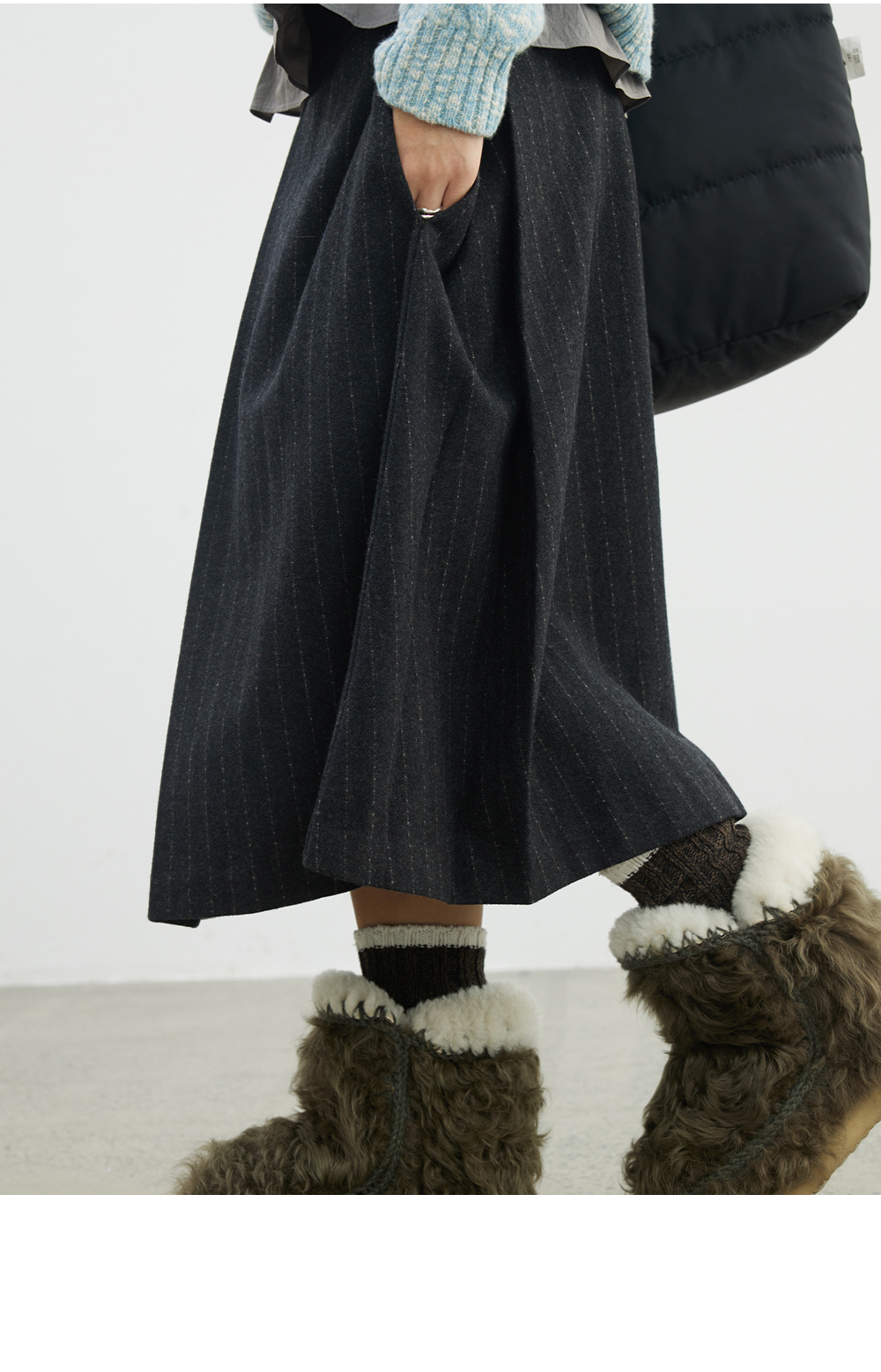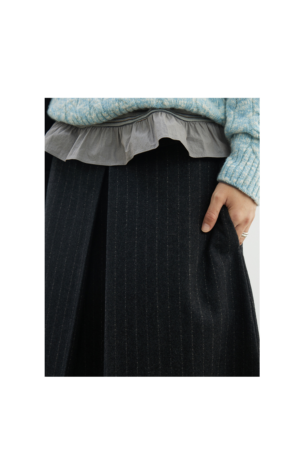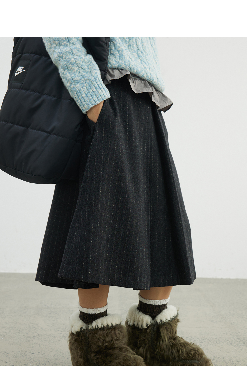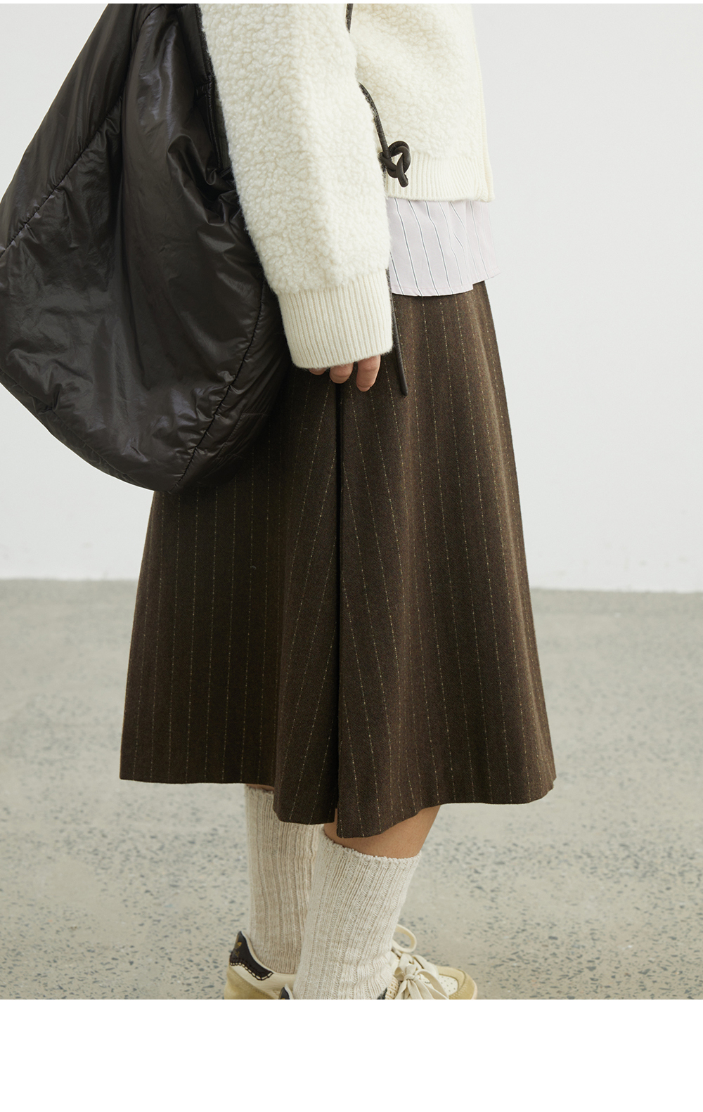 步履不停/4D41125C/复古黑白竖条纹A字呢子羊毛半身裙