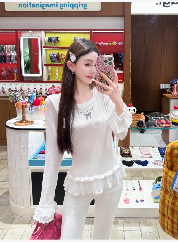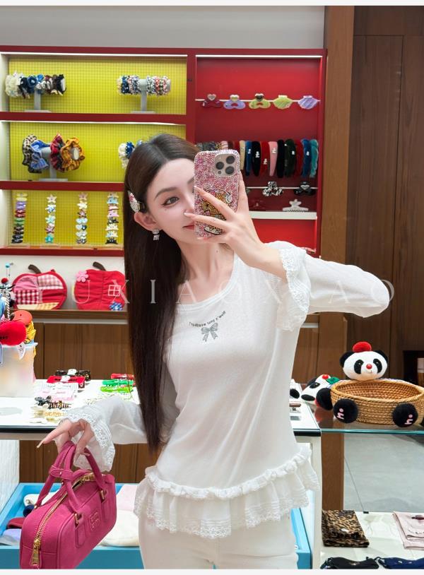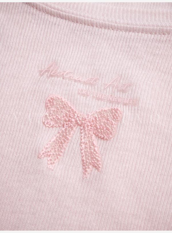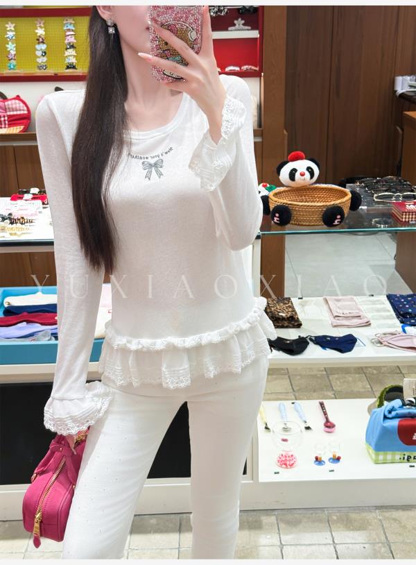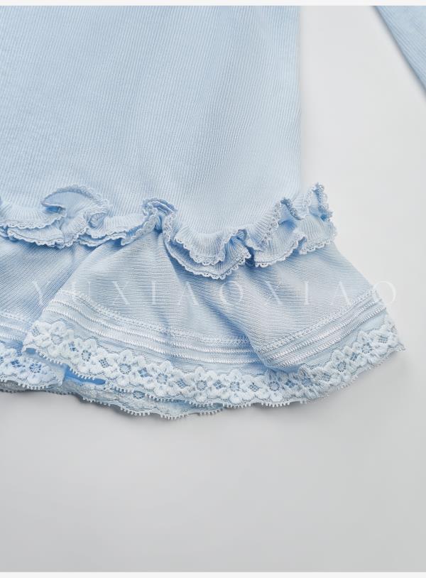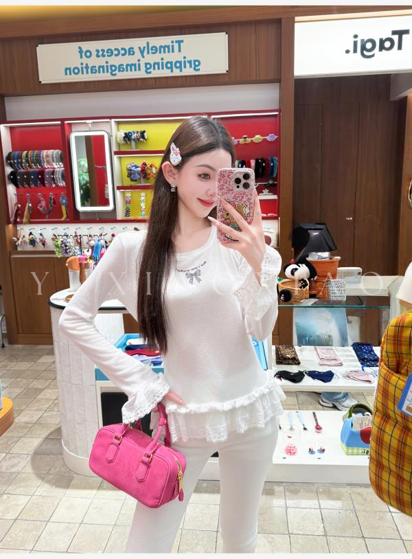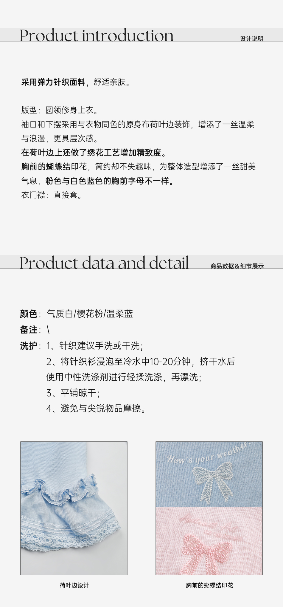 余潇潇【甜心芭蕾】浪漫温柔蝴蝶结印花圆领经典弹力荷叶边针织衫