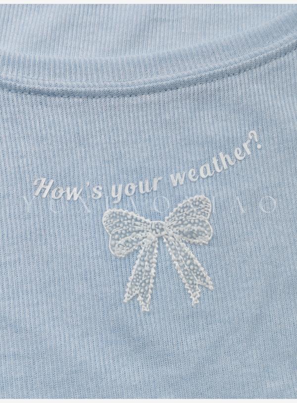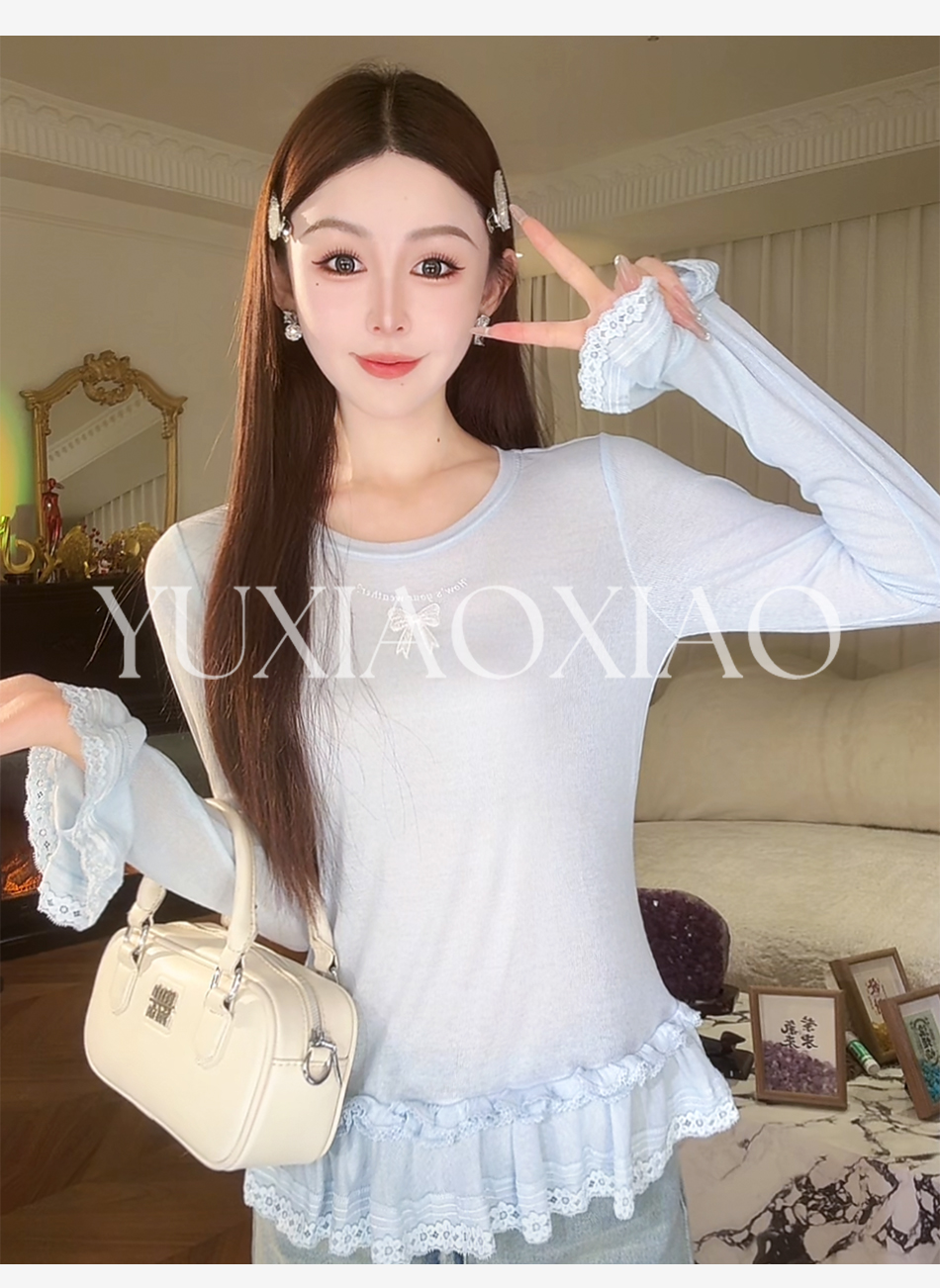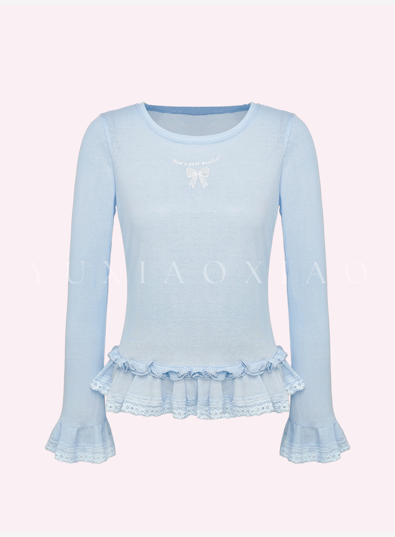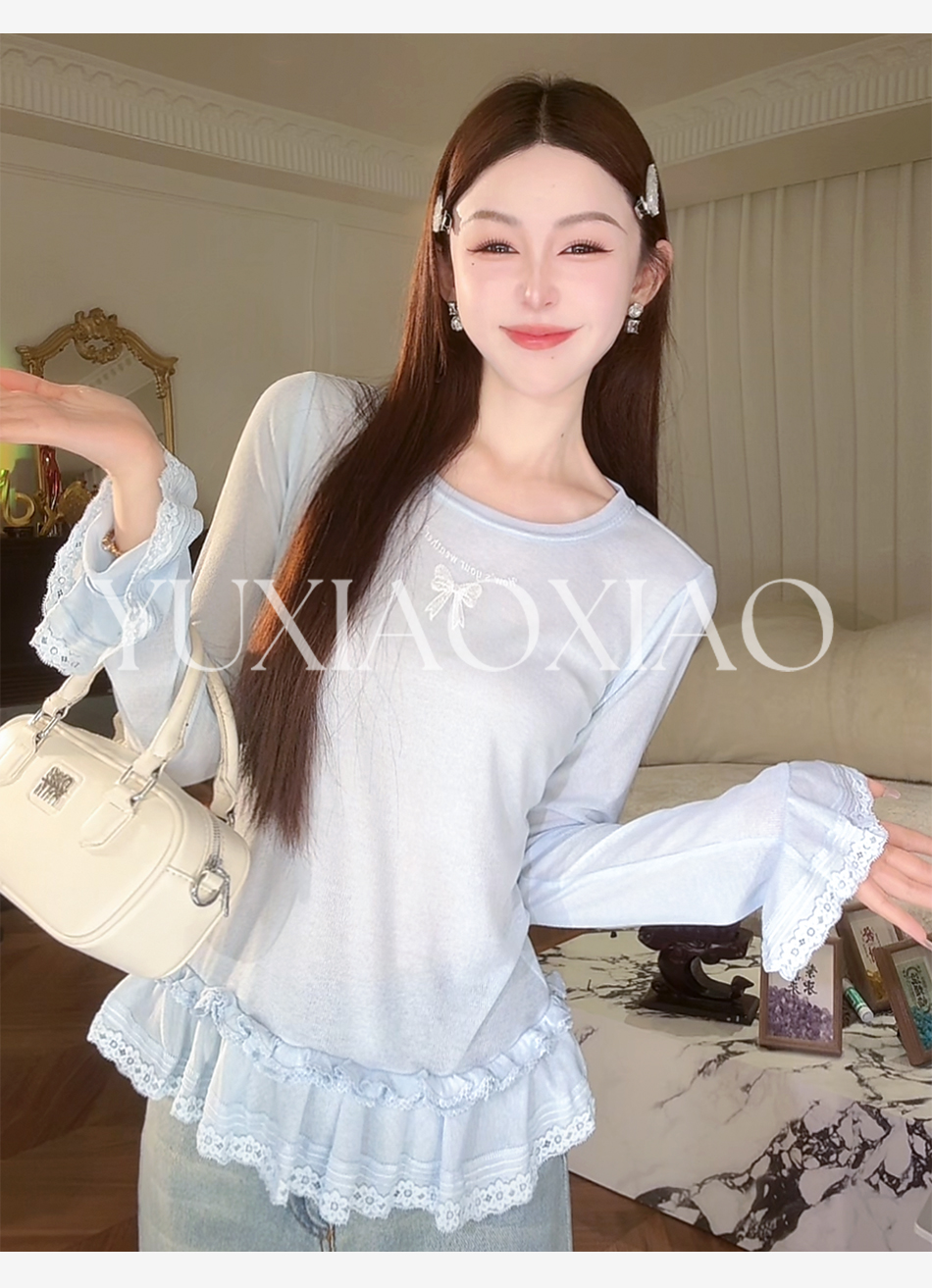 余潇潇【甜心芭蕾】浪漫温柔蝴蝶结印花圆领经典弹力荷叶边针织衫