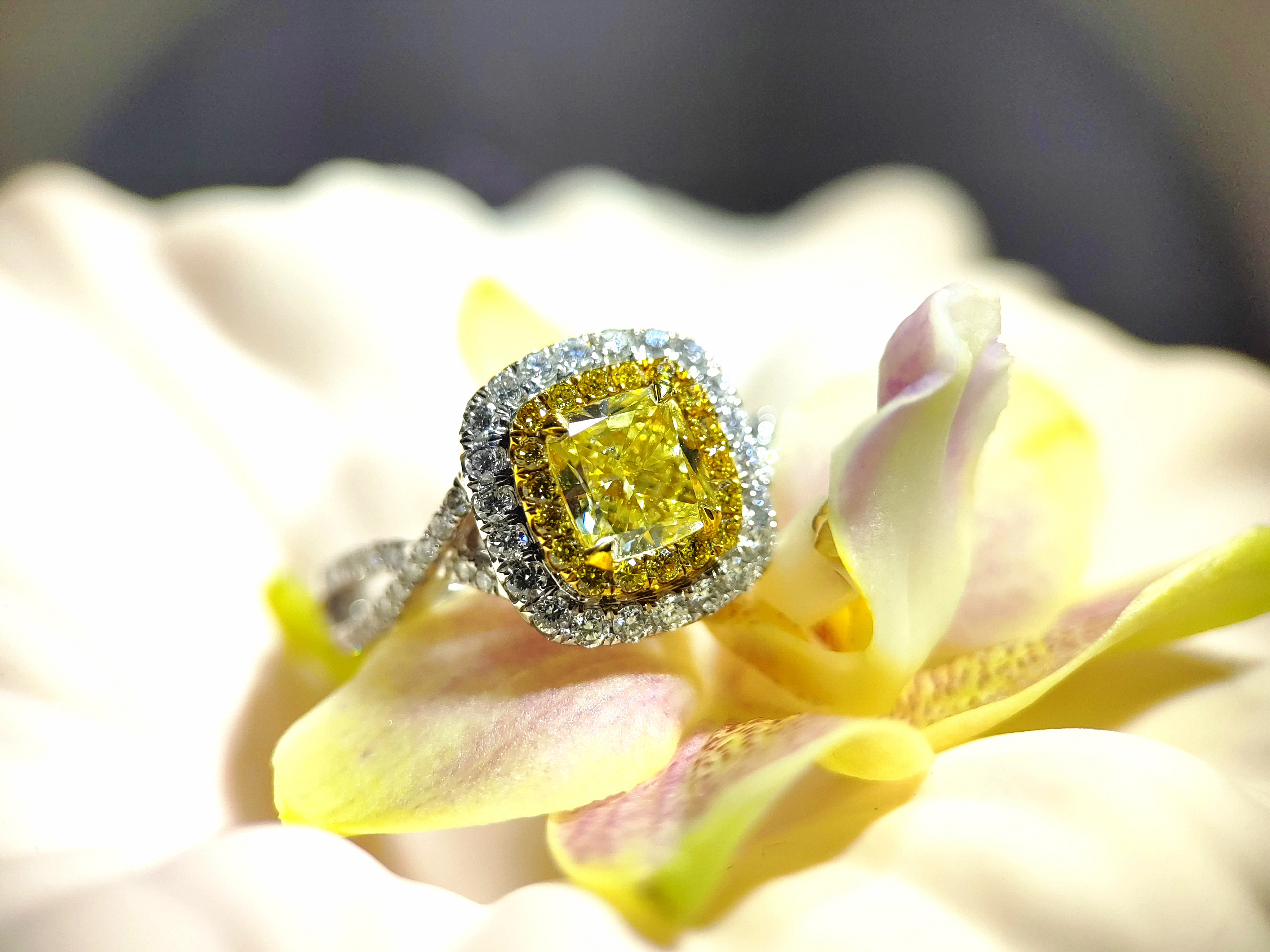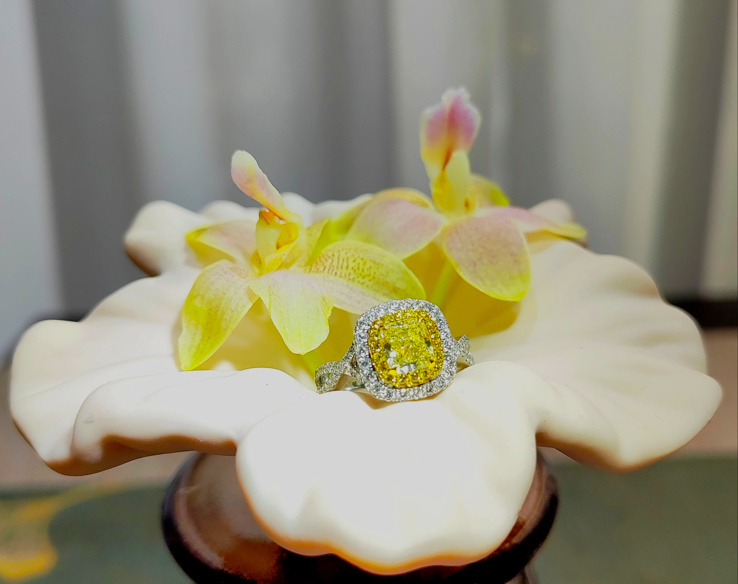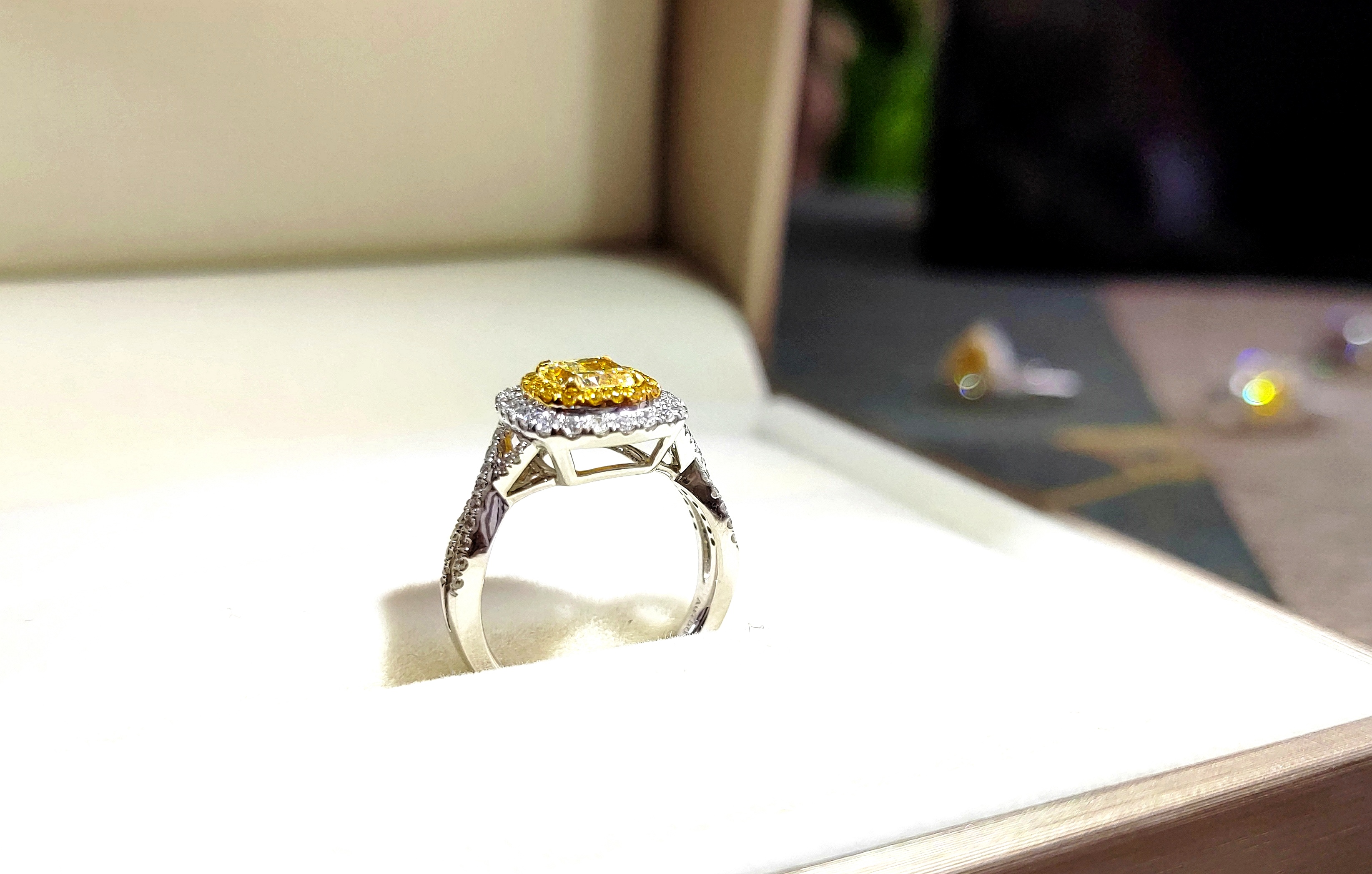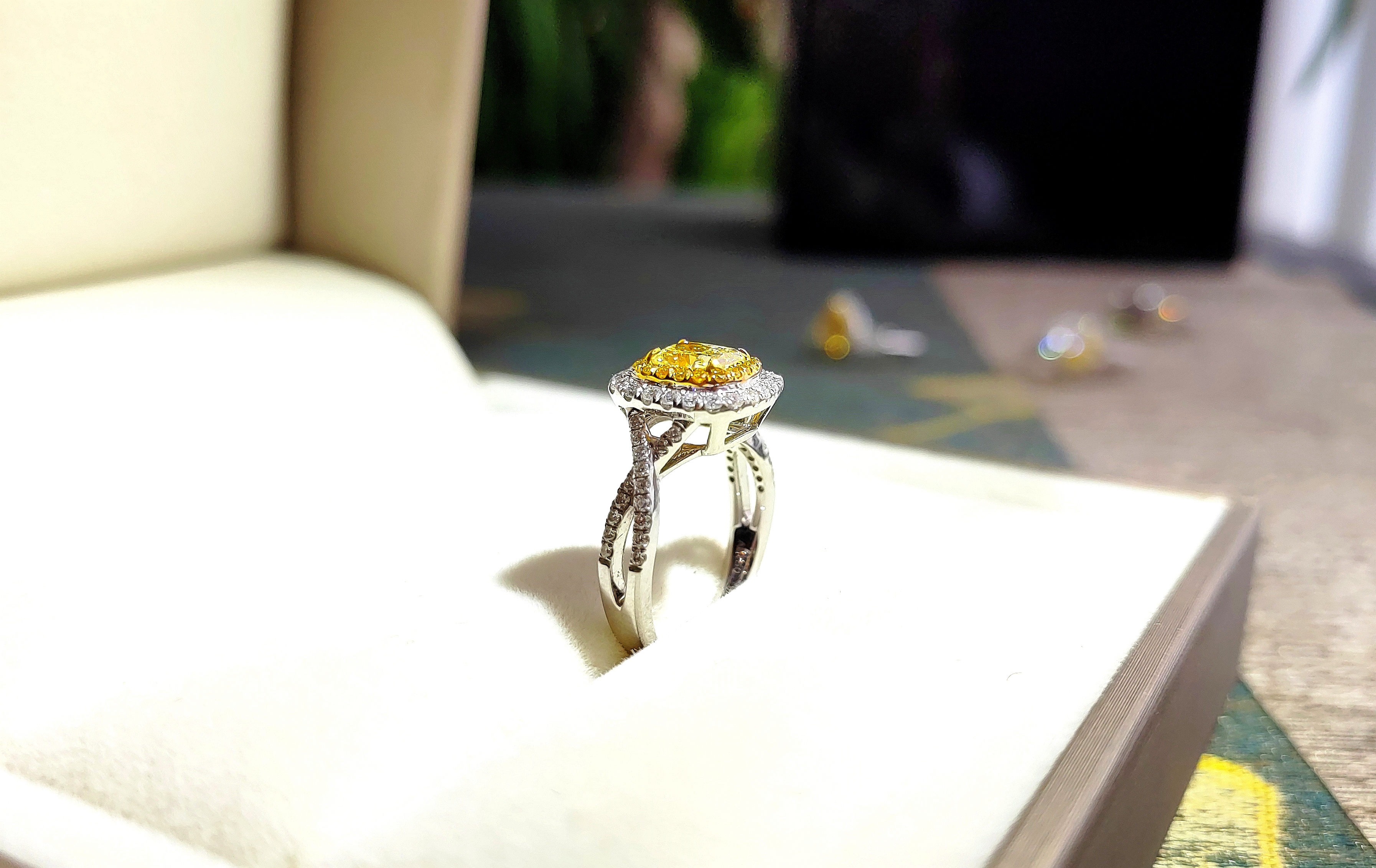 这枚黄钻戒指,净度非常好,颜色达到fancy light yellow,显色镶嵌后饱和度高,配以经典豪华镶嵌,是婚戒的最佳选择!