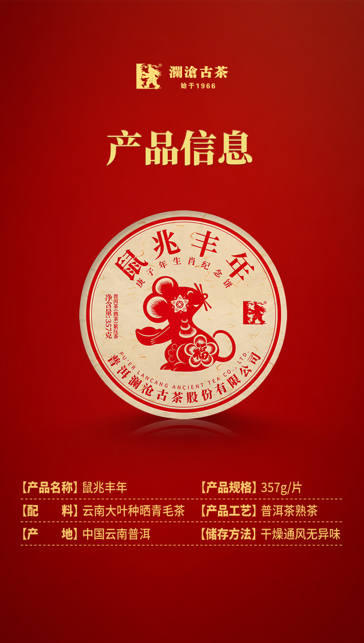 鼠兆丰年以“澜沧味”的核心拼配技术打造,成品饼形端正,色泽乌润,芽毫显露,饱满;汤色红浓通透;香气纯正馥郁,杯底留香;滋味醇厚,甜润回甘,茶韵悠长。是品饮、馈赠、收藏理想佳品。