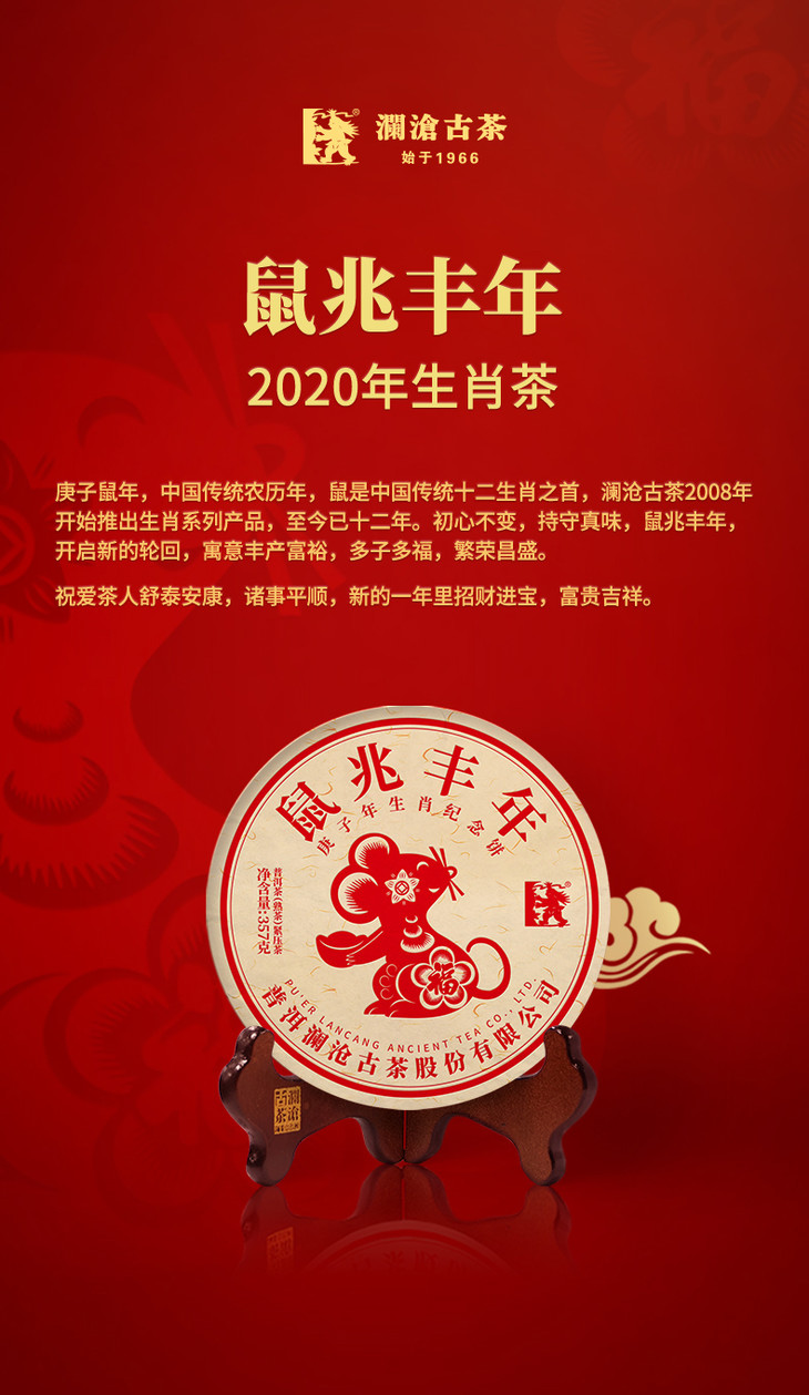 庚子鼠年,中国传统农历年,鼠是中国传统十二生肖之首,澜沧古茶2008年开始推出生肖系列产品,至今已十二年。初心不变,持守真味,鼠兆丰年,开启新的轮回,寓意丰产富裕,多子多福,繁荣昌盛。