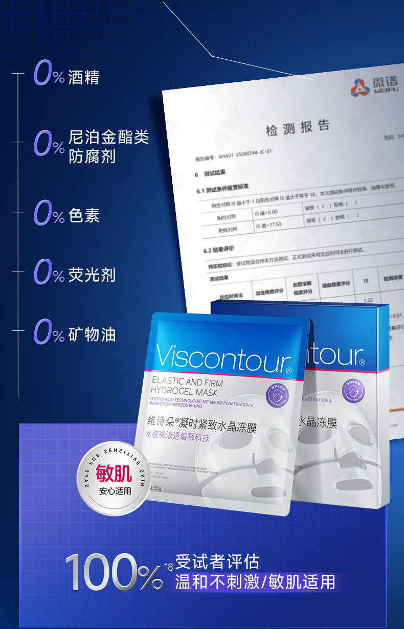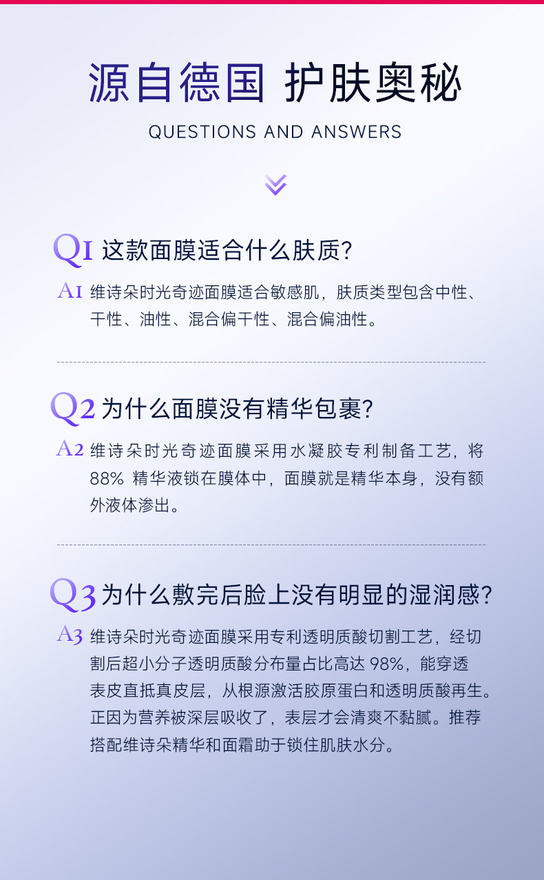 维诗朵是源自德国的品牌,属于德国百年药企史达德旗下。维诗朵时光奇迹面膜是与世界No.1的水凝胶技术中心合作的新品,采用了顶尖的医用水凝胶技术,配方中添加了维诗朵品牌的王牌进口成分寡聚分子透明质酸。考虑到物流以及水凝胶技术的优势,品牌选择在国内生产,并依然延续了德式的严谨工艺和原料技术。