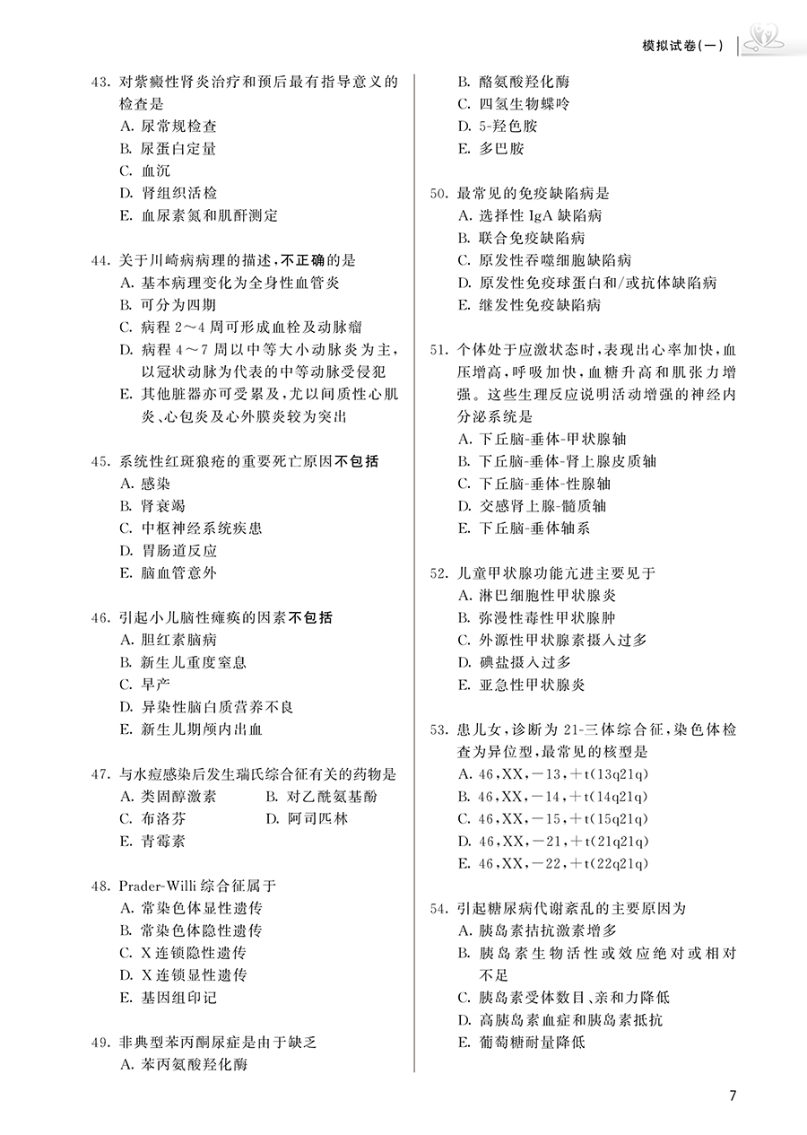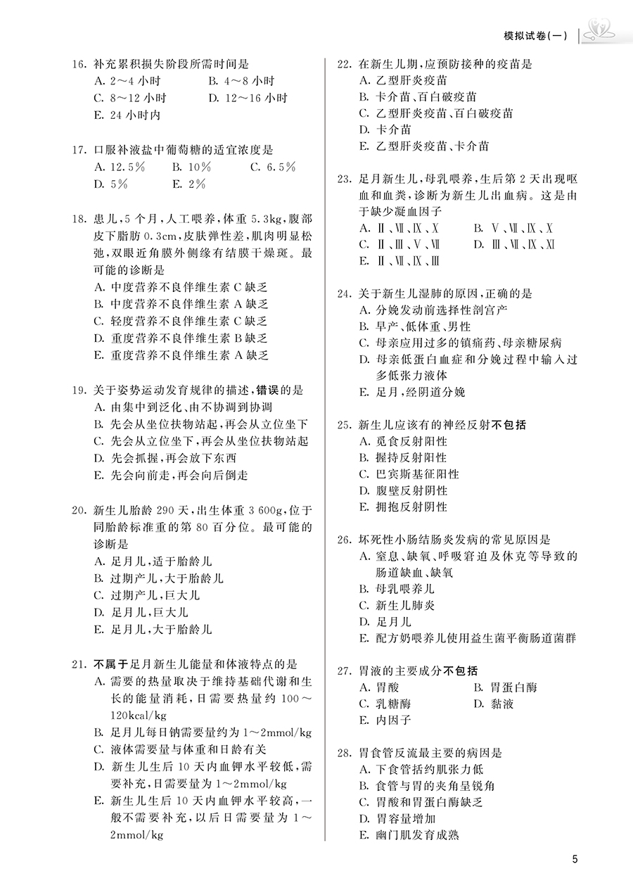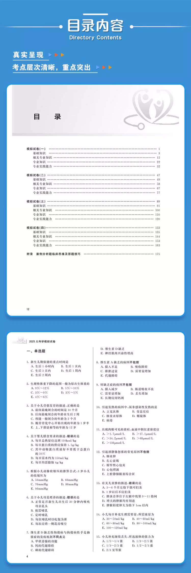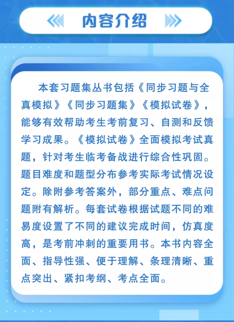 “全国卫生专业技术资格考试习题集丛书”以最新考试大纲和全国卫生专业技术资格考试用书编写专家委员会编写的考试指导为依据,编写工作遵循科学、严谨、客观、规范的原则,严格按照实际考试的科目划分和题型分布进行编写,切实考查考生对知识点的掌握程度和专业水平。本套习题集丛书包括《同步习题与全真模拟》《同步习题集》《模拟试卷》,能够有效帮助考生考前复习、自测和反馈学习成果。《模拟试卷》全面模拟考试真题,针对考生临考备战进行综合性巩固。题目难度和题型分布参考实际考试情况设定。除附参考答案外,部分重点、难点问题附有解析。每套试卷根据试题不同的难易度设置了不同的建议完成时间,仿真度高,是考前冲刺的重要用书。