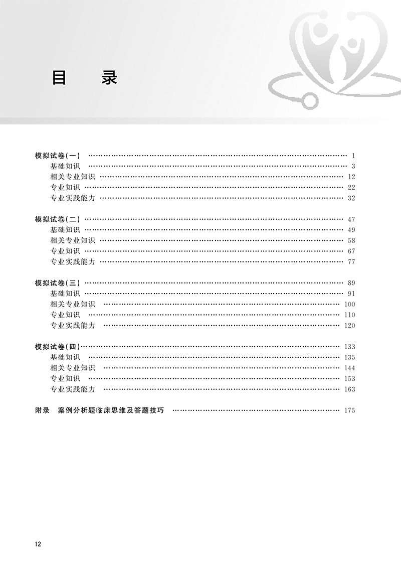 模拟试卷(一) / 1 基础知识 / 3 相关专业知识 / 12 专业知识 / 22 专业实践能力 / 32 模拟试卷(二)/ 47 基础知识 / 49 相关专业知识 / 58 专业知识 / 67 专业实践能力 / 77 模拟试卷(三)/ 89 基础知识 / 91 相关专业知识 / 100 专业知识 / 110 专业实践能力 / 120 模拟试卷(四)/ 133 基础知识 / 135 相关专业知识 / 144 专业知识 / 153 专业实践能力 / 163 附录 案例分析题临床思维及答题技巧 / 175