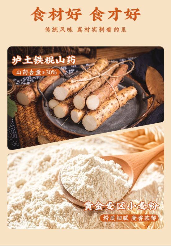 不添加任何色素、食品剂。 山药本身味道软糯恬淡,和黄河原生态小麦粉搭配别具风味。 煮好的面根根分明,不易坨。 独特的选材和极致的制作方式才能造就一碗好吃的面。