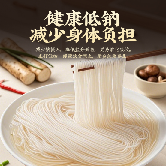 经过精心研磨与科学配比,保留了山药和小麦丰富的营养成分与独特风味。 每一根面条都富含维生素C、多酚氧化酶等16种氨基酸,还有硒、铁、锌、钙等多种微量元素。健脾养胃,汤醇厚,面劲道,每吃一口都是满满的营养 💥低钠的面条为什么好? 💥钠含量只有1%,比普通挂面低50倍 很多人喜欢吃面条,但你可能不知道——大多数面条的钠含量非常高。