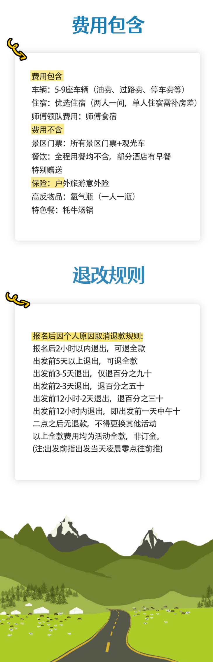 4、关于司机:我们的司机只是司机,行程为纯玩自由行,所以没有导游,没有领队,没有无人机,没有旅拍,行程中均为大家一起商量决定(如果介意的可以另请导游陪同)。如果队友们出现身体不适,请第一时间通知旅行社,旅行社会在第一时间就近送医;