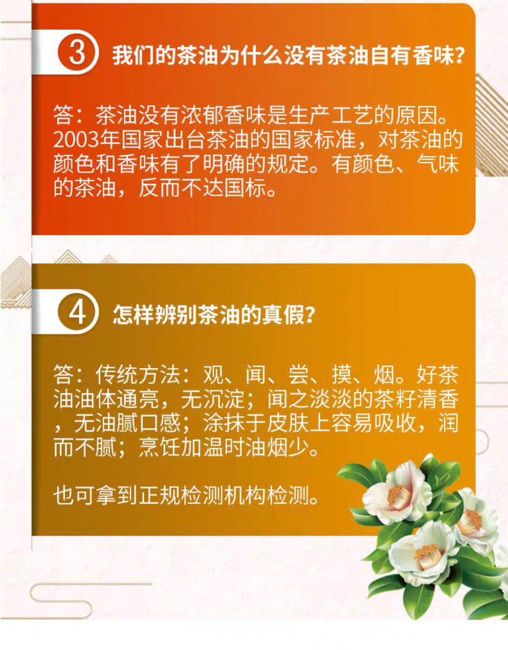 茶油中不含芥酸,胆固醇。经测试:茶油中不饱和脂肪酸高达90%以上,油酸达到80-83%,亚油酸达到7-13%,并富含蛋白质和维生素A、B、D、E等,尤其是它所含的丰富的亚麻酸是人体必需而又不能合