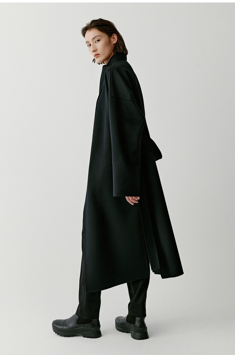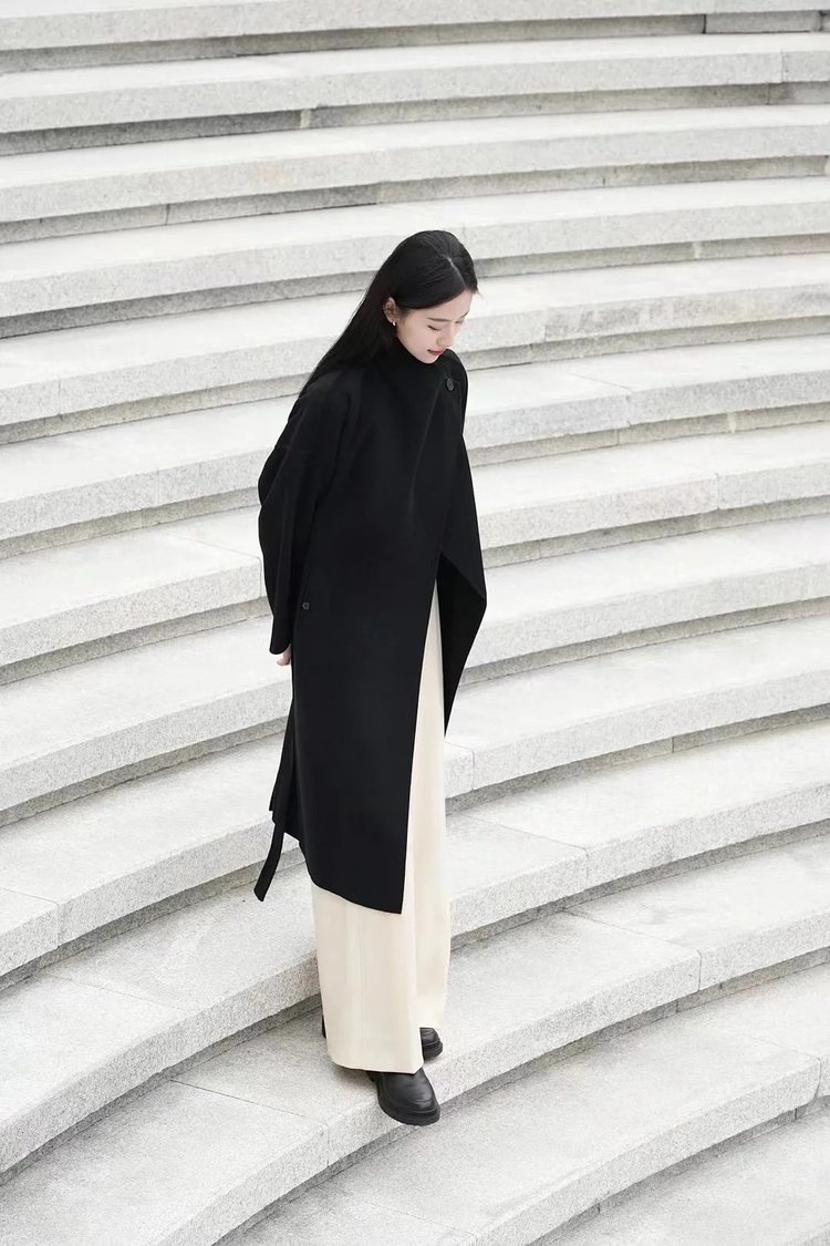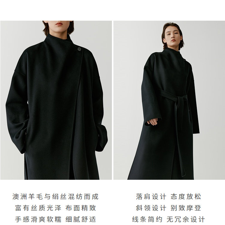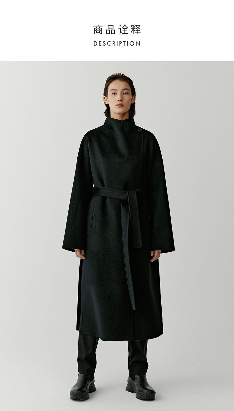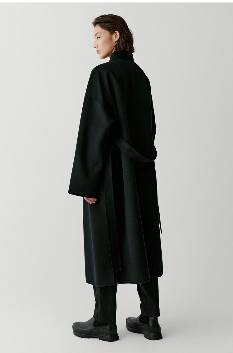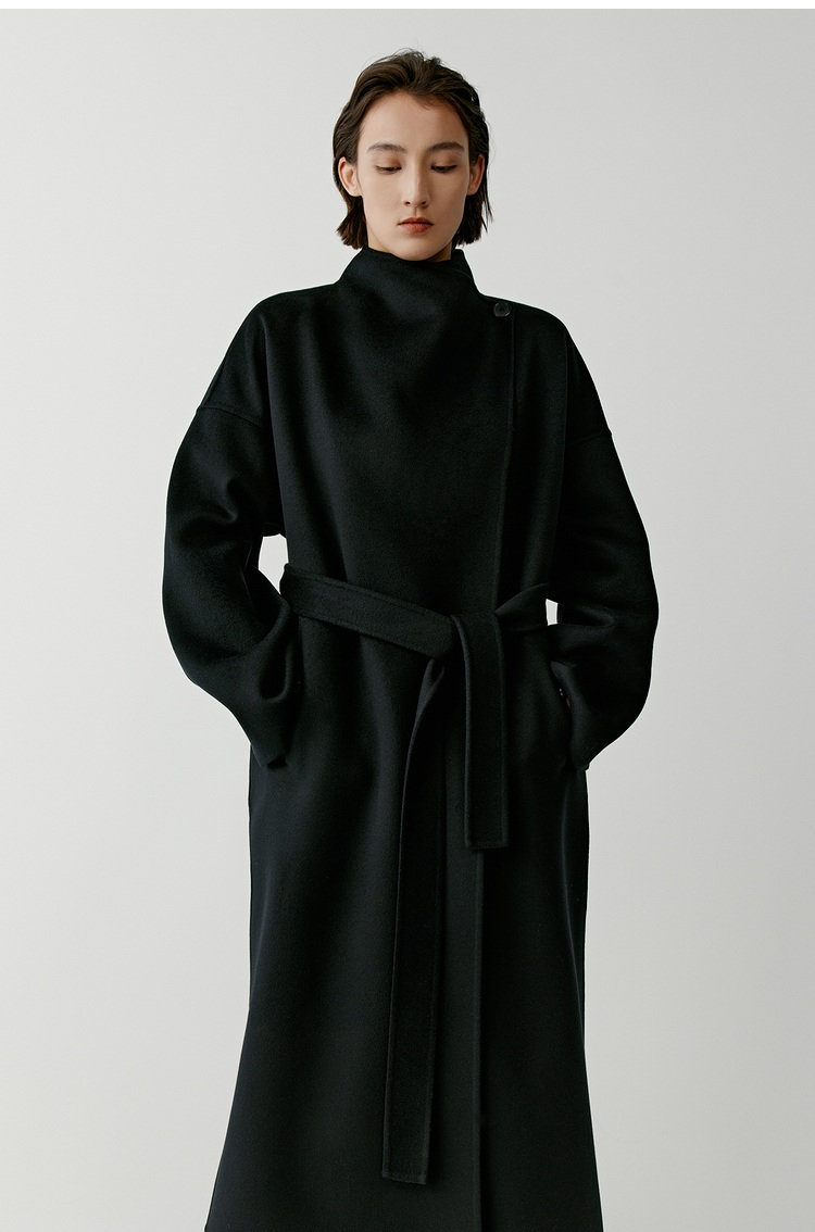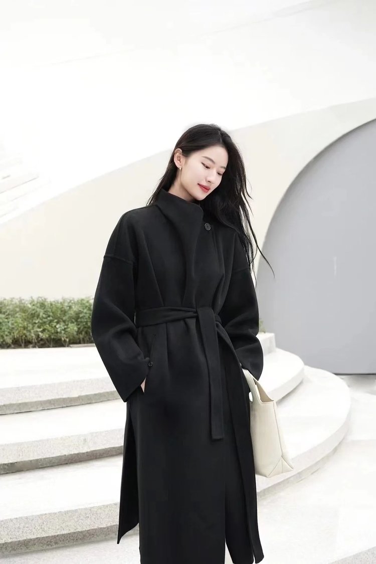 小禾同款"黑骑士大衣”绢丝羊毛双面呢系带大衣