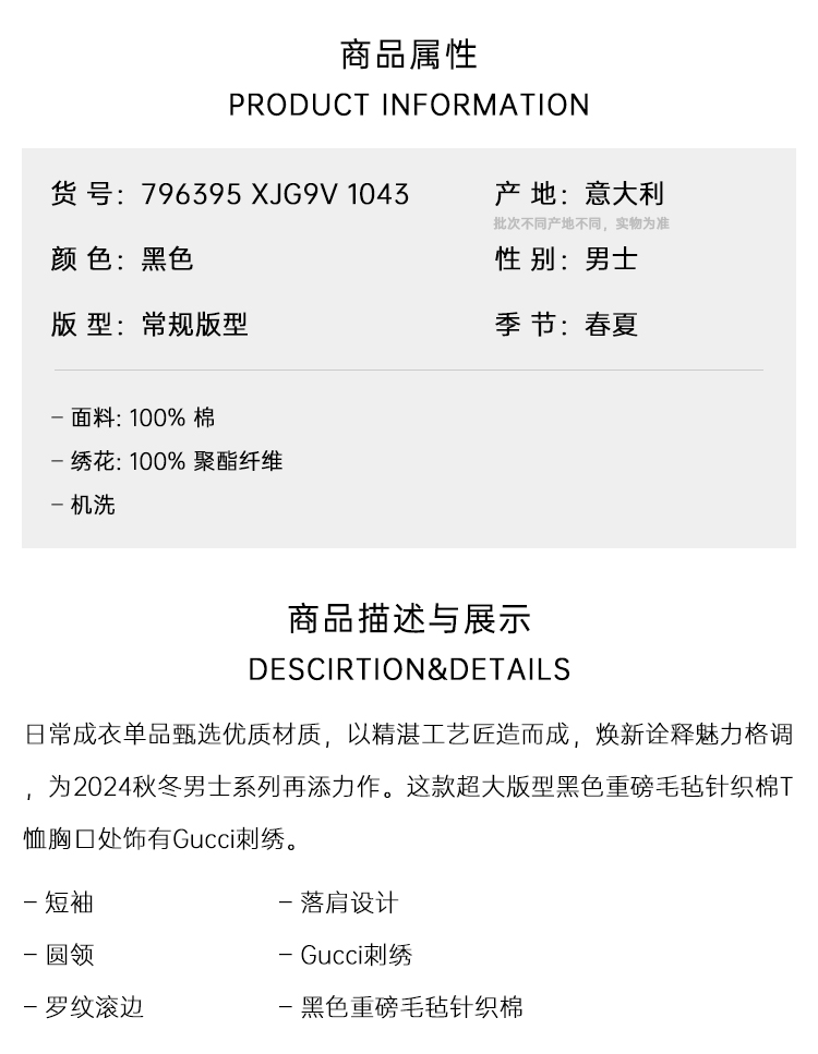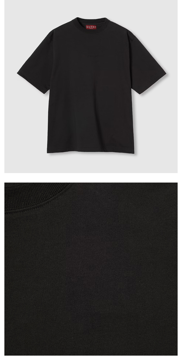 GUCCI 古驰 男士饰刺绣针织棉圆领短袖T恤 黑色 796395 XJG9V 1043