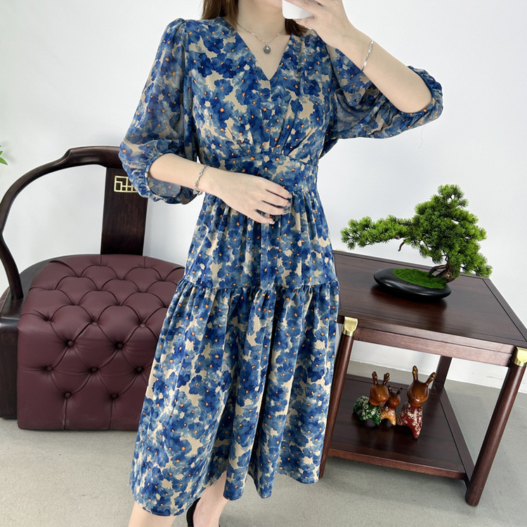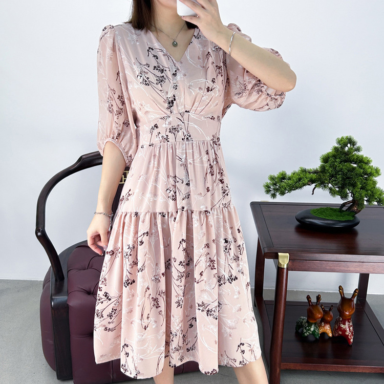 【清仓超15天不保价】奢姿大码女装2024夏季减龄印花V领连衣裙胖妹妹五分袖时尚裙子10442867026
