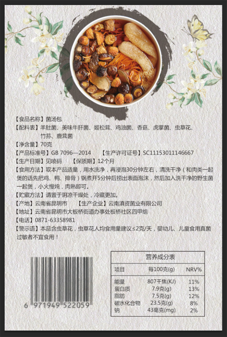 菌汤包内包含羊肚菌、美味牛肝菌、冻干虎掌菌、竹荪、姬松茸、鹿茸菌、鸡油菌、香菇、虫草花。混合了菌类的精华,体现了菌类的鲜香美。