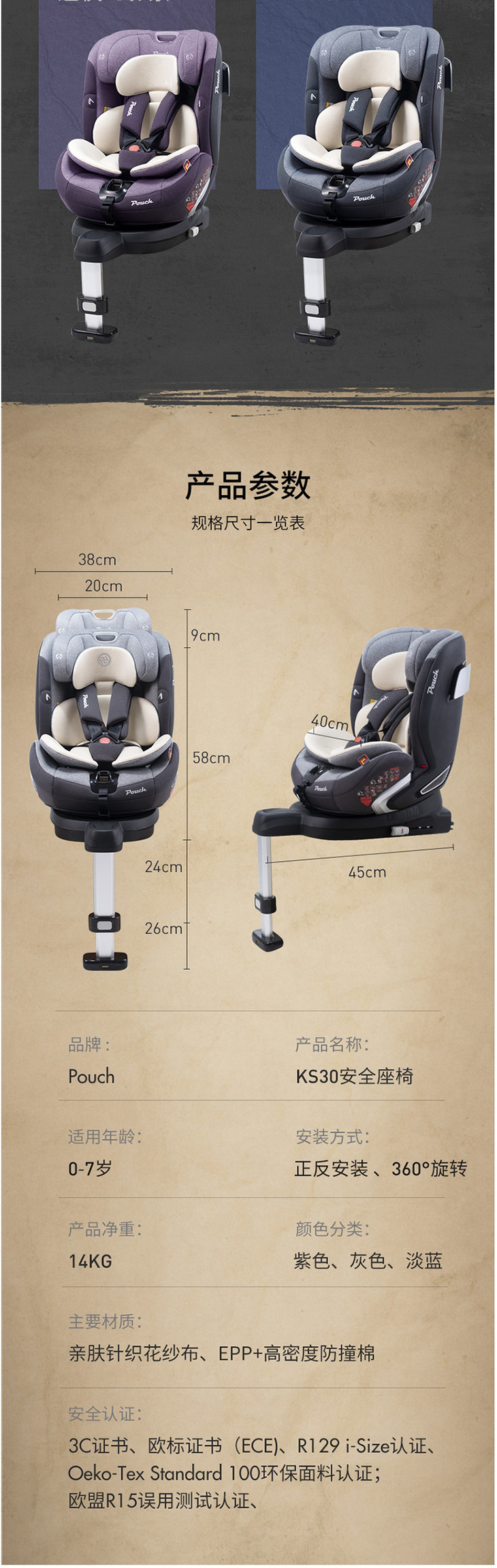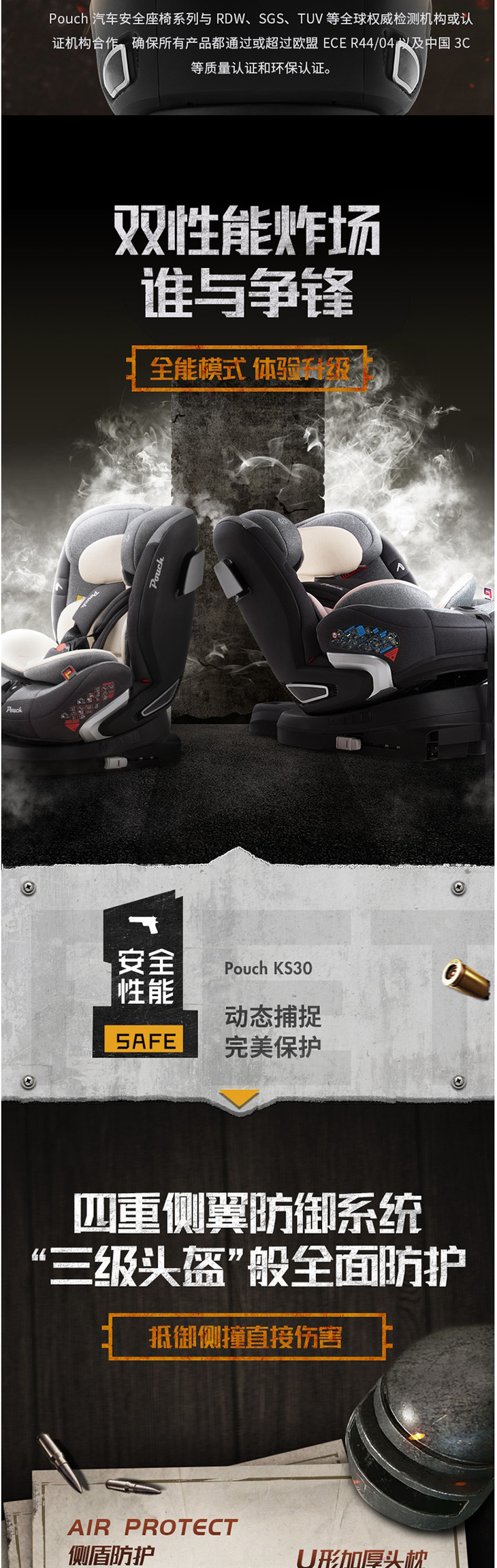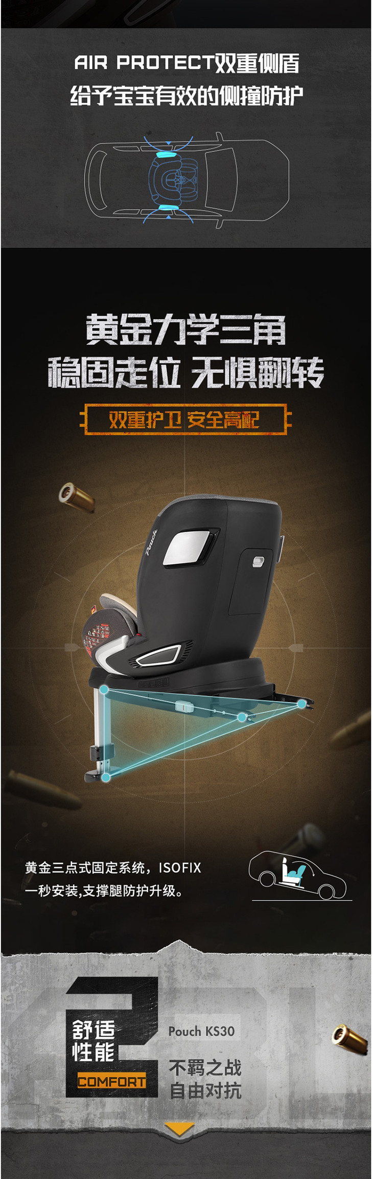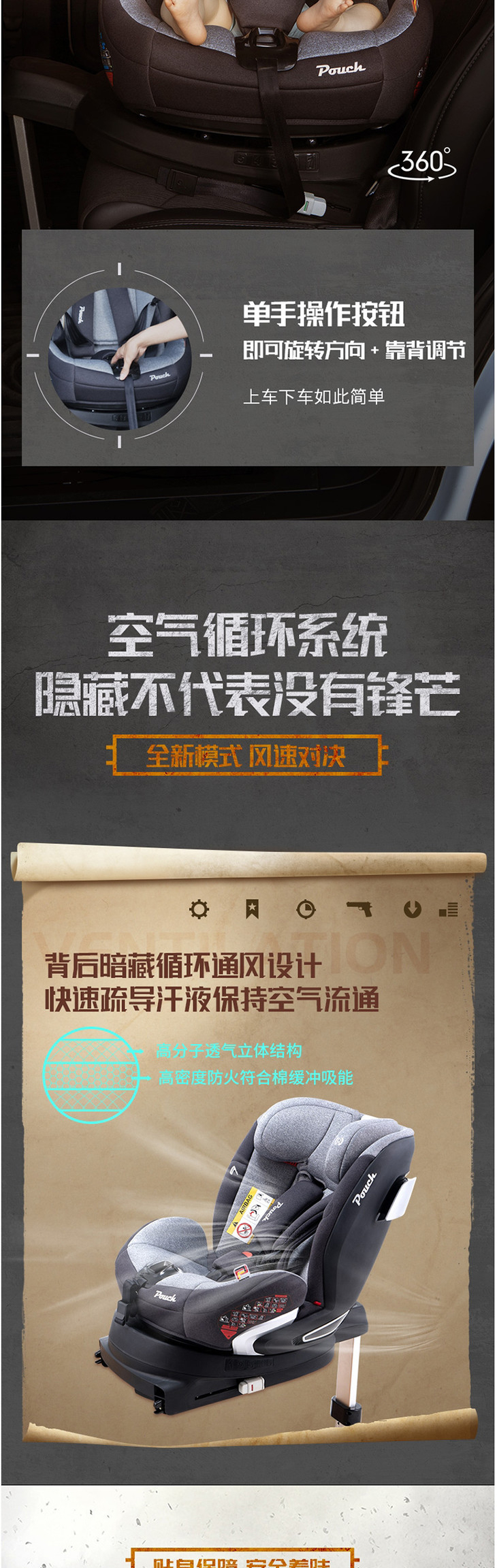PouchKS30儿童安全座椅婴儿360度旋转0-7岁宝宝婴儿一体注塑汽座FX