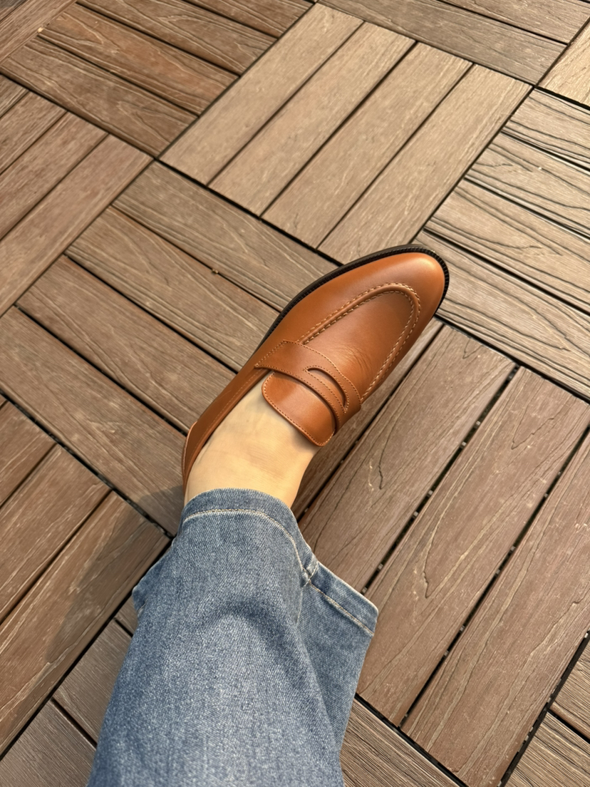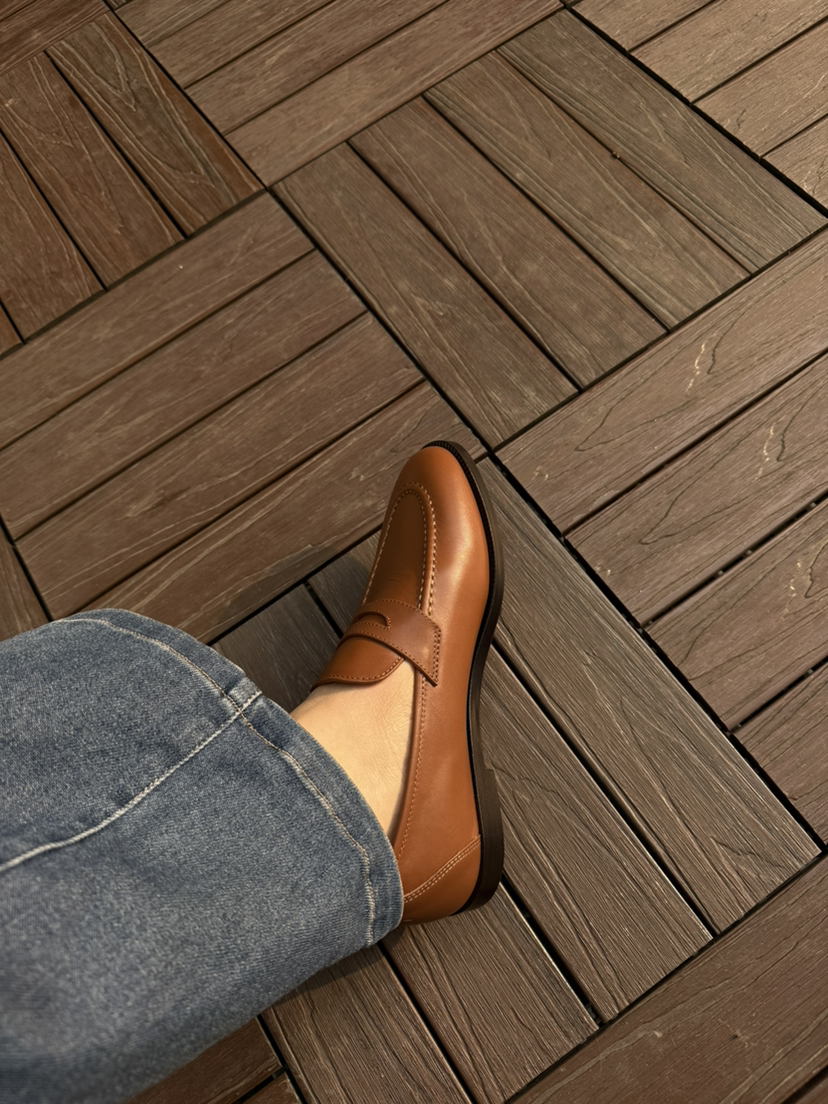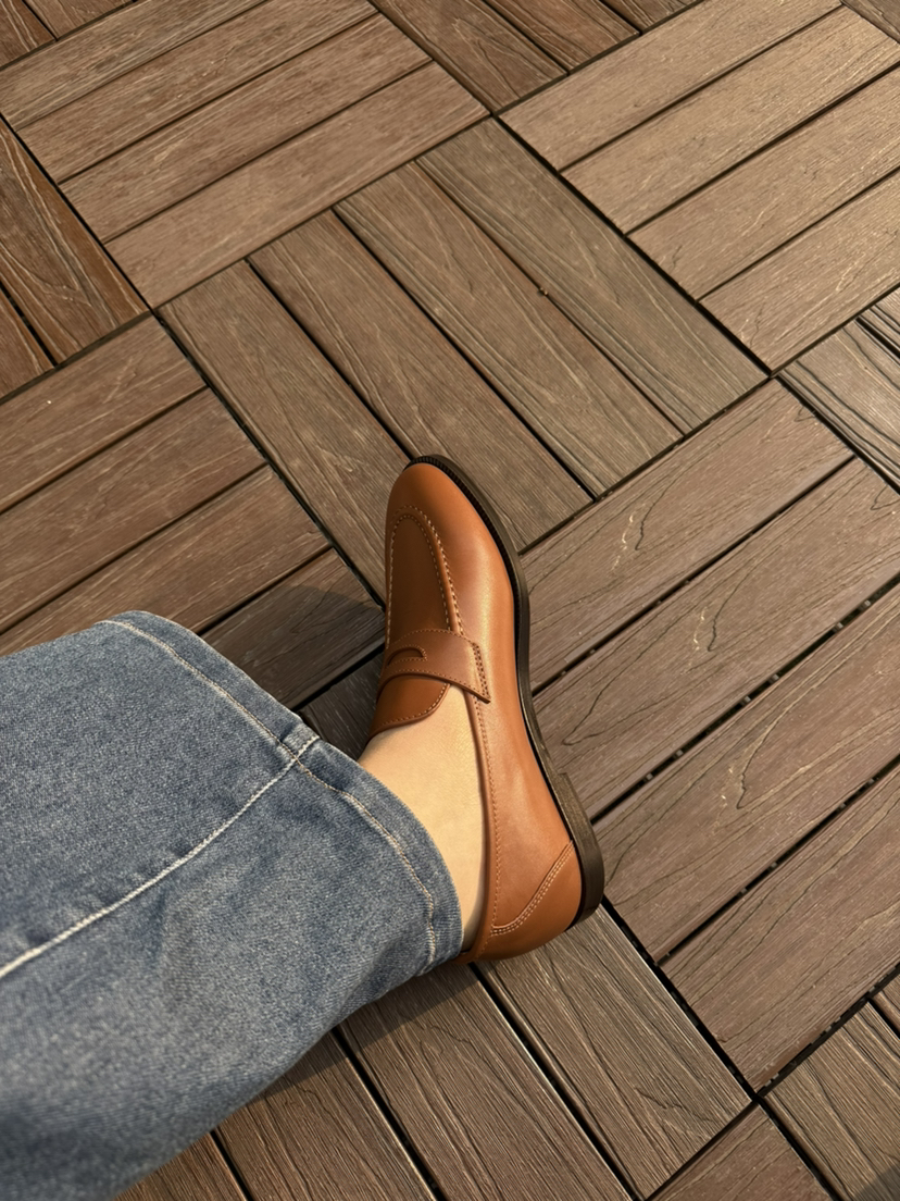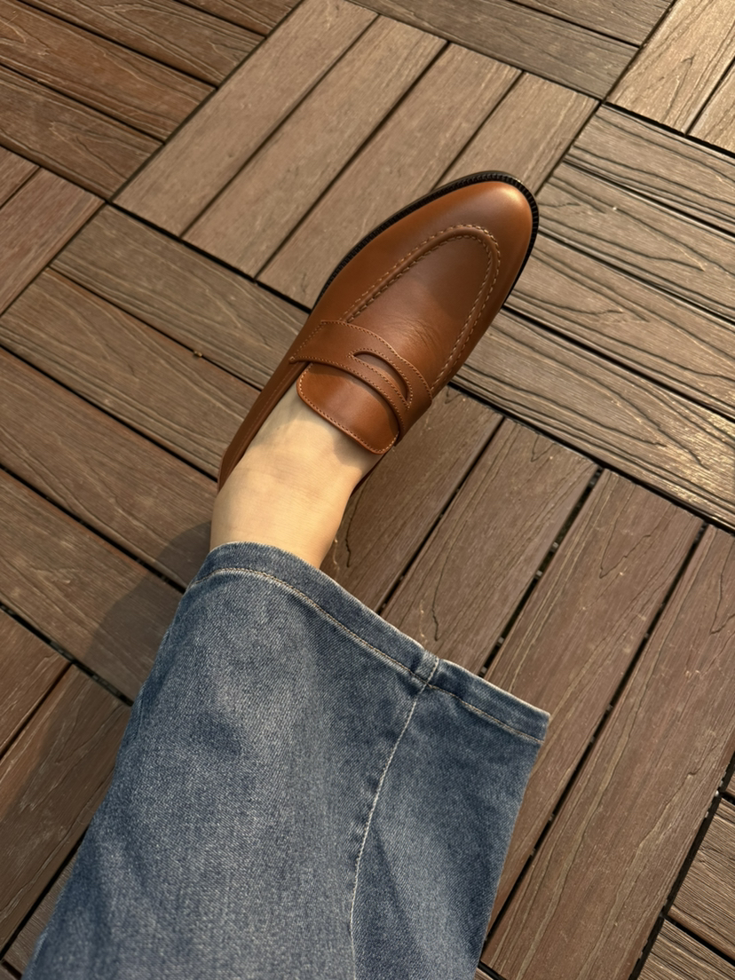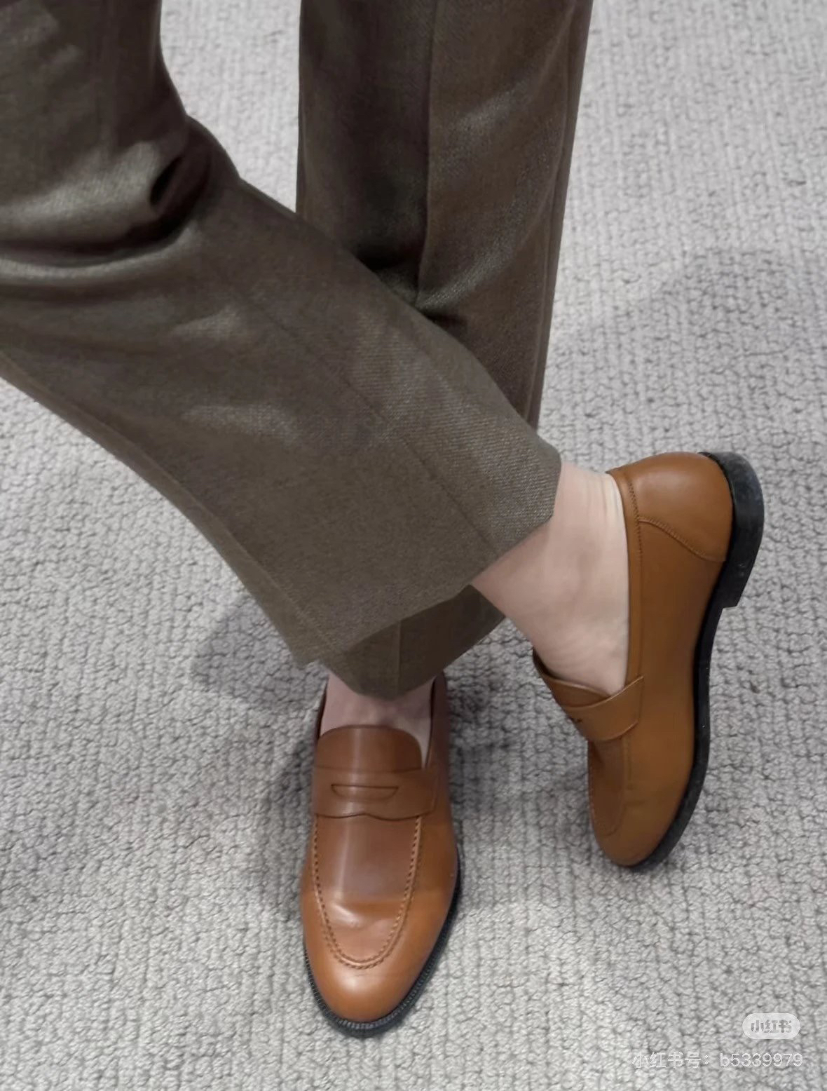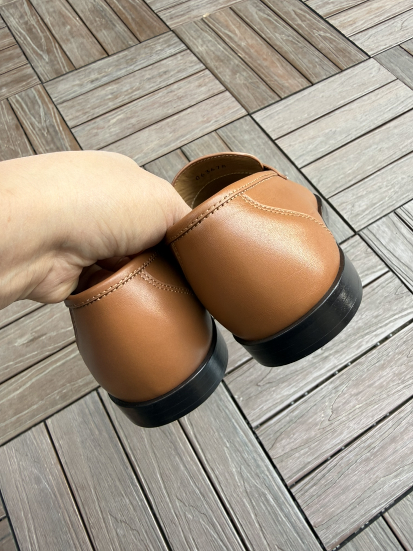 LP高端乐福鞋,看着生硬立体,是秀气的贵妇乐福鞋没错。摸上去比较硬朗,但就是这么个恰到好处柔软度,有立体感硬朗线条的柔软度,凭借卓越楦型,让你上脚,就像滑进去一样,无与伦比楦型,穿上就是手工定制的皮鞋一样,看着秀气,穿进去宽松,脚丫子一滑就穿进去了,穿进去之后,虽然尖头,也不挤前掌,也不压脚背,舒适无比,你看我的逆天肥脚,穿进去秀气多了。建议选大半码,或者肥宽脚丫卡码选大。我36.5肥脚穿37,感觉量脚定制。内外底,全皮。