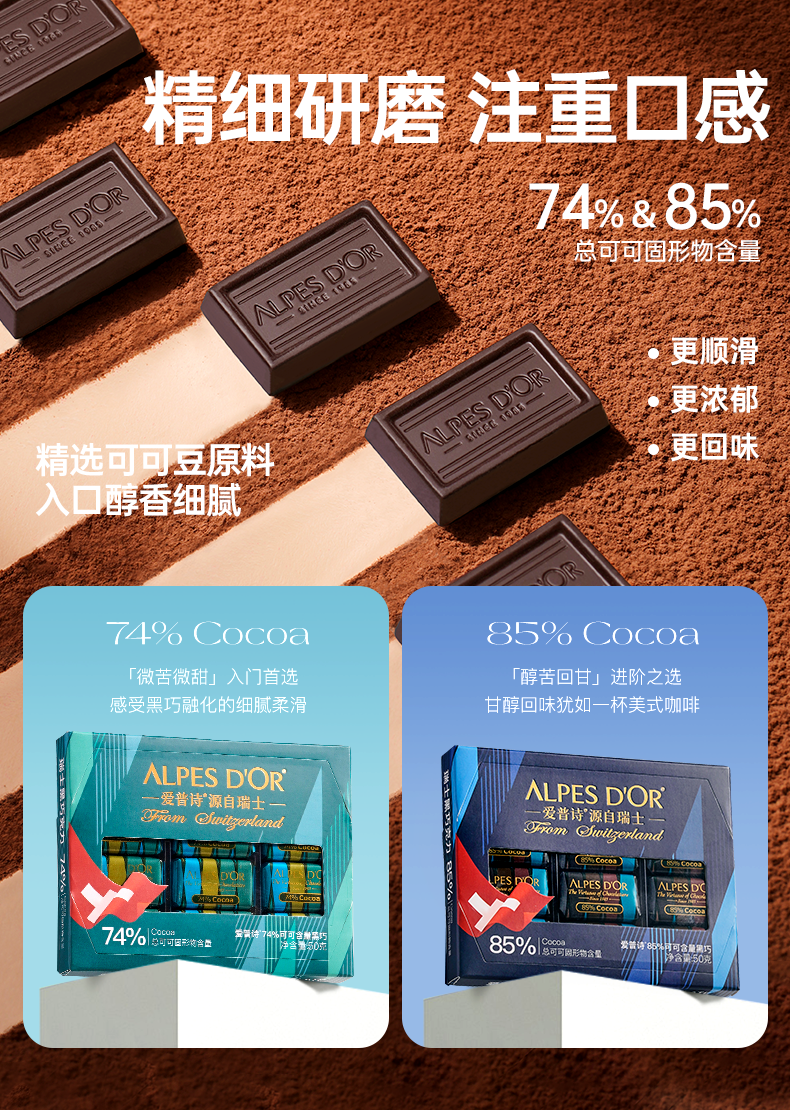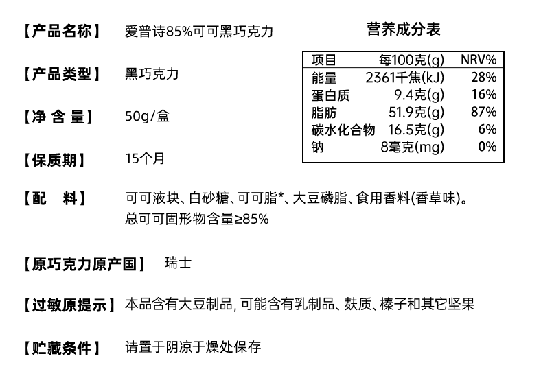 爱普诗85%可可黑巧克力50g/045417 好吃 轻腹担 随时解馋美味体验