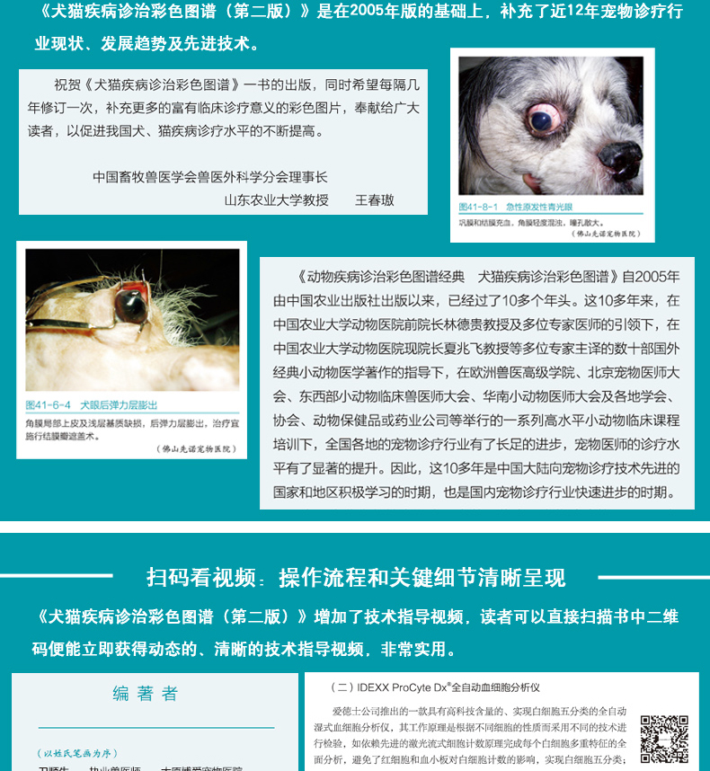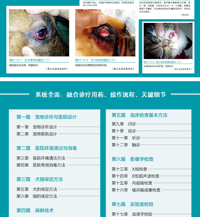 全书分为十三篇五十章,第一篇介绍宠物诊所和医院的布局与设计,第二篇介绍宠物诊所和医院环境的清洁消毒方法,第三篇至第八篇依次介绍犬猫保定方法、麻醉技术、临床诊断基本方法、影像学诊断、实验室检验与常用治疗技术,但与传统教材或参考书的描述有所不同,而是侧重于介绍诊疗实际流程和操作细节及要点、当前主流仪器设备及其特点,弥补了各类教材中的空白或不足;从第九篇至第十三篇开始,依次介绍临床多发的犬猫传染性疾病、体内寄生虫病、内科疾病、外科疾病与皮肤病等内容。