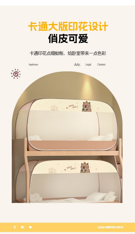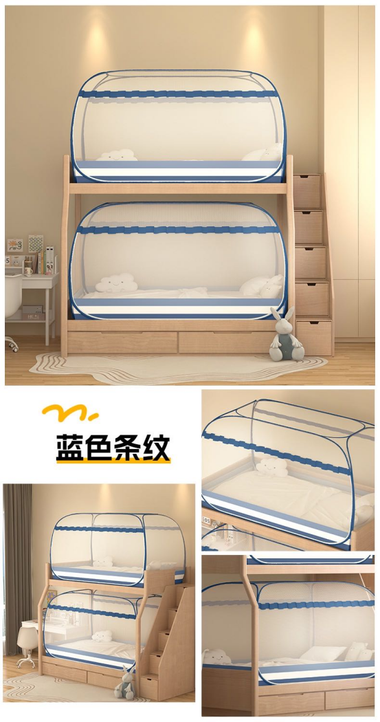 高密网纱:透气防蚊(A类标准),兼顾清凉与防护。 底部固定设计:可搭配绑带,贴合床垫不移位。 双门开合:进出方便不卡顿。