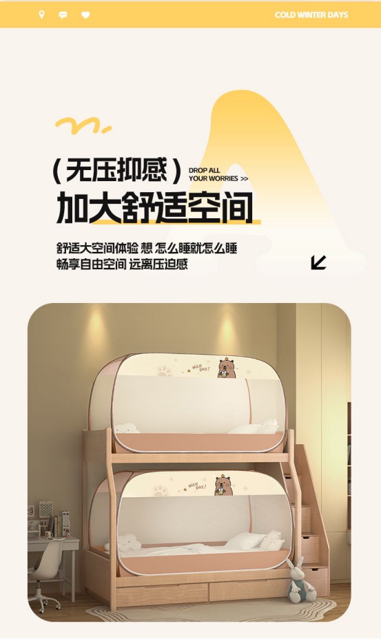 一体成型工艺,加大蒙古包设计,留有充足的活动空间,没有压抑感,放松的环境更易入睡。