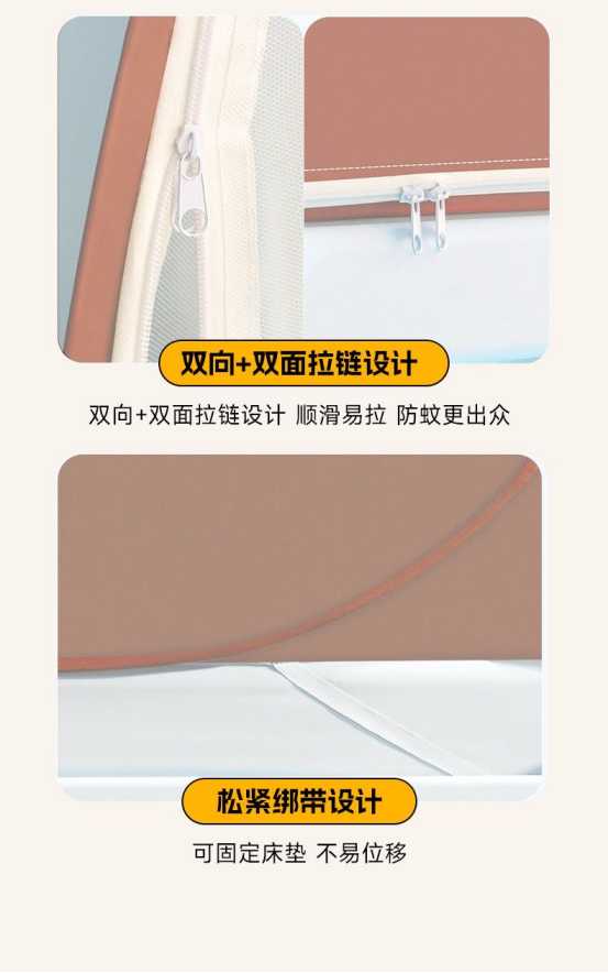 360°立体防护:垂直侧边+顶部全覆盖,防蚊无死角。 底部全密封:加密布料或防滑夹层,防蚊虫从底部侵入。 弹性纤维支架:柔韧支撑,回弹性强,抗挤压不变形。