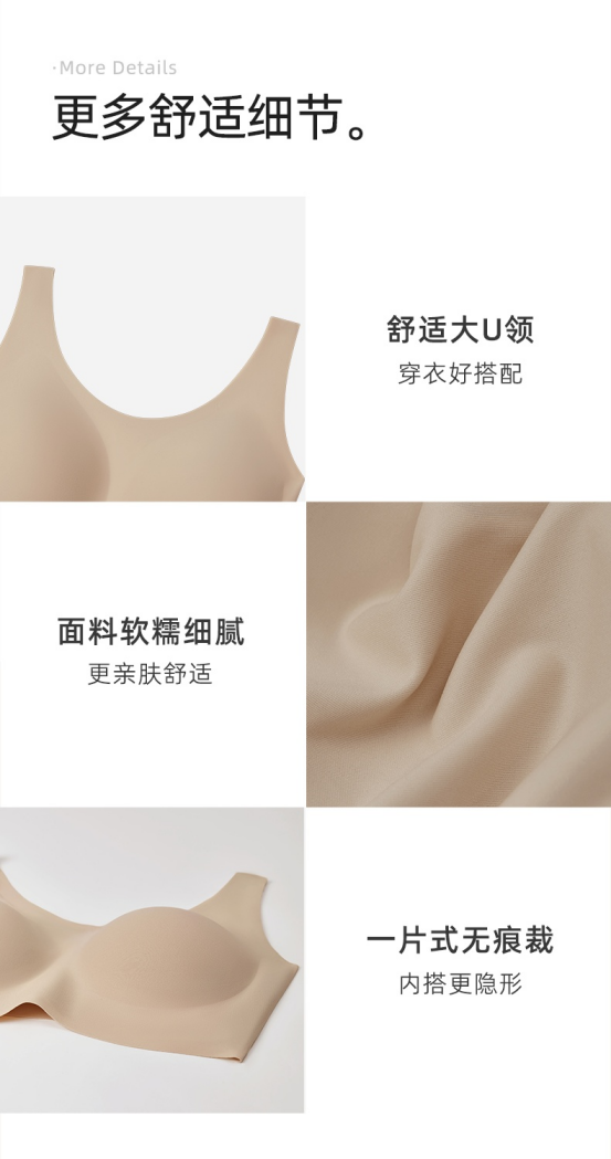 无痕裸感贴合身形,高弹舒适,告别勒痕,毫无束缚感; 舒适有型不跑杯,专为亚洲女性设计的立体杯垫,胸型自然好看 加大覆盖面设计,增加包容度穿的更安心,70-90的底围,A-D杯都能穿