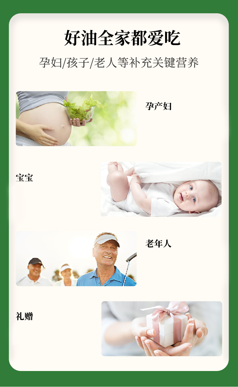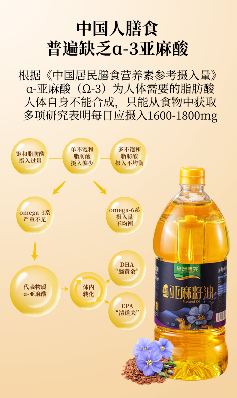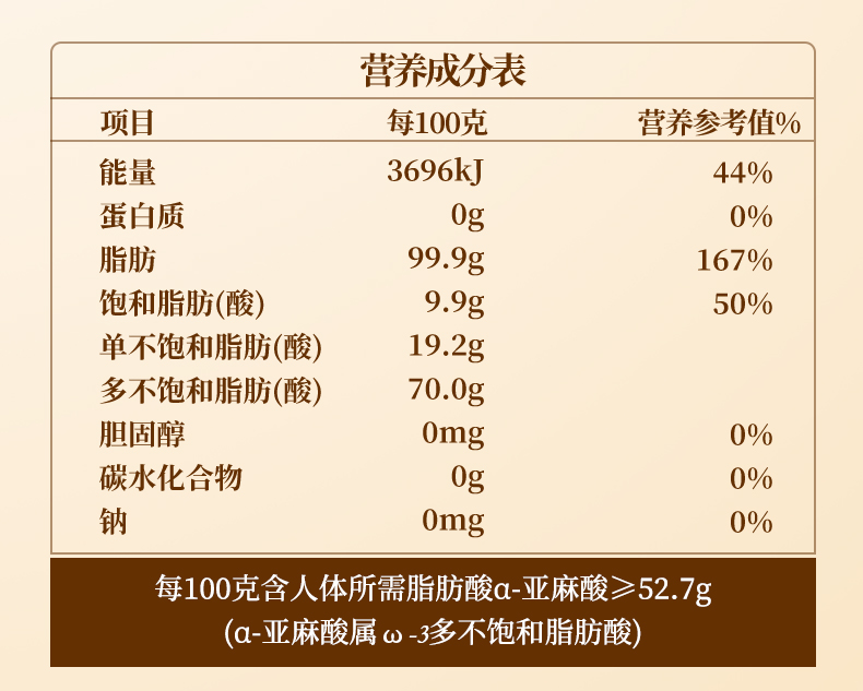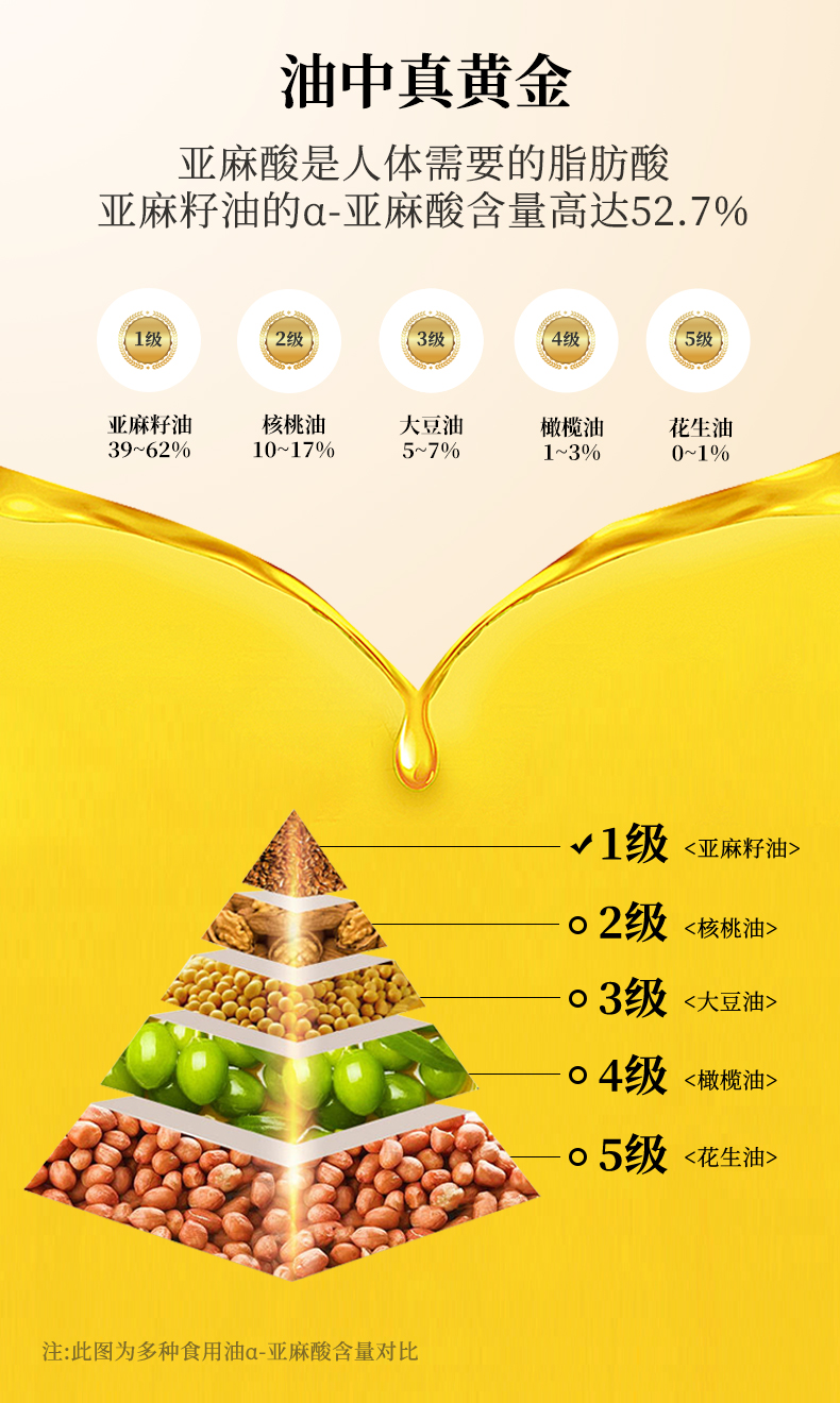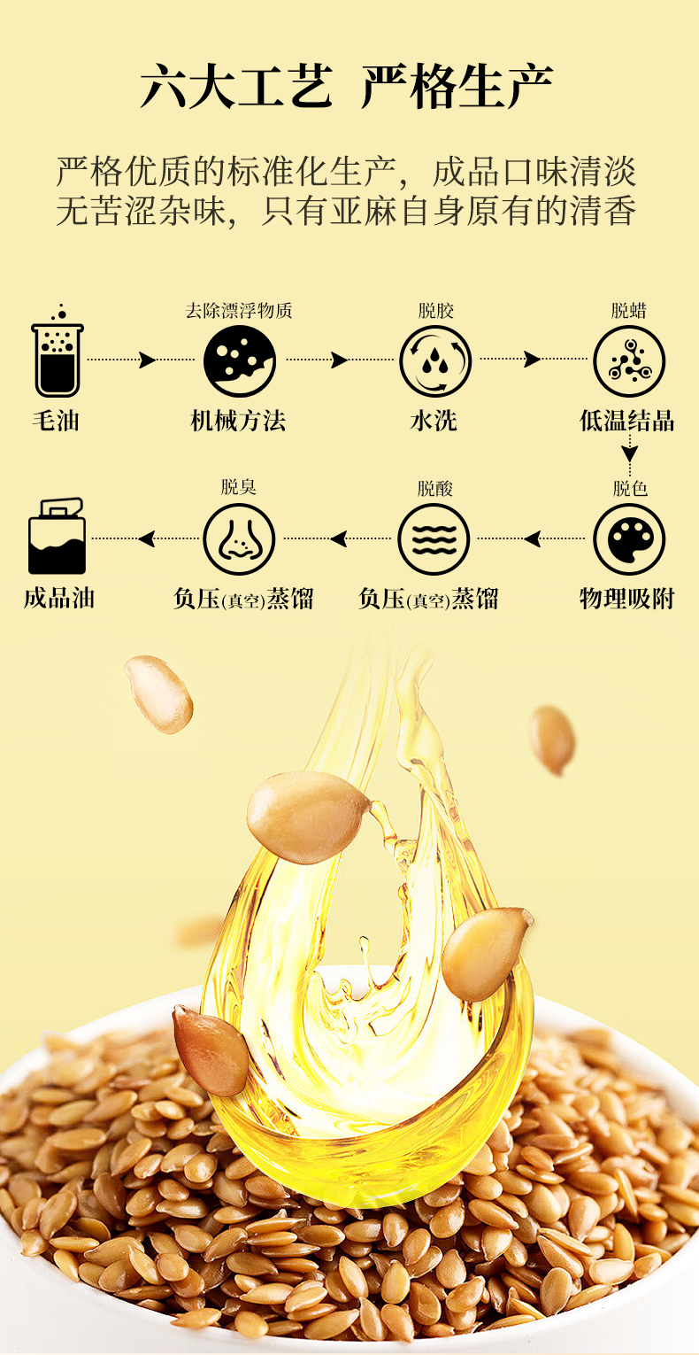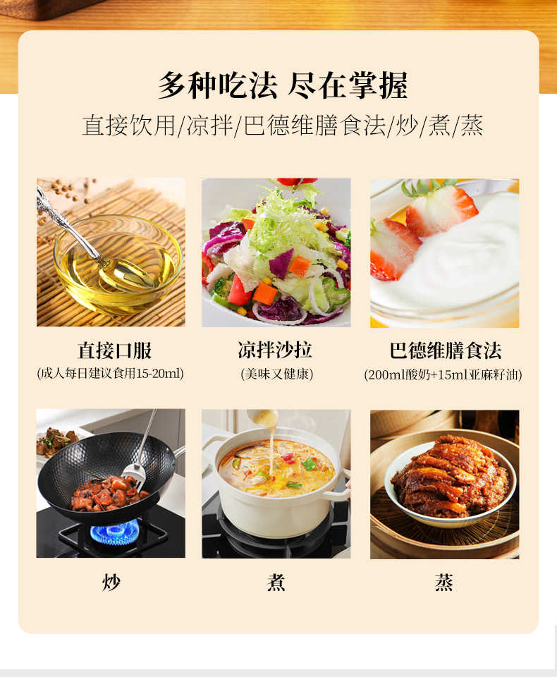 【温馨提示】食用方法:凉拌、煲汤、调味、烹饪;建议热锅凉油,减少亚麻酸挥发,不建议煎炸食用。可与酸奶1:10直接混合口服。