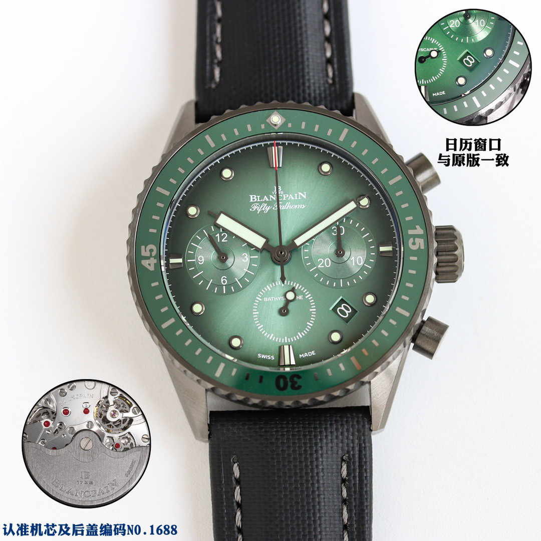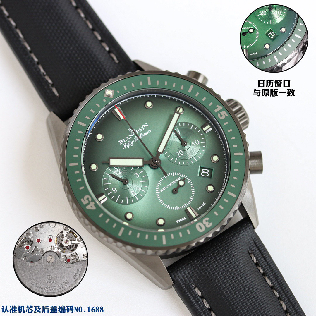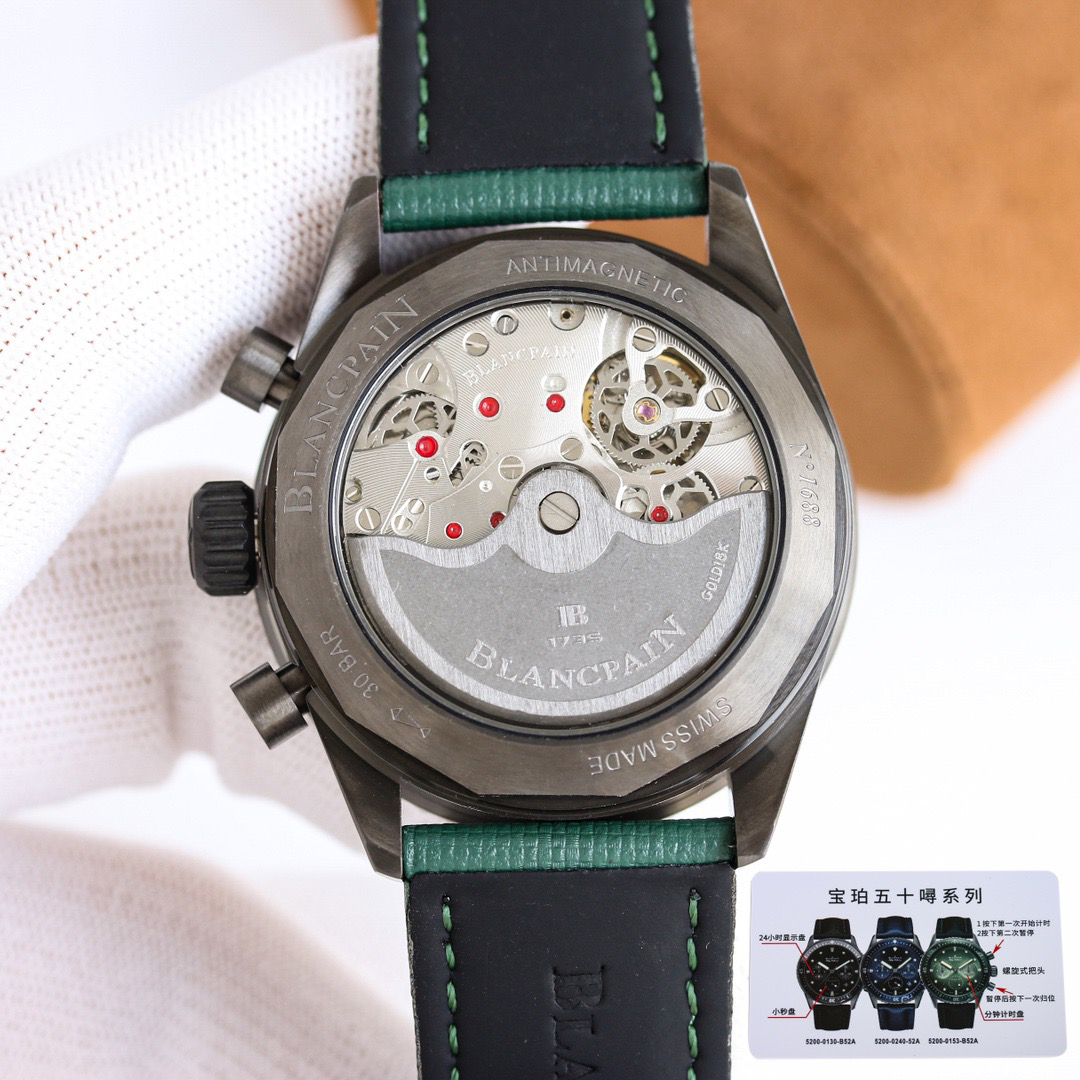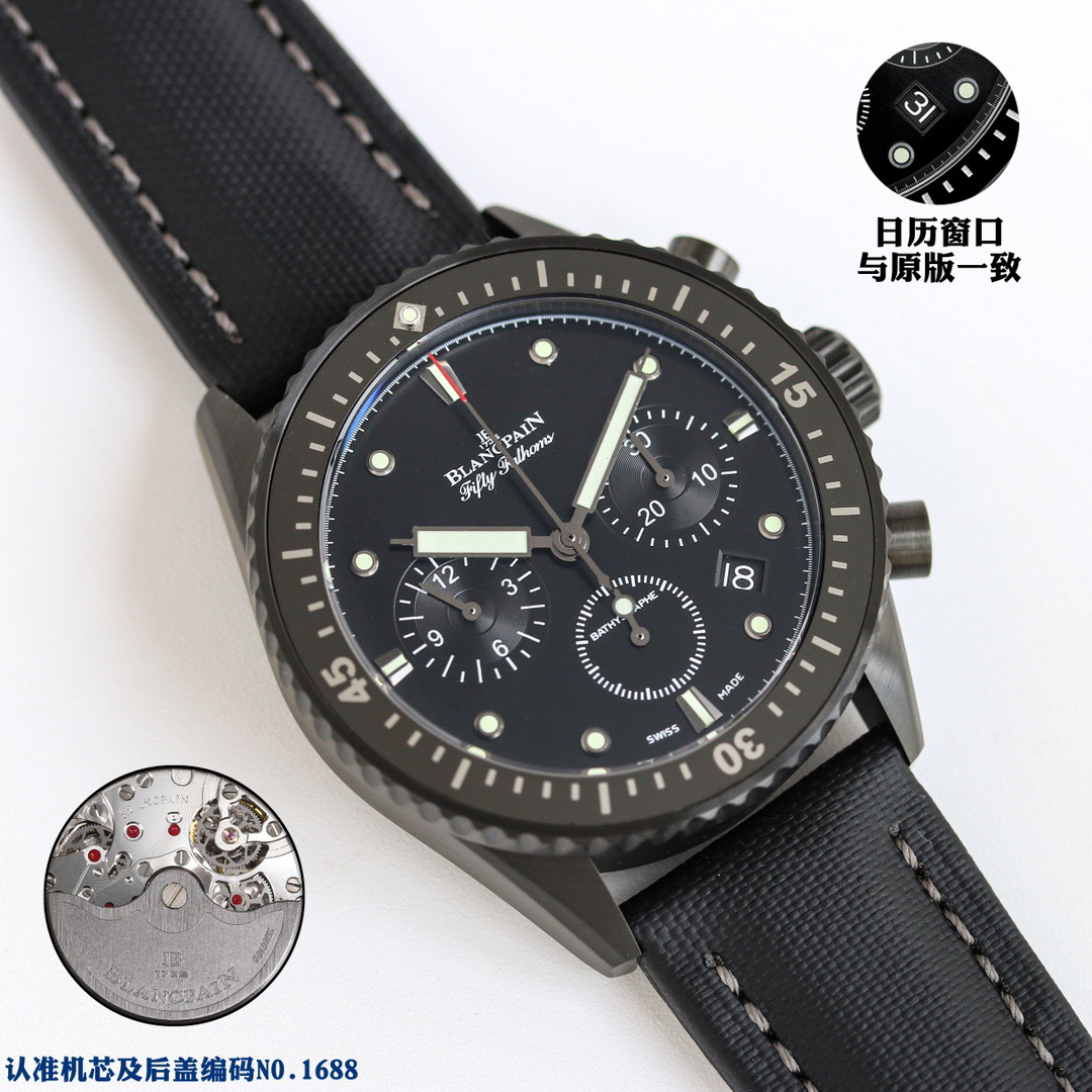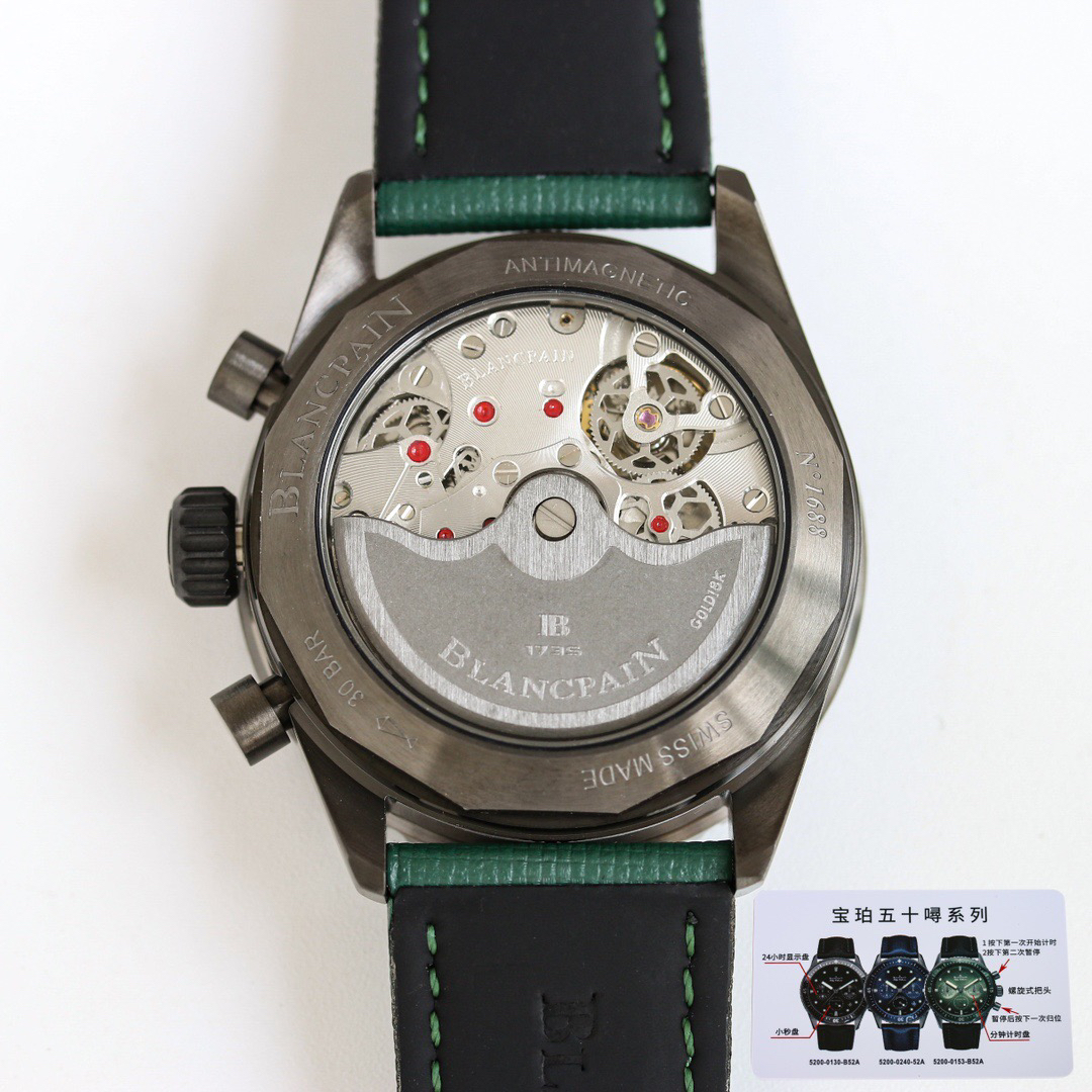 【毒物】宝珀五十噚系列5200-0153-B52A深潜器飞返计时码表问世了,低调中彰显不凡,采用进口泛蓝光蓝宝石玻璃,刀刮不留痕。腕表采用进口7750机芯改原版F385自动机械*日历窗口大小颜色与机芯功能完全对版专柜。直径:43.60mm。夹板宝石轴承颜色与原装一致,真正做到色泽纯良,让夹板不再一眼假!一体式夹板,除了外观更接近原装之余还能更好的保护机芯,质量更稳定!夹板经过研磨处理之后再做倒角加工,历时12个月慢工细琢只为了避免夹板的铜屑跌落机芯而导致机芯偷停。【表盘】日历大小对版,100%瑞士进口C3夜光,亮度持久度直逼原装正品!【防水】出厂100%三度防水测试。The customized version is the only version available in the market.