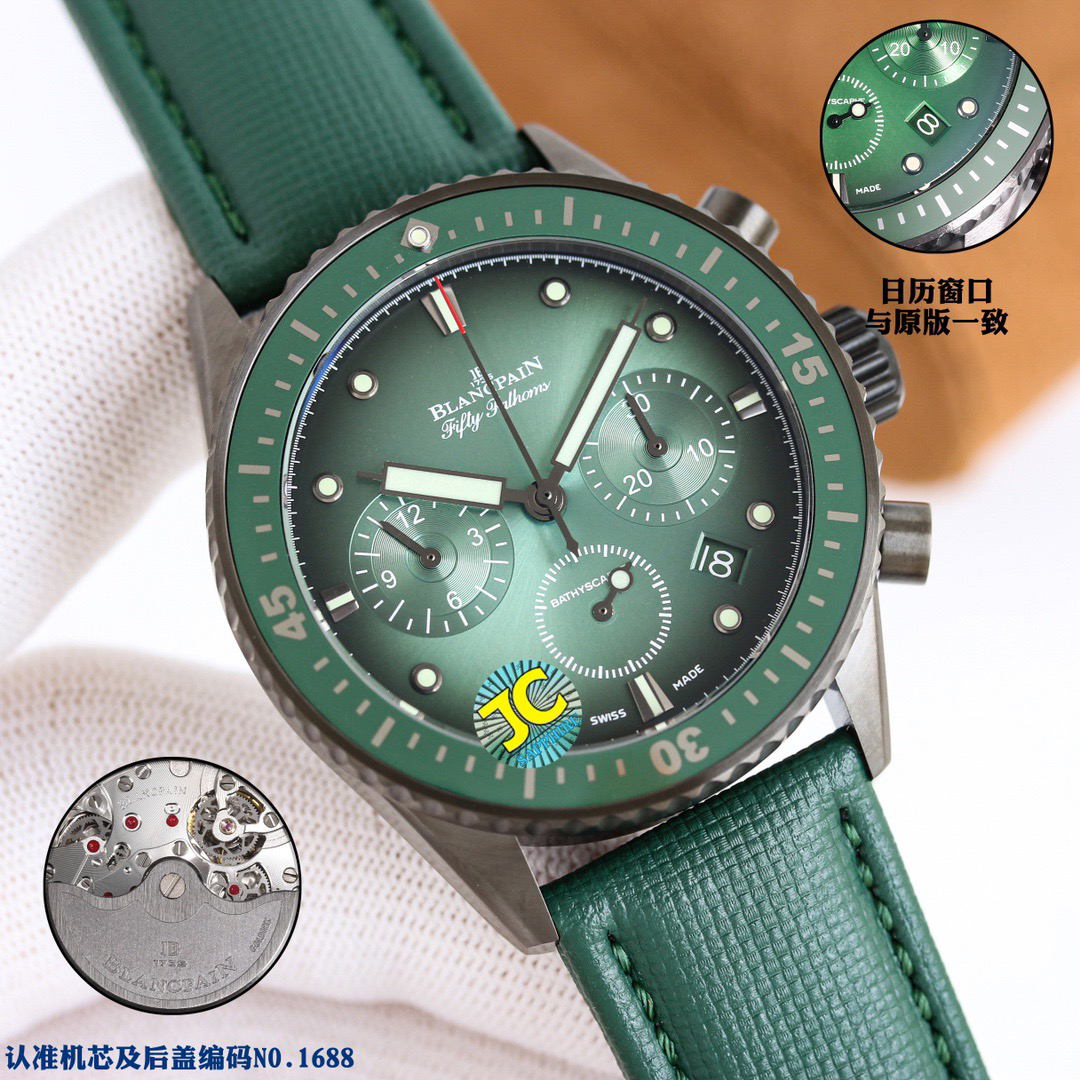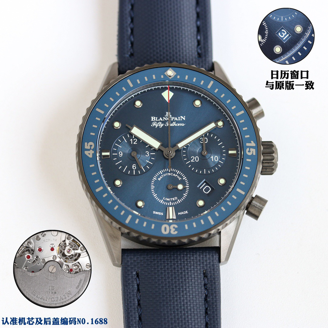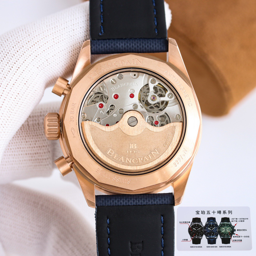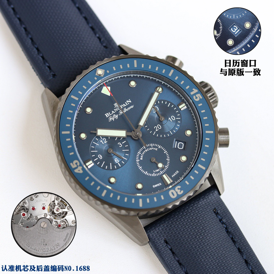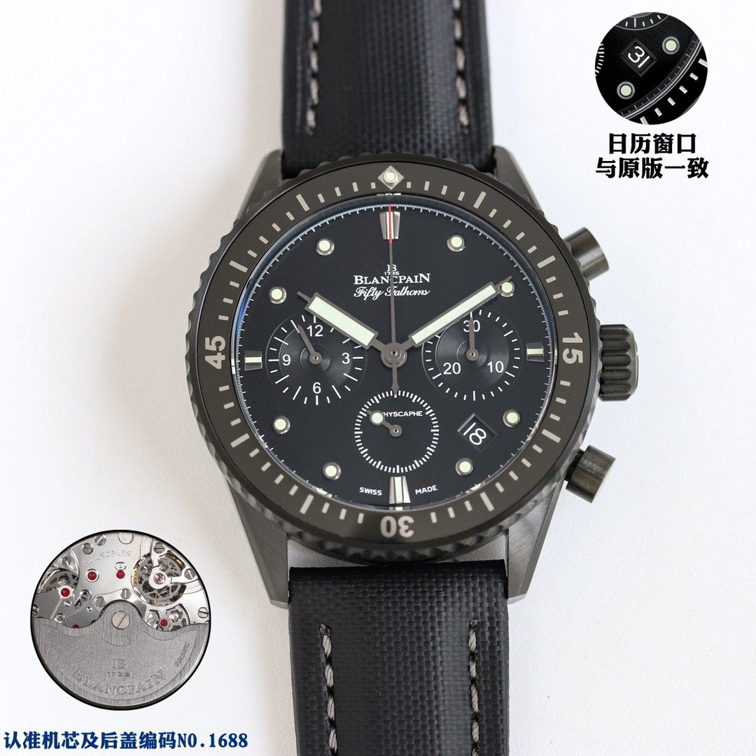 【毒物】宝珀五十噚系列5200-0153-B52A深潜器飞返计时码表问世了,低调中彰显不凡,采用进口泛蓝光蓝宝石玻璃,刀刮不留痕。腕表采用进口7750机芯改原版F385自动机械*日历窗口大小颜色与机芯功能完全对版专柜。直径:43.60mm。夹板宝石轴承颜色与原装一致,真正做到色泽纯良,让夹板不再一眼假!一体式夹板,除了外观更接近原装之余还能更好的保护机芯,质量更稳定!夹板经过研磨处理之后再做倒角加工,历时12个月慢工细琢只为了避免夹板的铜屑跌落机芯而导致机芯偷停。【表盘】日历大小对版,100%瑞士进口C3夜光,亮度持久度直逼原装正品!【防水】出厂100%三度防水测试。The customized version is the only version available in the market.
