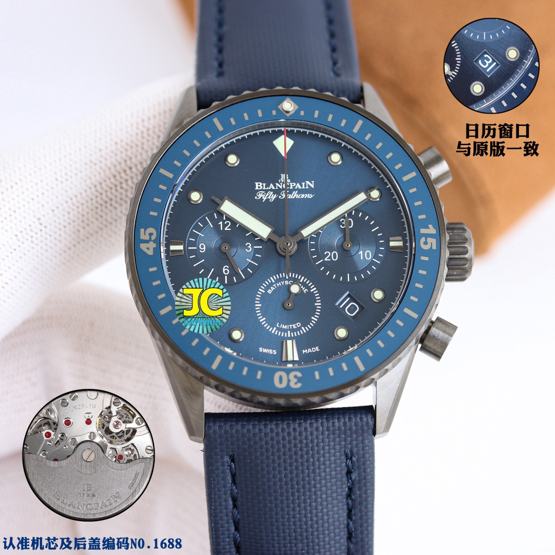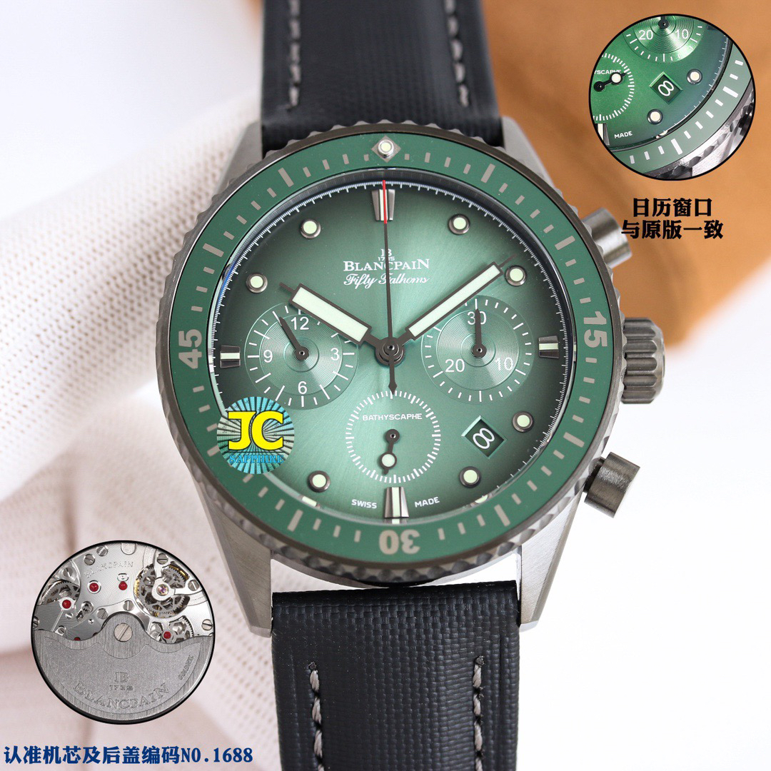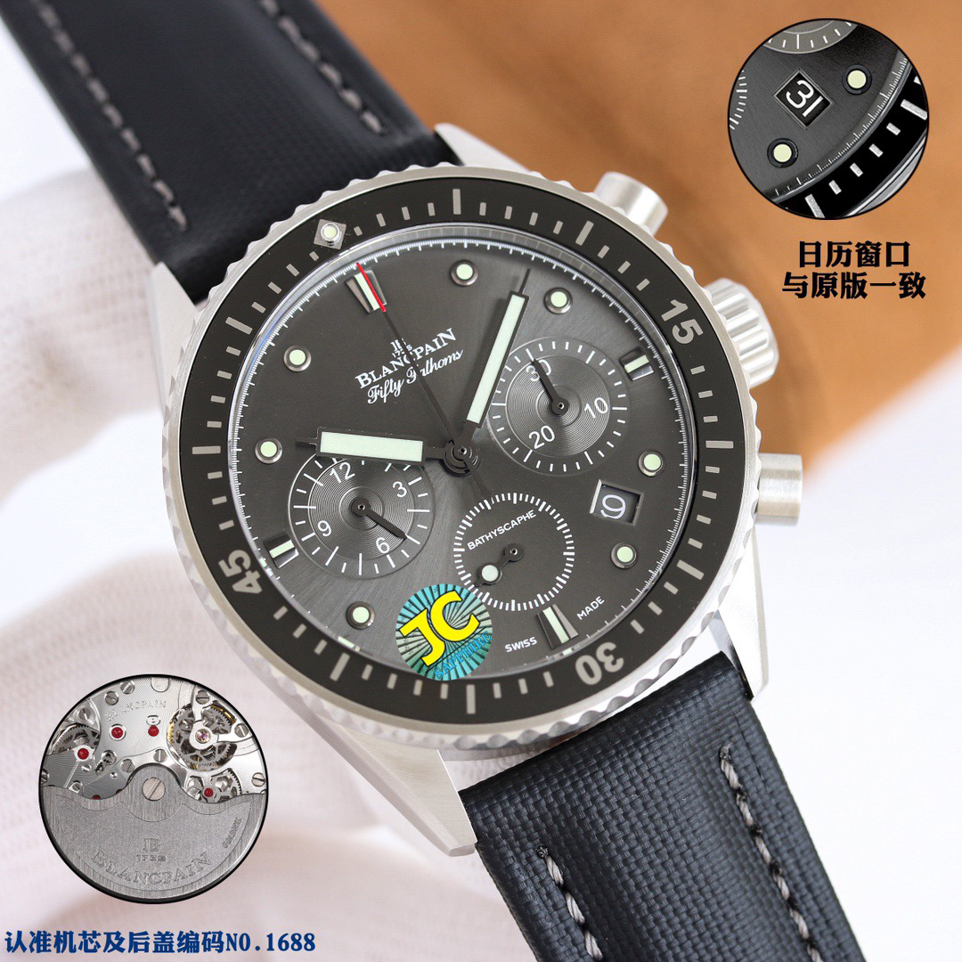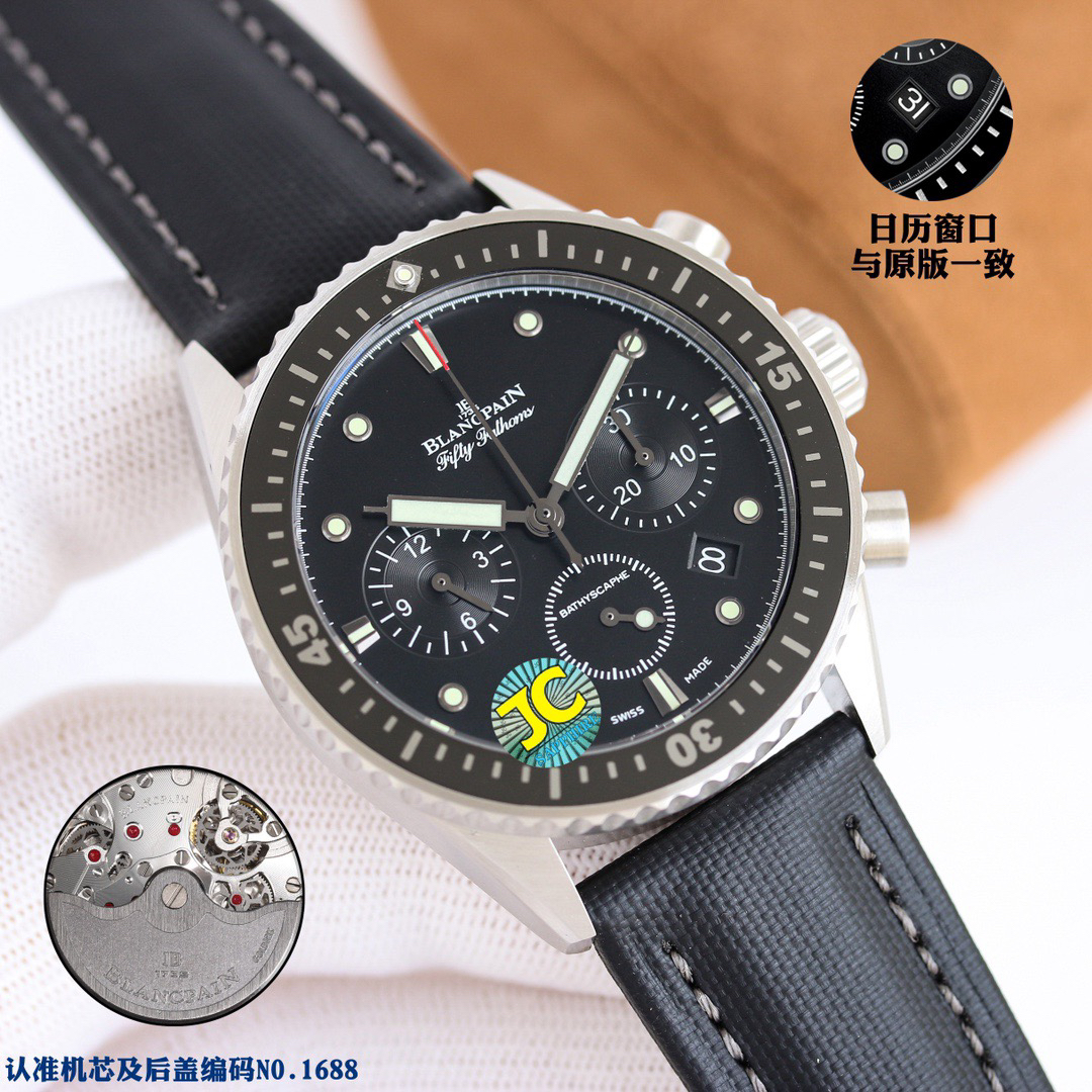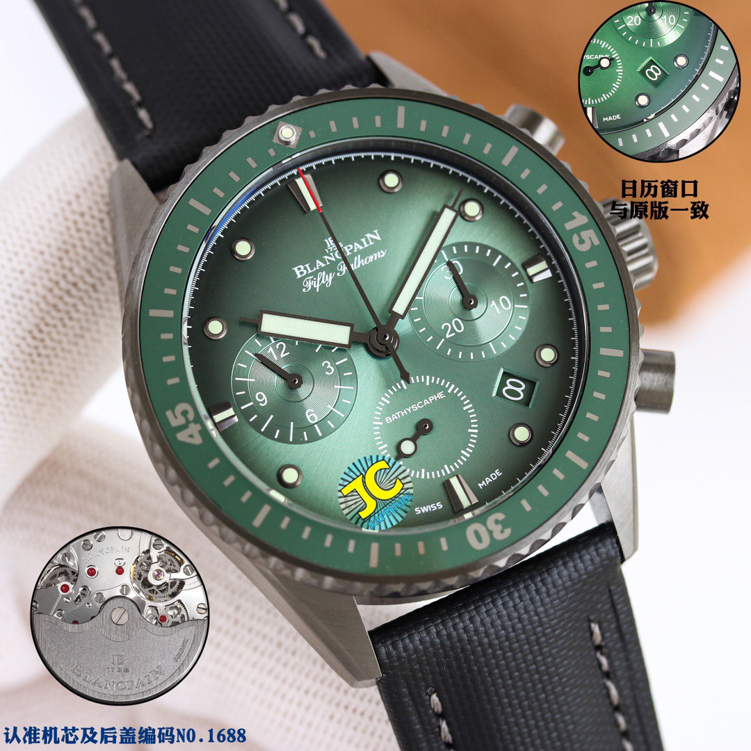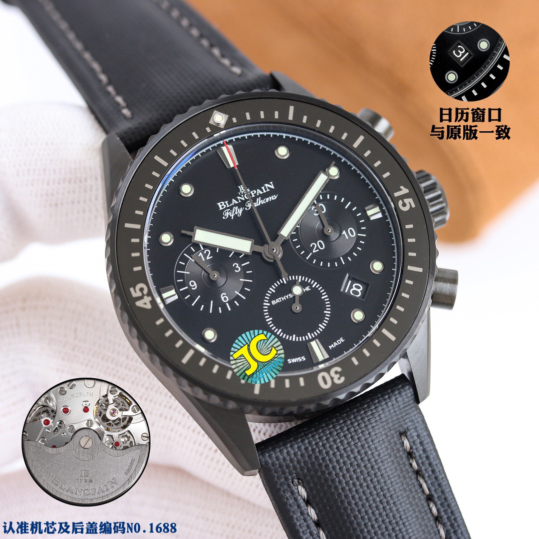 【毒物】宝珀五十噚系列5200-0153-B52A深潜器飞返计时码表问世了,低调中彰显不凡,采用进口泛蓝光蓝宝石玻璃,刀刮不留痕。腕表采用进口7750机芯改原版F385自动机械*日历窗口大小颜色与机芯功能完全对版专柜。直径:43.60mm。夹板宝石轴承颜色与原装一致,真正做到色泽纯良,让夹板不再一眼假!一体式夹板,除了外观更接近原装之余还能更好的保护机芯,质量更稳定!夹板经过研磨处理之后再做倒角加工,历时12个月慢工细琢只为了避免夹板的铜屑跌落机芯而导致机芯偷停。【表盘】日历大小对版,100%瑞士进口C3夜光,亮度持久度直逼原装正品!【防水】出厂100%三度防水测试。The customized version is the only version available in the market.