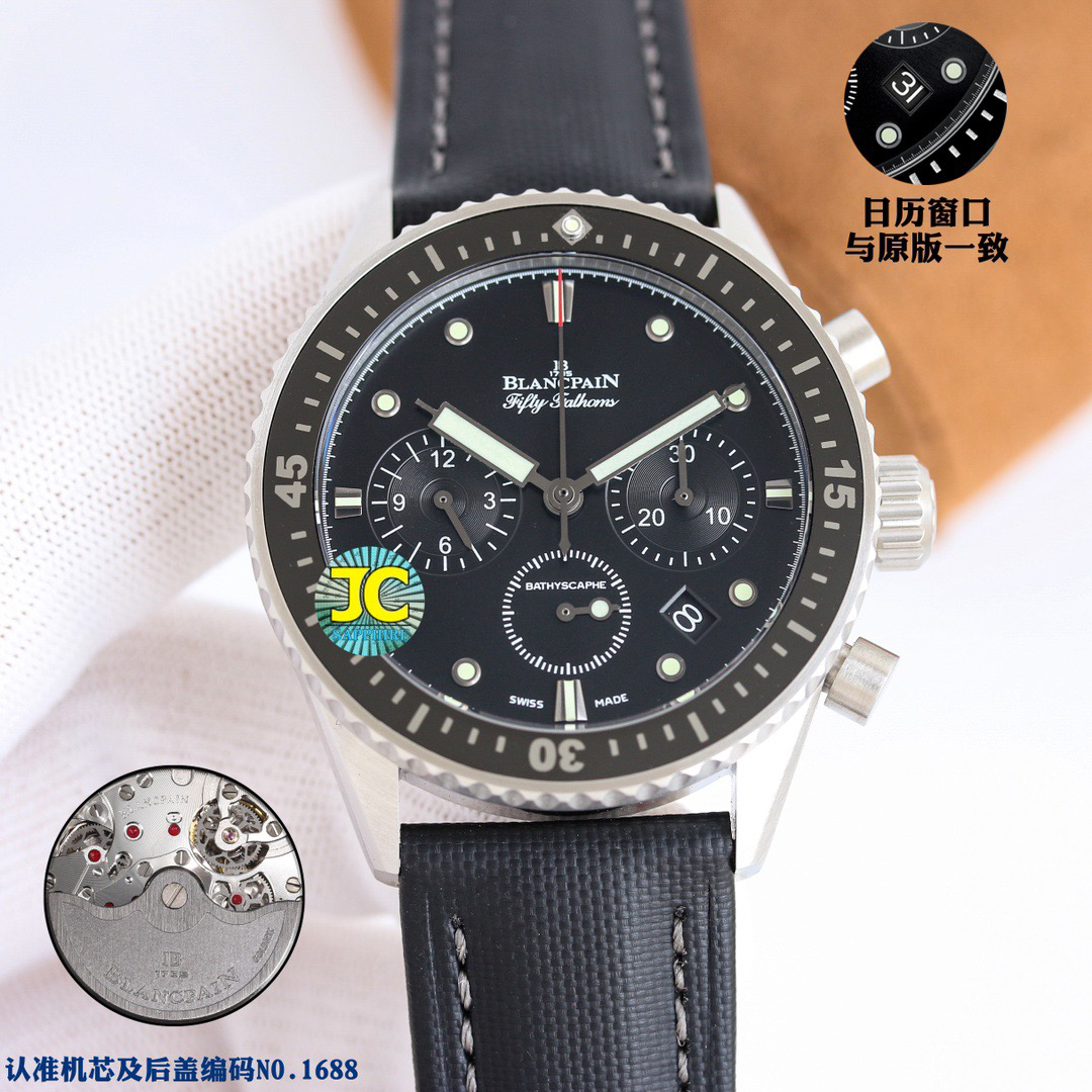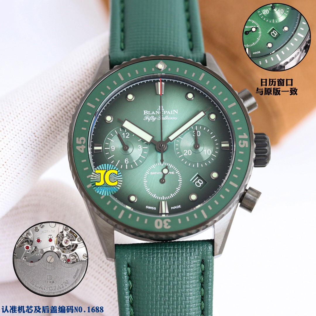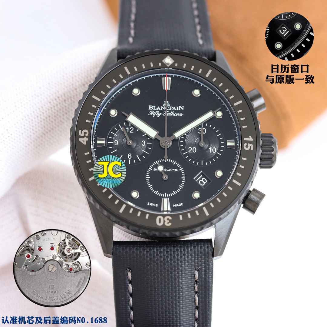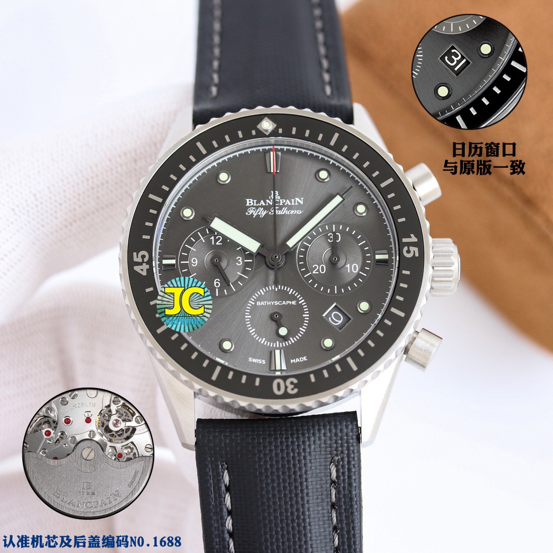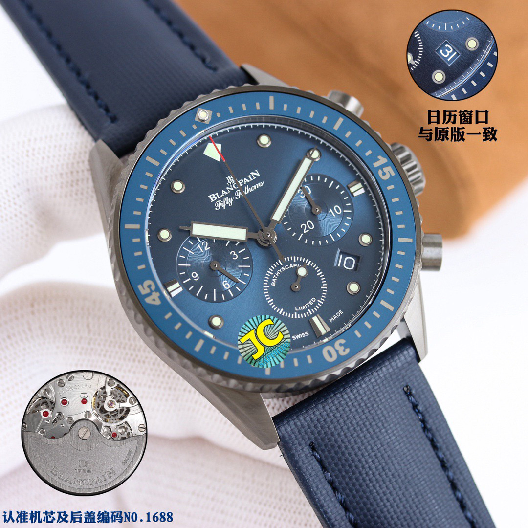 【毒物】宝珀五十噚系列5200-0153-B52A深潜器飞返计时码表问世了,低调中彰显不凡,采用进口泛蓝光蓝宝石玻璃,刀刮不留痕。腕表采用进口7750机芯改原版F385自动机械*日历窗口大小颜色与机芯功能完全对版专柜。直径:43.60mm。夹板宝石轴承颜色与原装一致,真正做到色泽纯良,让夹板不再一眼假!一体式夹板,除了外观更接近原装之余还能更好的保护机芯,质量更稳定!夹板经过研磨处理之后再做倒角加工,历时12个月慢工细琢只为了避免夹板的铜屑跌落机芯而导致机芯偷停。【表盘】日历大小对版,100%瑞士进口C3夜光,亮度持久度直逼原装正品!【防水】出厂100%三度防水测试。The customized version is the only version available in the market.