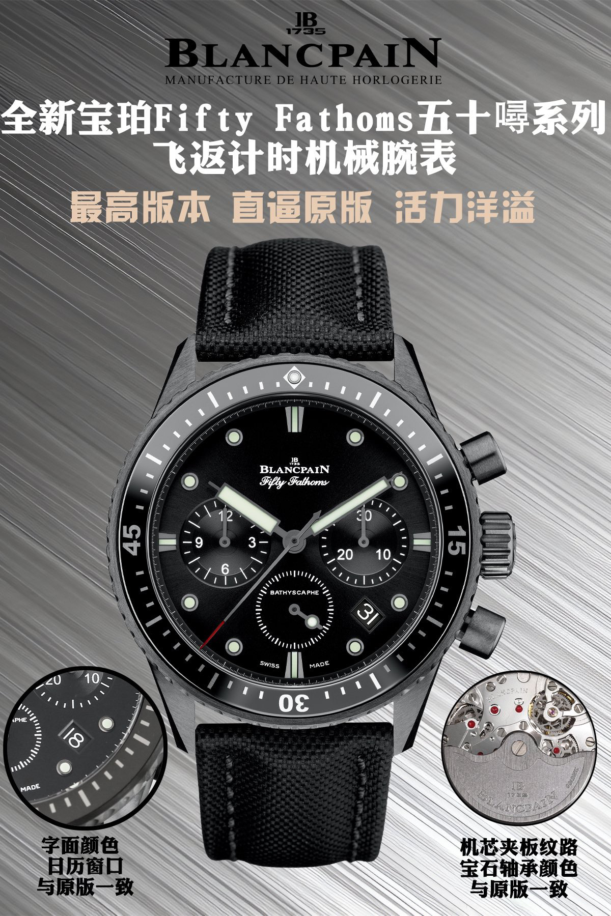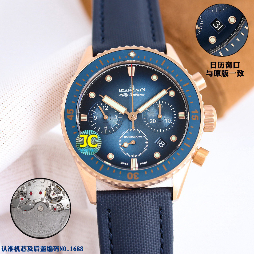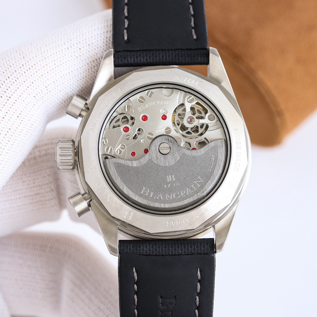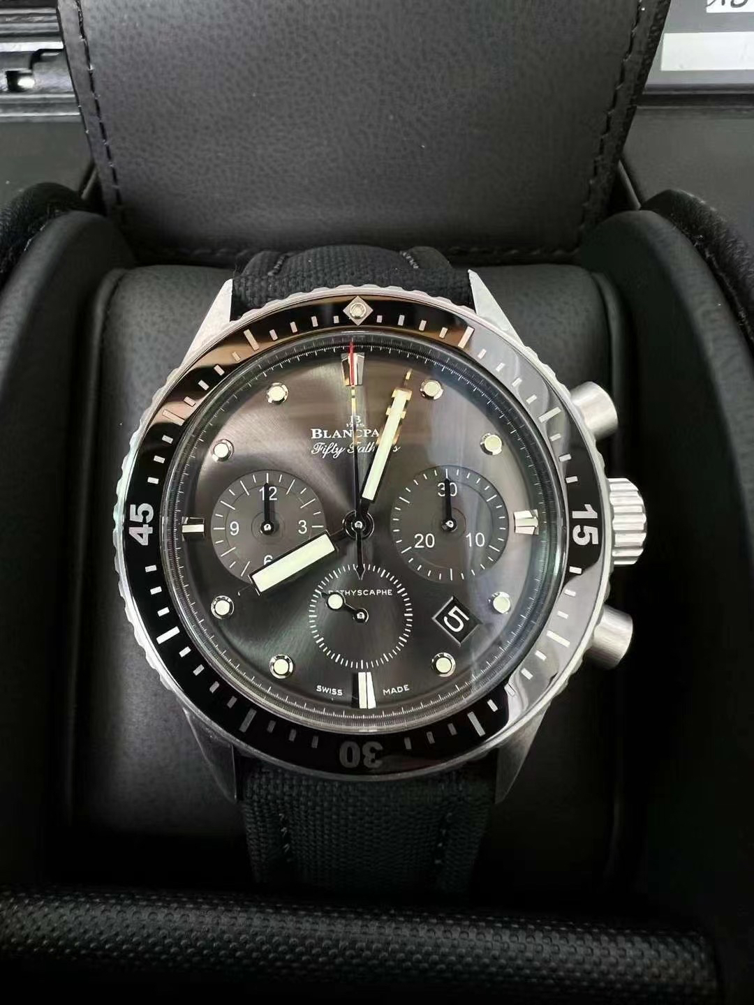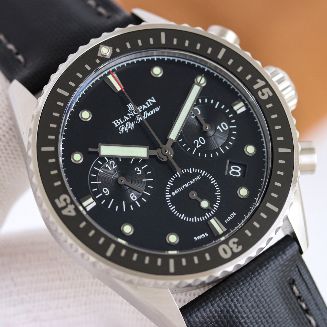 【毒物】宝珀五十噚系列5200-0153-B52A深潜器飞返计时码表问世了,低调中彰显不凡,采用进口泛蓝光蓝宝石玻璃,刀刮不留痕。腕表采用进口7750机芯改原版F385自动机械*日历窗口大小颜色与机芯功能完全对版专柜。直径:43.60mm。夹板宝石轴承颜色与原装一致,真正做到色泽纯良,让夹板不再一眼假!一体式夹板,除了外观更接近原装之余还能更好的保护机芯,质量更稳定!夹板经过研磨处理之后再做倒角加工,历时12个月慢工细琢只为了避免夹板的铜屑跌落机芯而导致机芯偷停。【表盘】日历大小对版,100%瑞士进口C3夜光,亮度持久度直逼原装正品!【防水】出厂100%三度防水测试。The customized version is the only version available in the market.