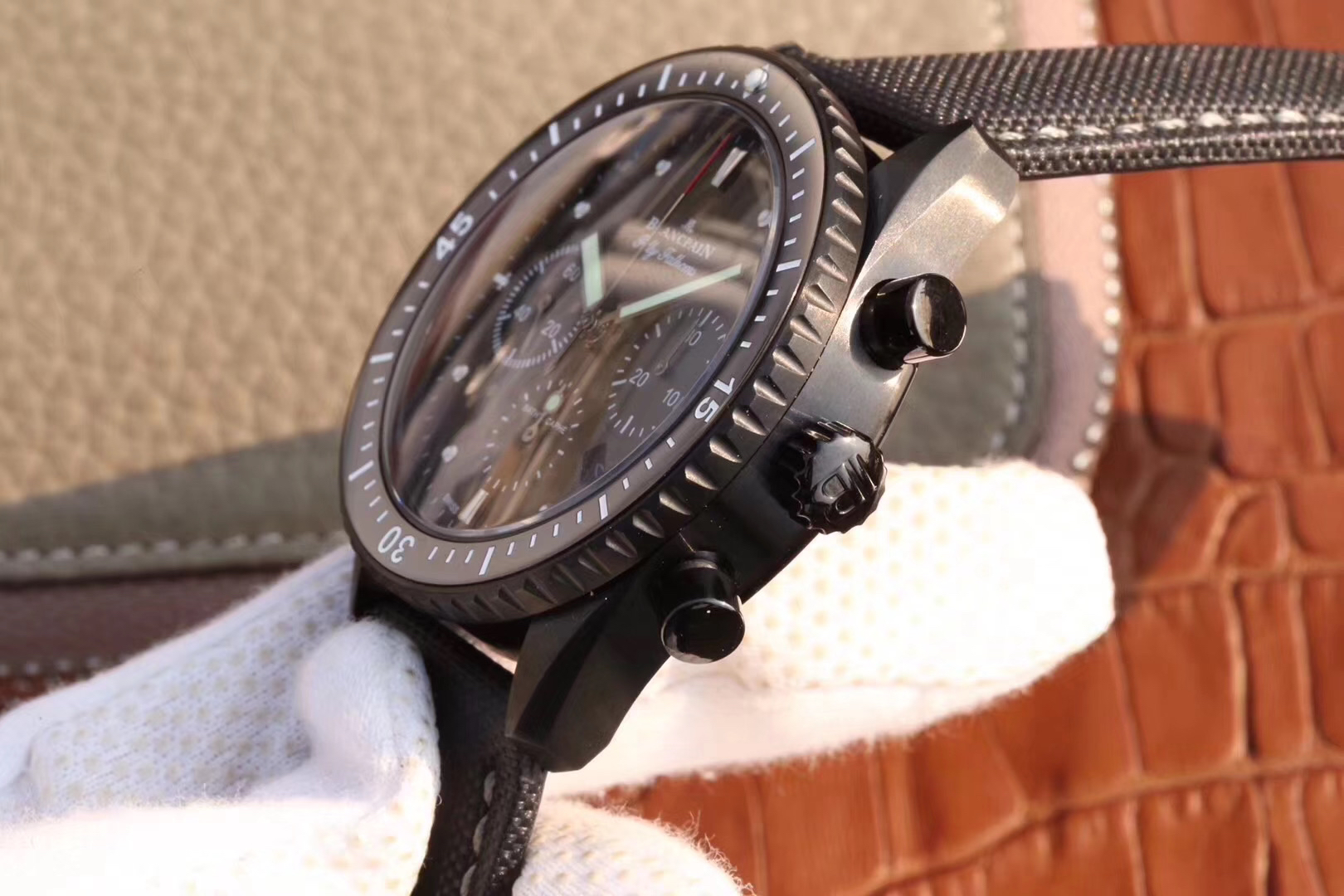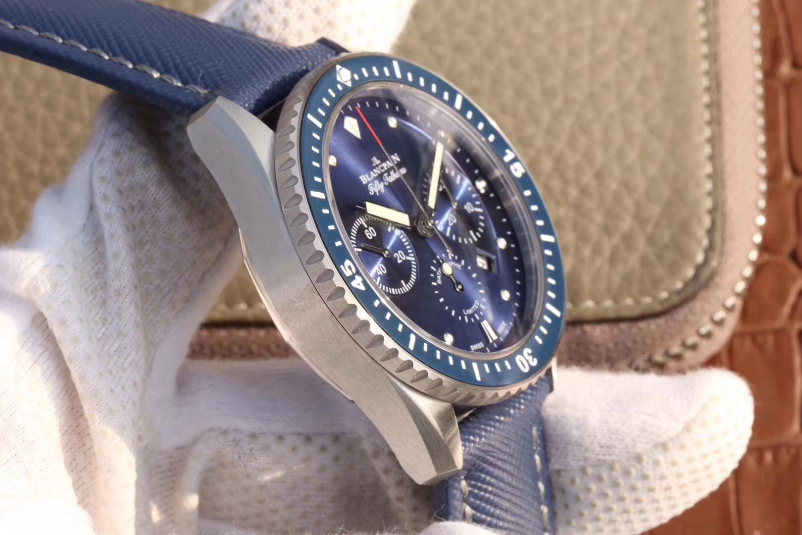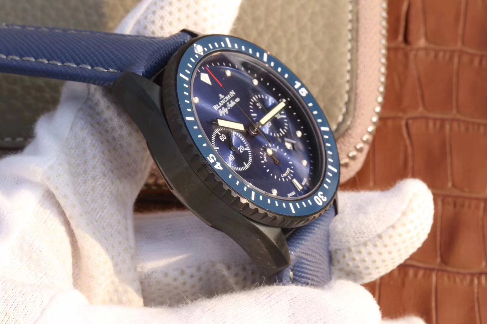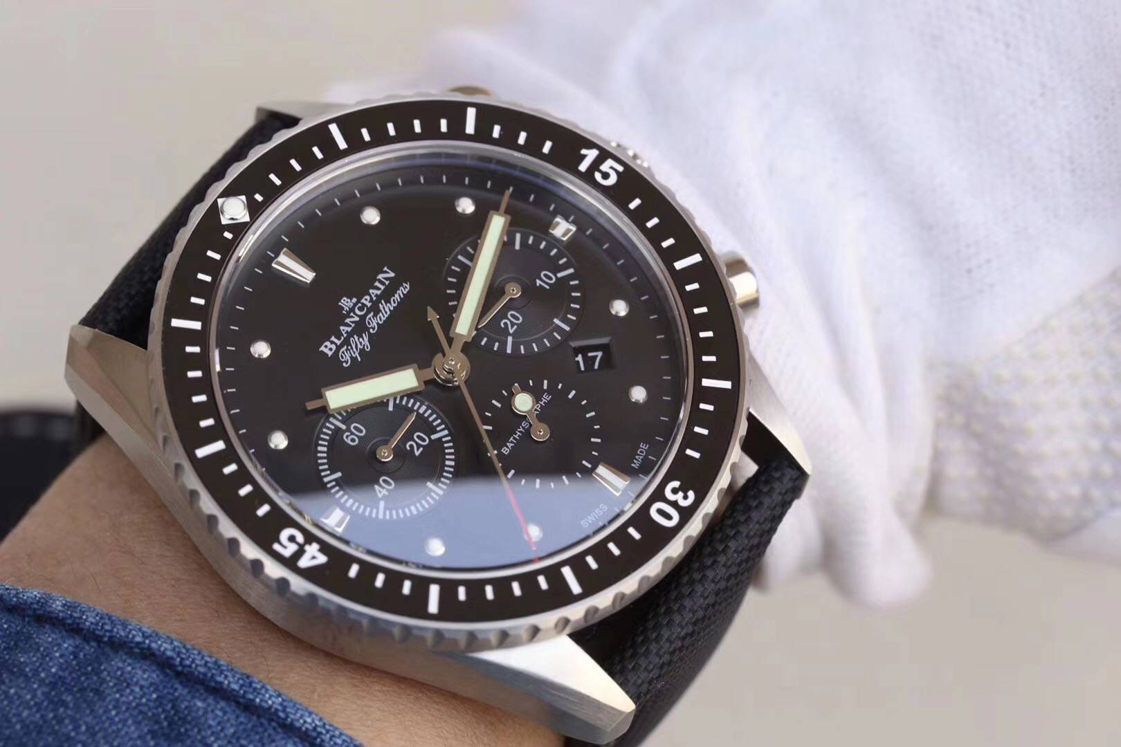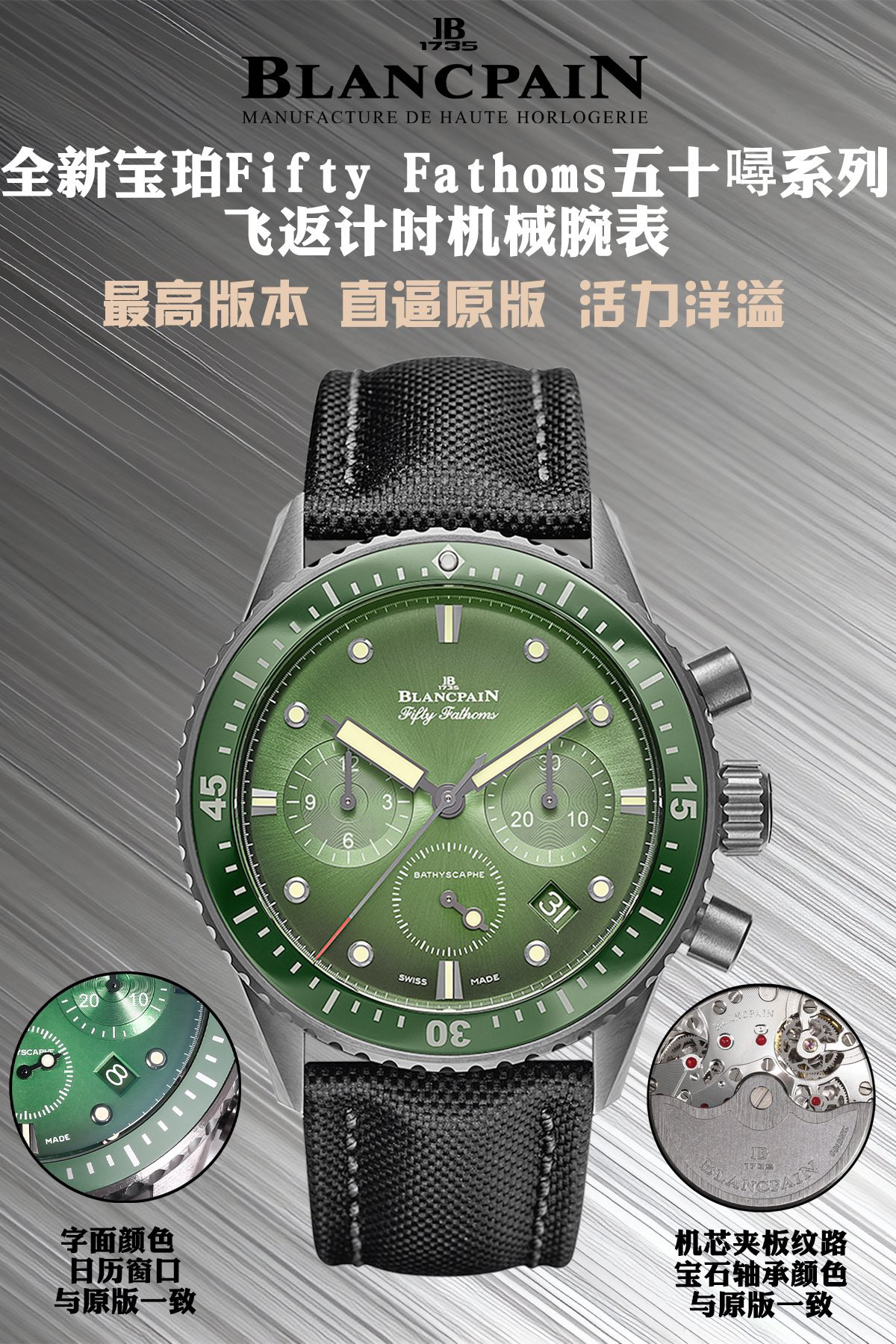 【毒物】宝珀五十噚系列5200-0153-B52A深潜器飞返计时码表问世了,低调中彰显不凡,采用进口泛蓝光蓝宝石玻璃,刀刮不留痕。腕表采用进口7750机芯改原版F385自动机械*日历窗口大小颜色与机芯功能完全对版专柜。直径:43.60mm。夹板宝石轴承颜色与原装一致,真正做到色泽纯良,让夹板不再一眼假!一体式夹板,除了外观更接近原装之余还能更好的保护机芯,质量更稳定!夹板经过研磨处理之后再做倒角加工,历时12个月慢工细琢只为了避免夹板的铜屑跌落机芯而导致机芯偷停。【表盘】日历大小对版,100%瑞士进口C3夜光,亮度持久度直逼原装正品!【防水】出厂100%三度防水测试。The customized version is the only version available in the market.