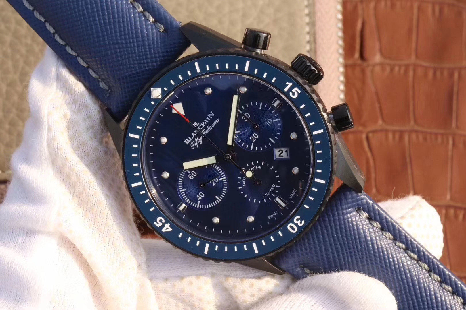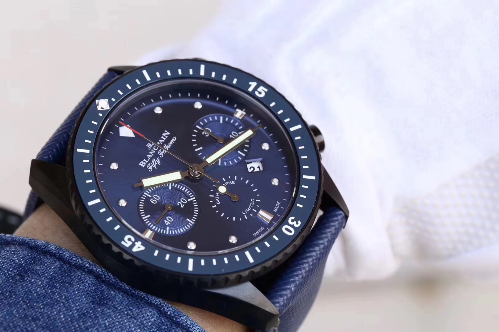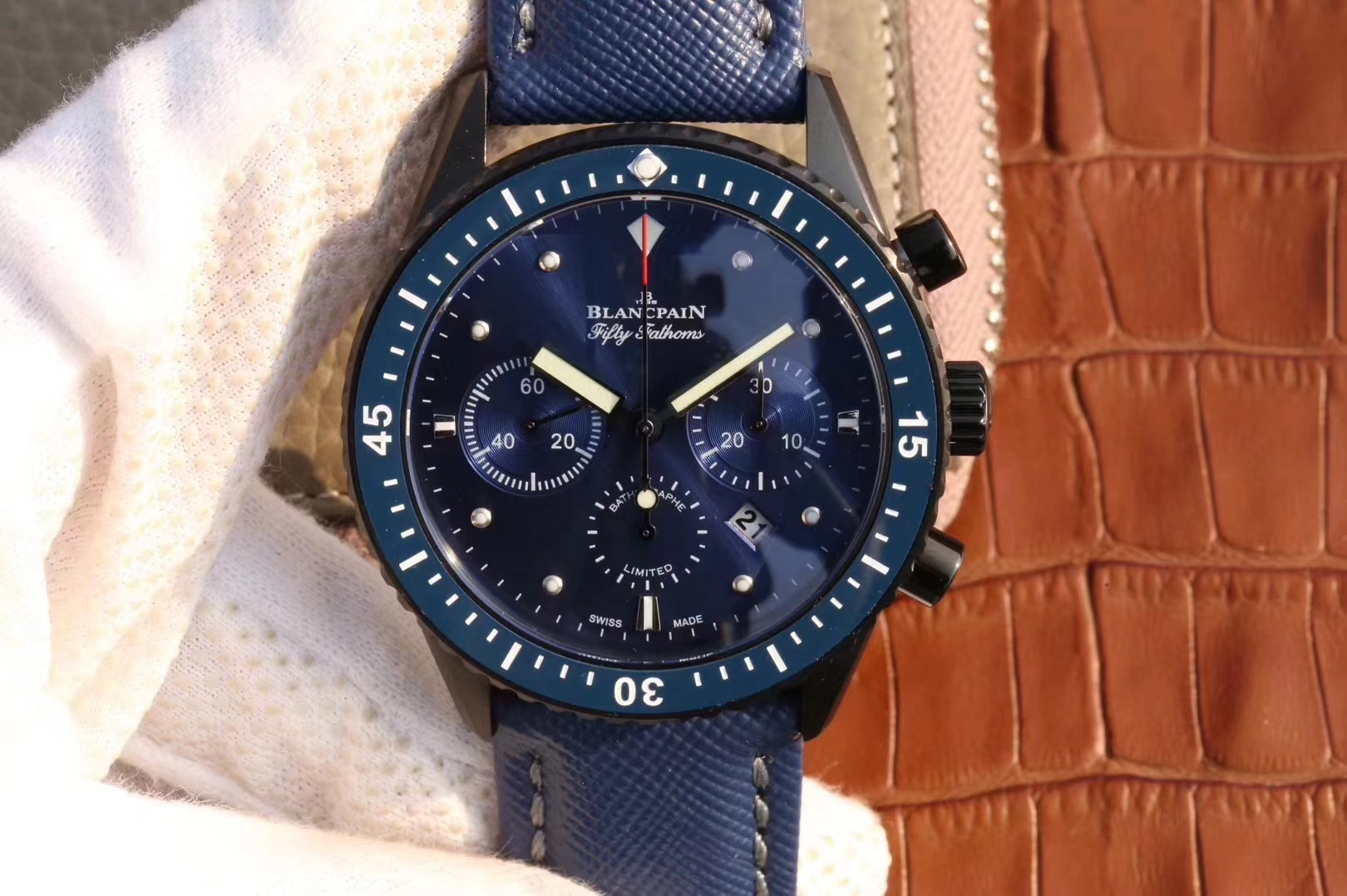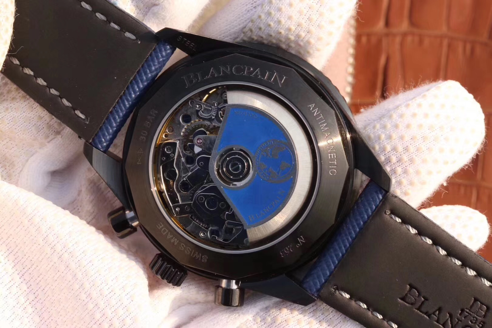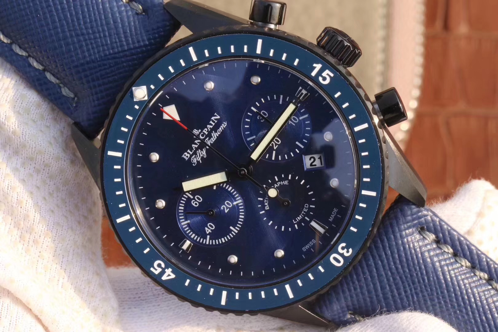 【毒物】宝珀五十噚系列5200-0153-B52A深潜器飞返计时码表问世了,低调中彰显不凡,采用进口泛蓝光蓝宝石玻璃,刀刮不留痕。腕表采用进口7750机芯改原版F385自动机械*日历窗口大小颜色与机芯功能完全对版专柜。直径:43.60mm。夹板宝石轴承颜色与原装一致,真正做到色泽纯良,让夹板不再一眼假!一体式夹板,除了外观更接近原装之余还能更好的保护机芯,质量更稳定!夹板经过研磨处理之后再做倒角加工,历时12个月慢工细琢只为了避免夹板的铜屑跌落机芯而导致机芯偷停。【表盘】日历大小对版,100%瑞士进口C3夜光,亮度持久度直逼原装正品!【防水】出厂100%三度防水测试。The customized version is the only version available in the market.
