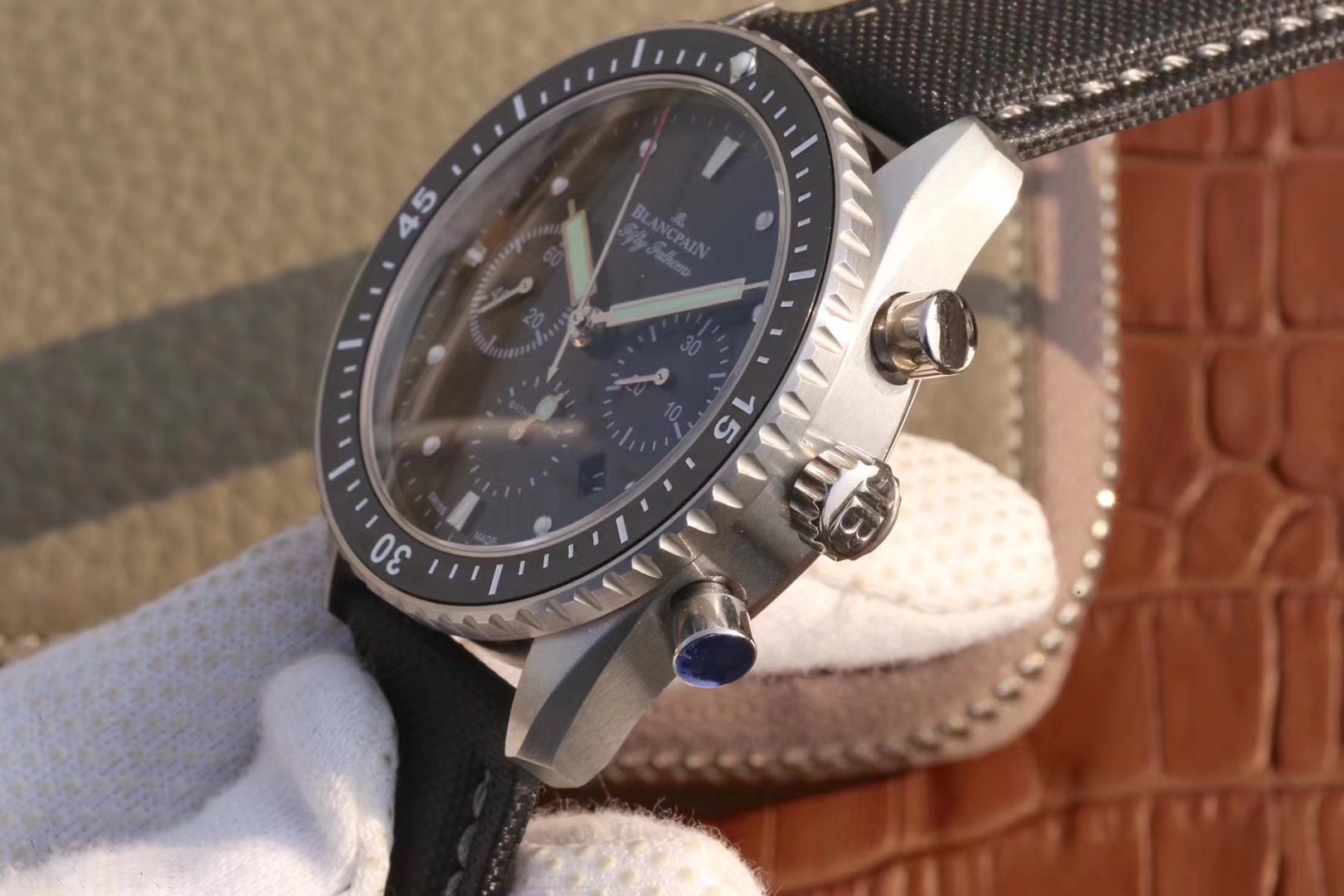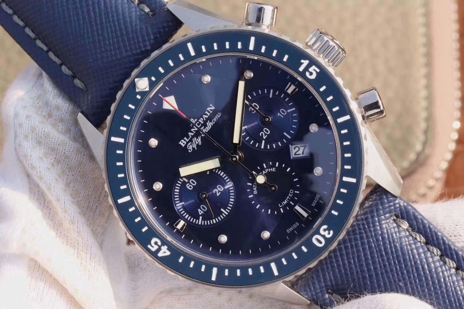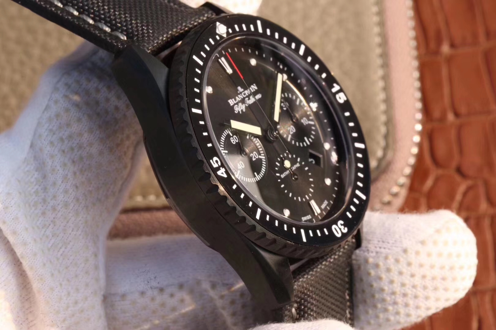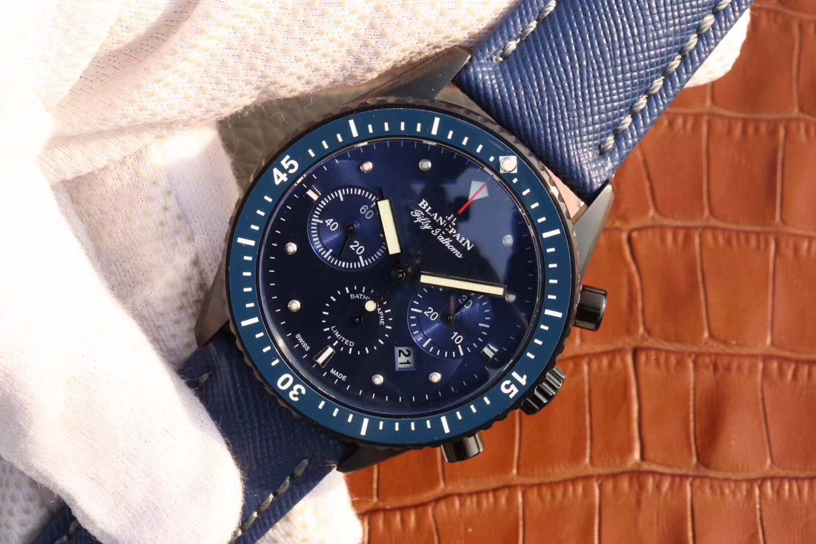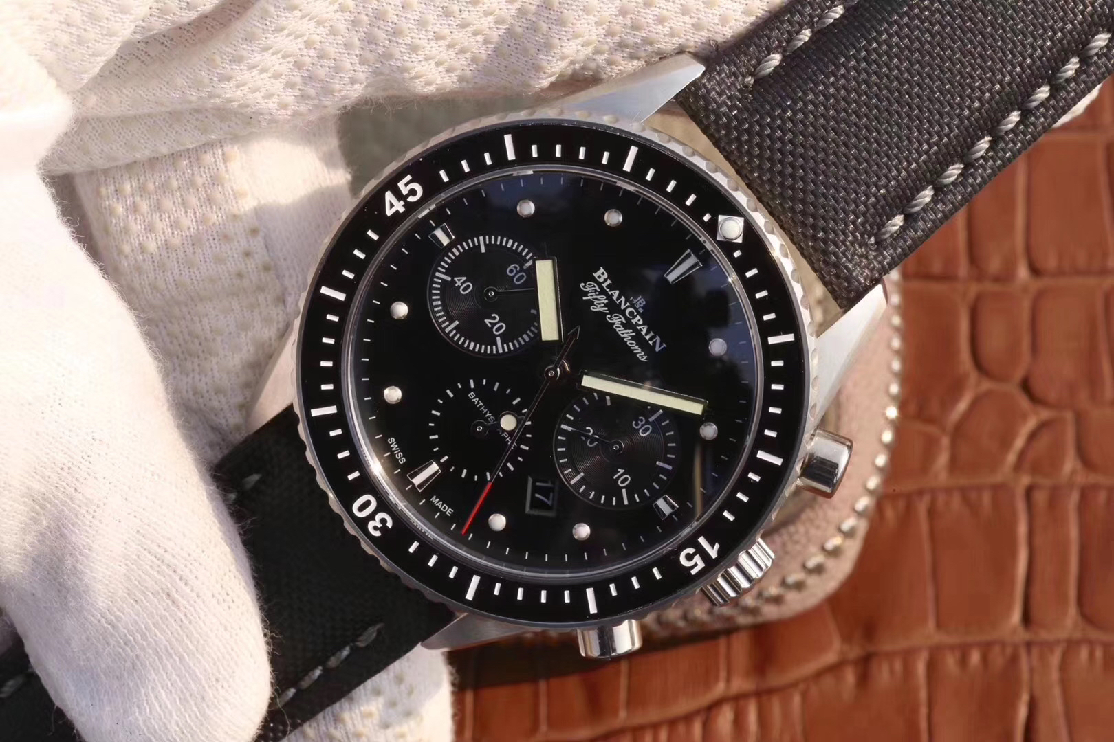 【毒物】宝珀五十噚系列5200-0153-B52A深潜器飞返计时码表问世了,低调中彰显不凡,采用进口泛蓝光蓝宝石玻璃,刀刮不留痕。腕表采用进口7750机芯改原版F385自动机械*日历窗口大小颜色与机芯功能完全对版专柜。直径:43.60mm。夹板宝石轴承颜色与原装一致,真正做到色泽纯良,让夹板不再一眼假!一体式夹板,除了外观更接近原装之余还能更好的保护机芯,质量更稳定!夹板经过研磨处理之后再做倒角加工,历时12个月慢工细琢只为了避免夹板的铜屑跌落机芯而导致机芯偷停。【表盘】日历大小对版,100%瑞士进口C3夜光,亮度持久度直逼原装正品!【防水】出厂100%三度防水测试。The customized version is the only version available in the market.