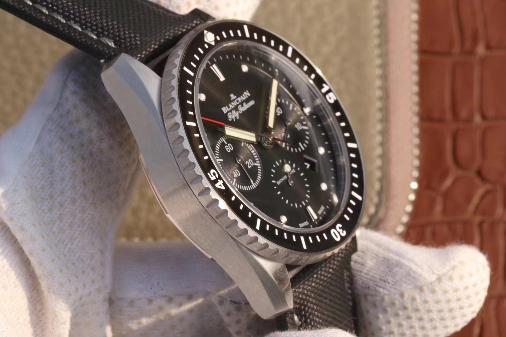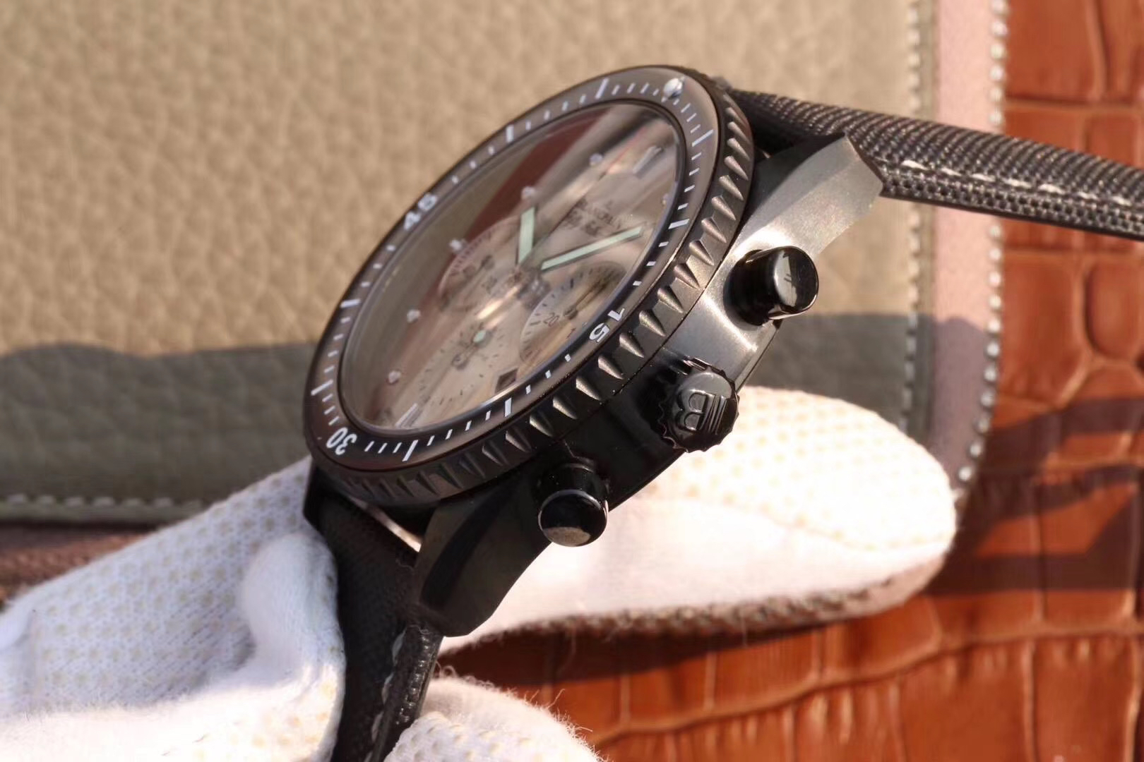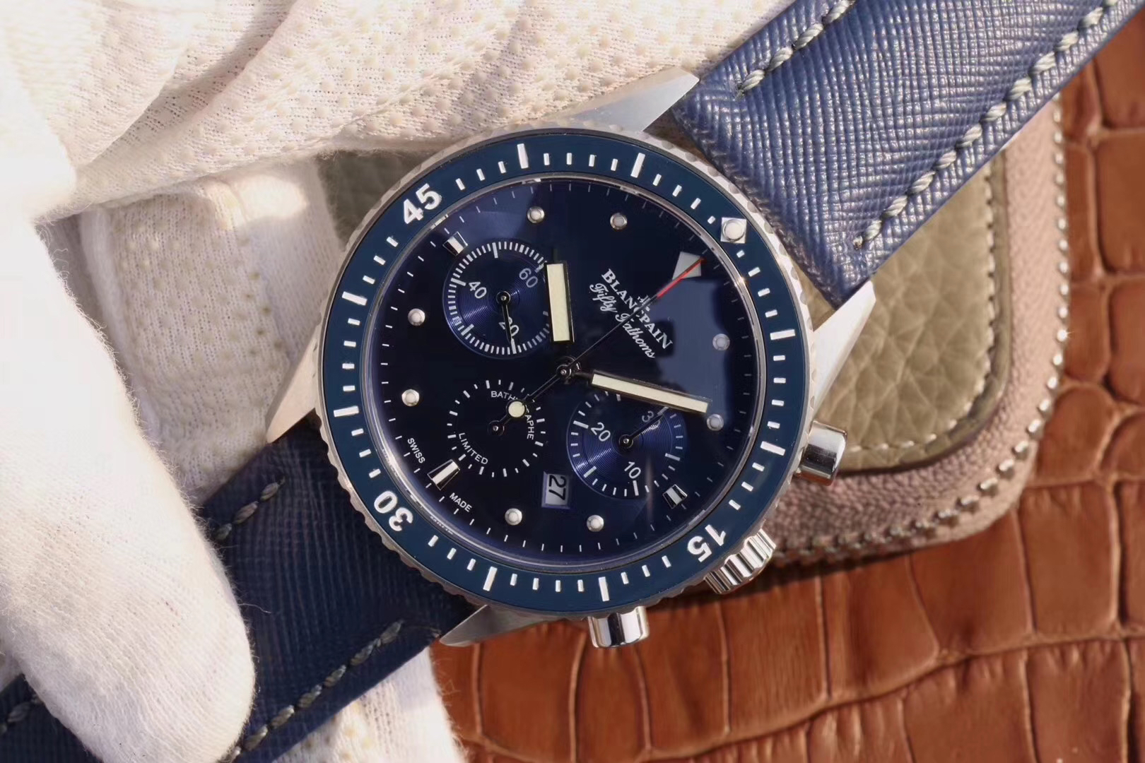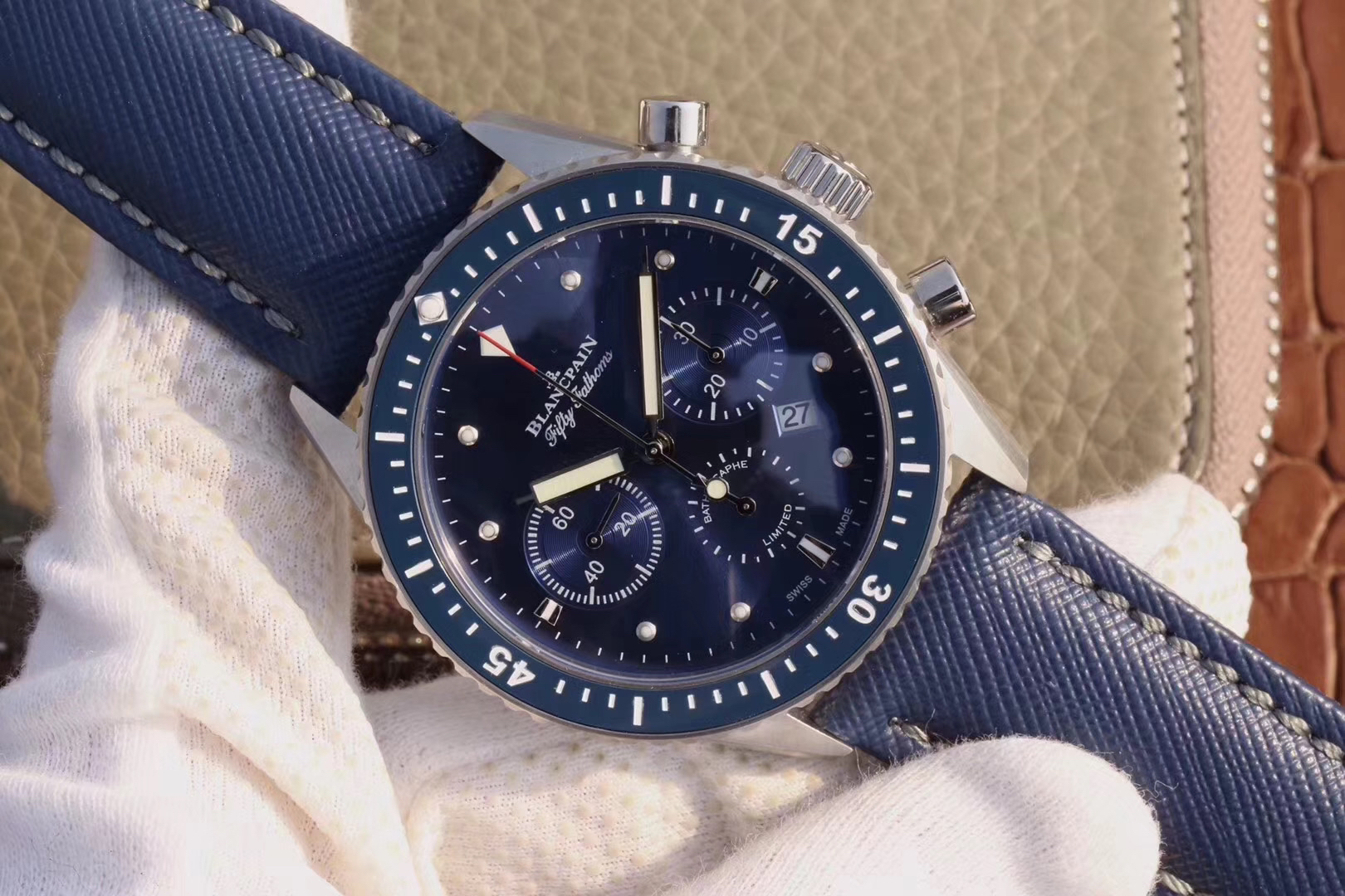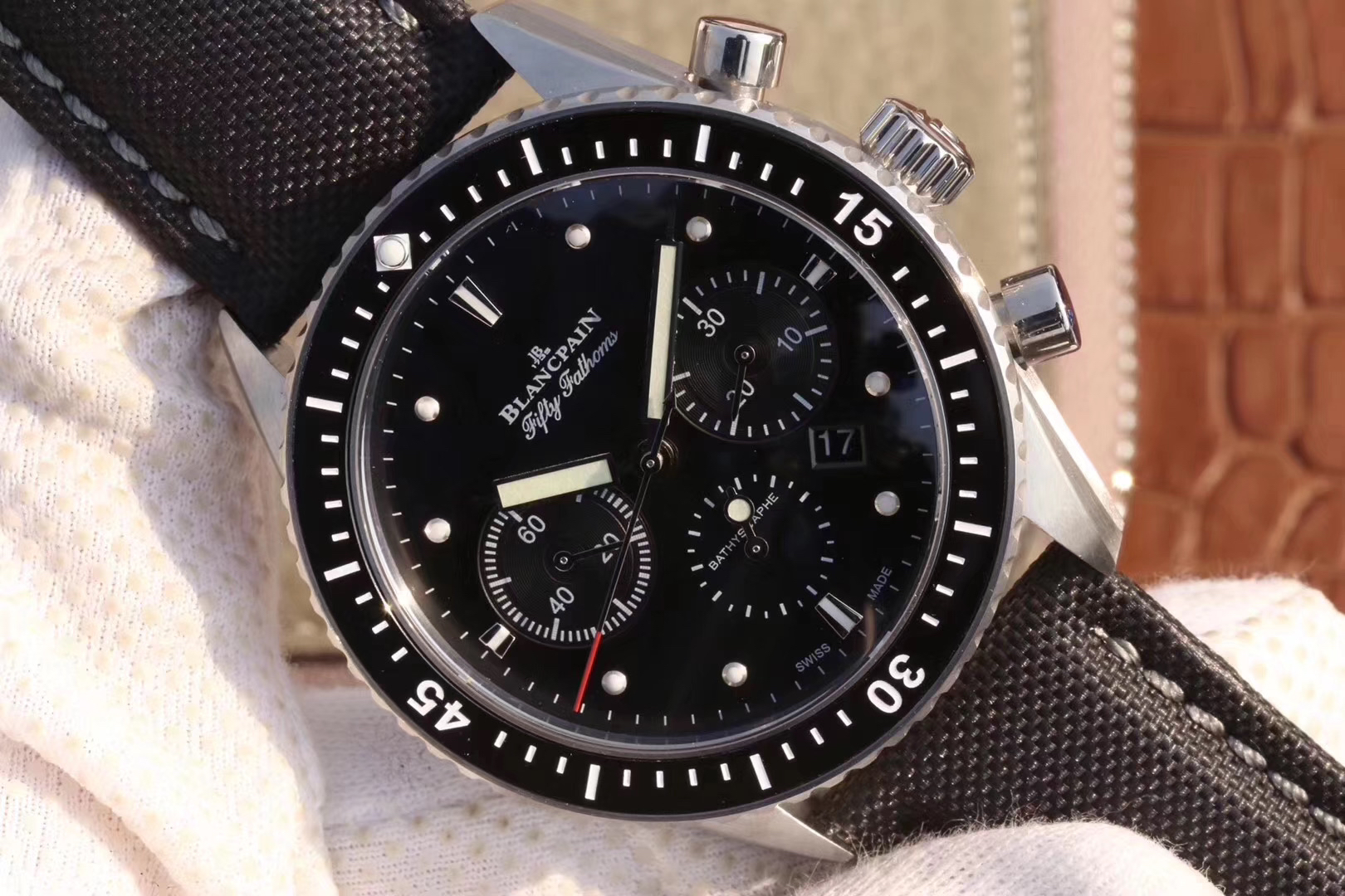 【毒物】宝珀五十噚系列5200-0153-B52A深潜器飞返计时码表问世了,低调中彰显不凡,采用进口泛蓝光蓝宝石玻璃,刀刮不留痕。腕表采用进口7750机芯改原版F385自动机械*日历窗口大小颜色与机芯功能完全对版专柜。直径:43.60mm。夹板宝石轴承颜色与原装一致,真正做到色泽纯良,让夹板不再一眼假!一体式夹板,除了外观更接近原装之余还能更好的保护机芯,质量更稳定!夹板经过研磨处理之后再做倒角加工,历时12个月慢工细琢只为了避免夹板的铜屑跌落机芯而导致机芯偷停。【表盘】日历大小对版,100%瑞士进口C3夜光,亮度持久度直逼原装正品!【防水】出厂100%三度防水测试。The customized version is the only version available in the market.