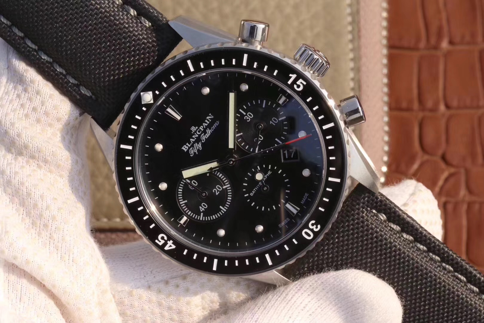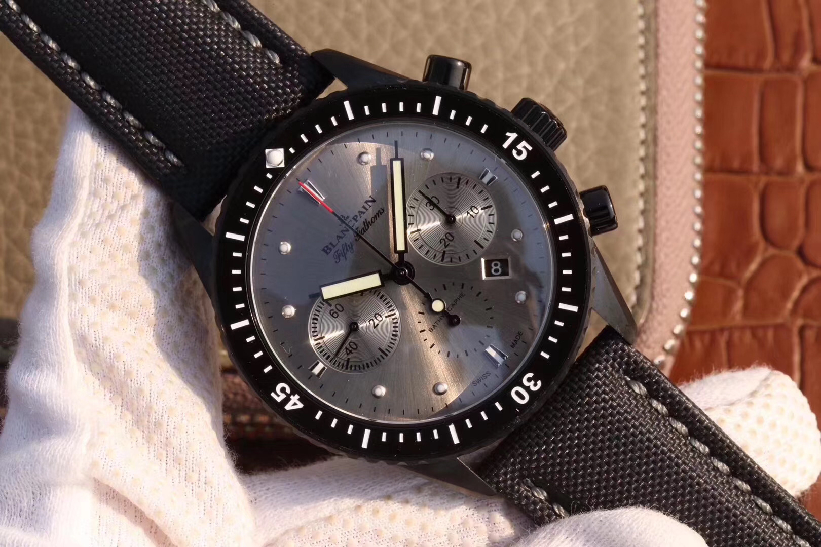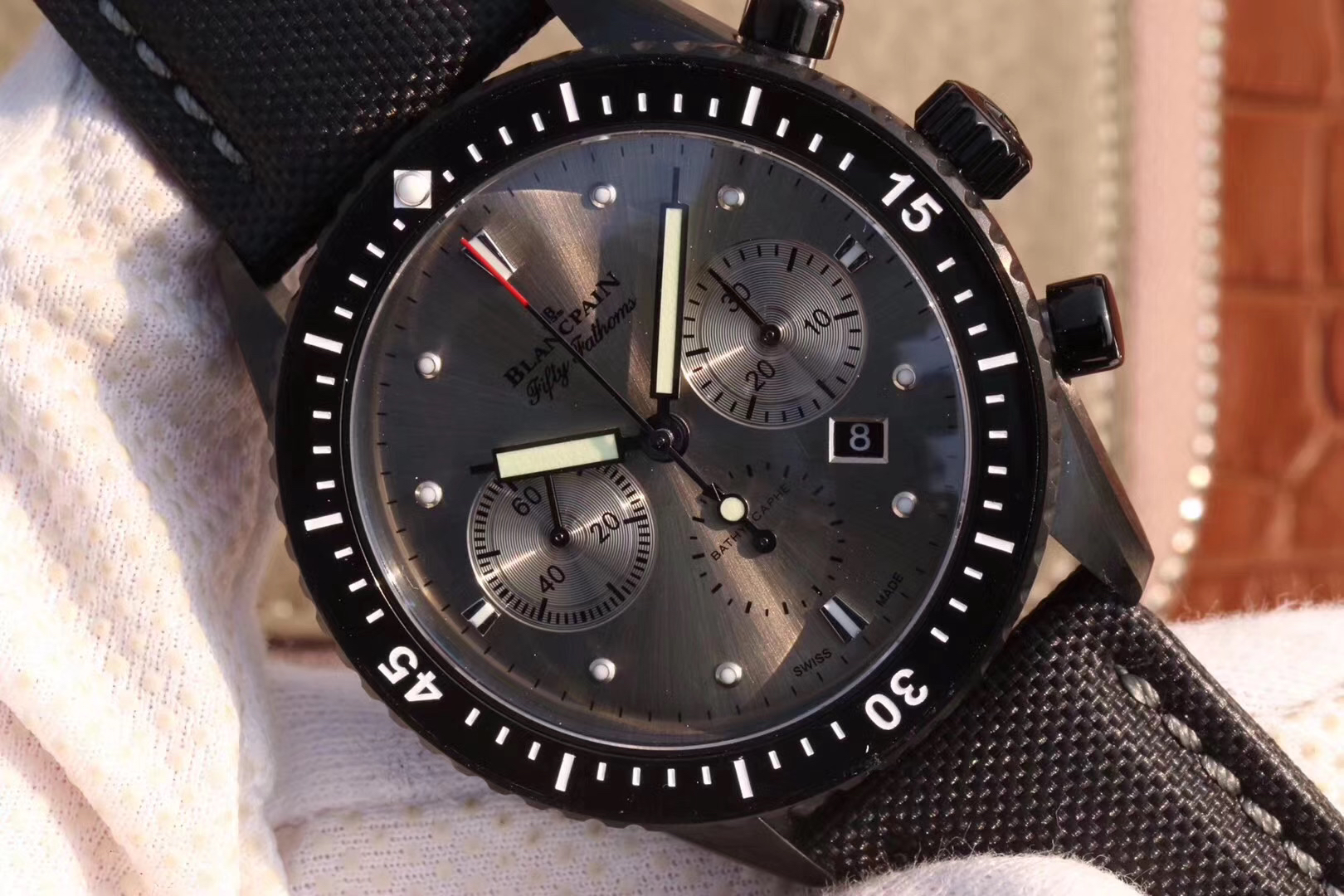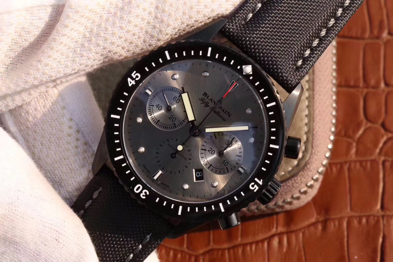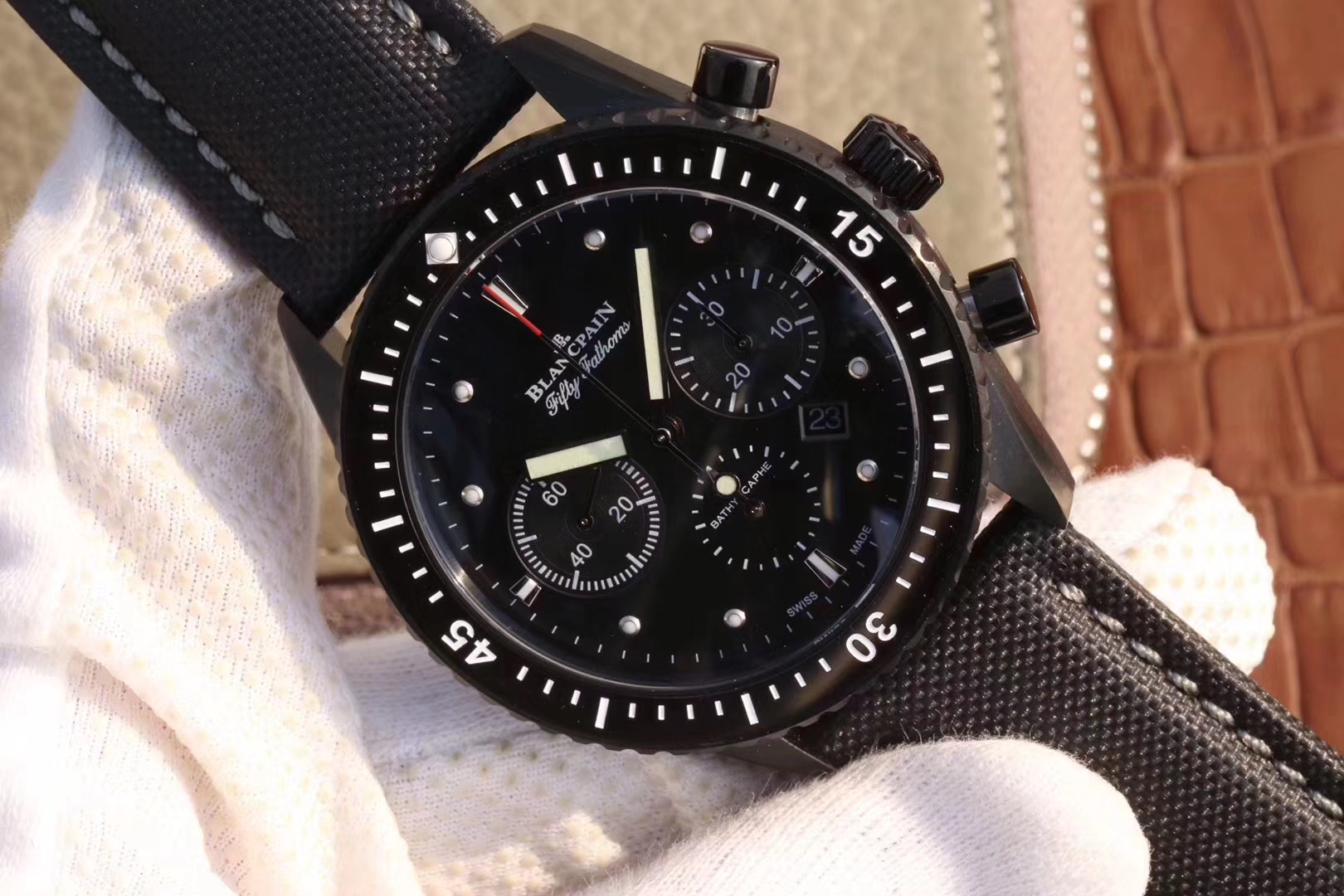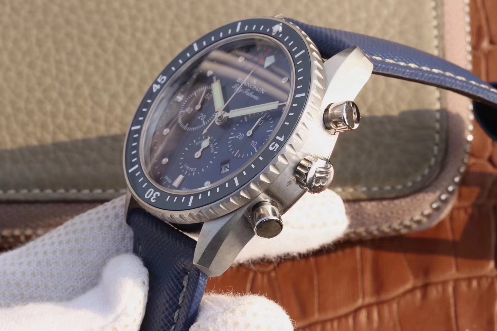 【毒物】宝珀五十噚系列5200-0153-B52A深潜器飞返计时码表问世了,低调中彰显不凡,采用进口泛蓝光蓝宝石玻璃,刀刮不留痕。腕表采用进口7750机芯改原版F385自动机械*日历窗口大小颜色与机芯功能完全对版专柜。直径:43.60mm。夹板宝石轴承颜色与原装一致,真正做到色泽纯良,让夹板不再一眼假!一体式夹板,除了外观更接近原装之余还能更好的保护机芯,质量更稳定!夹板经过研磨处理之后再做倒角加工,历时12个月慢工细琢只为了避免夹板的铜屑跌落机芯而导致机芯偷停。【表盘】日历大小对版,100%瑞士进口C3夜光,亮度持久度直逼原装正品!【防水】出厂100%三度防水测试。The customized version is the only version available in the market.