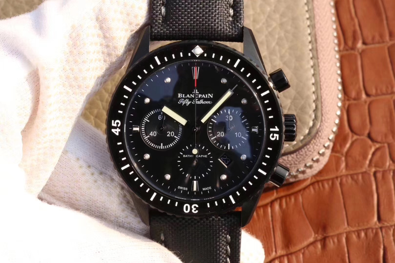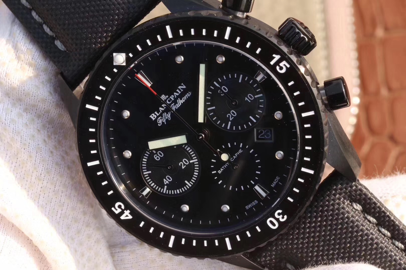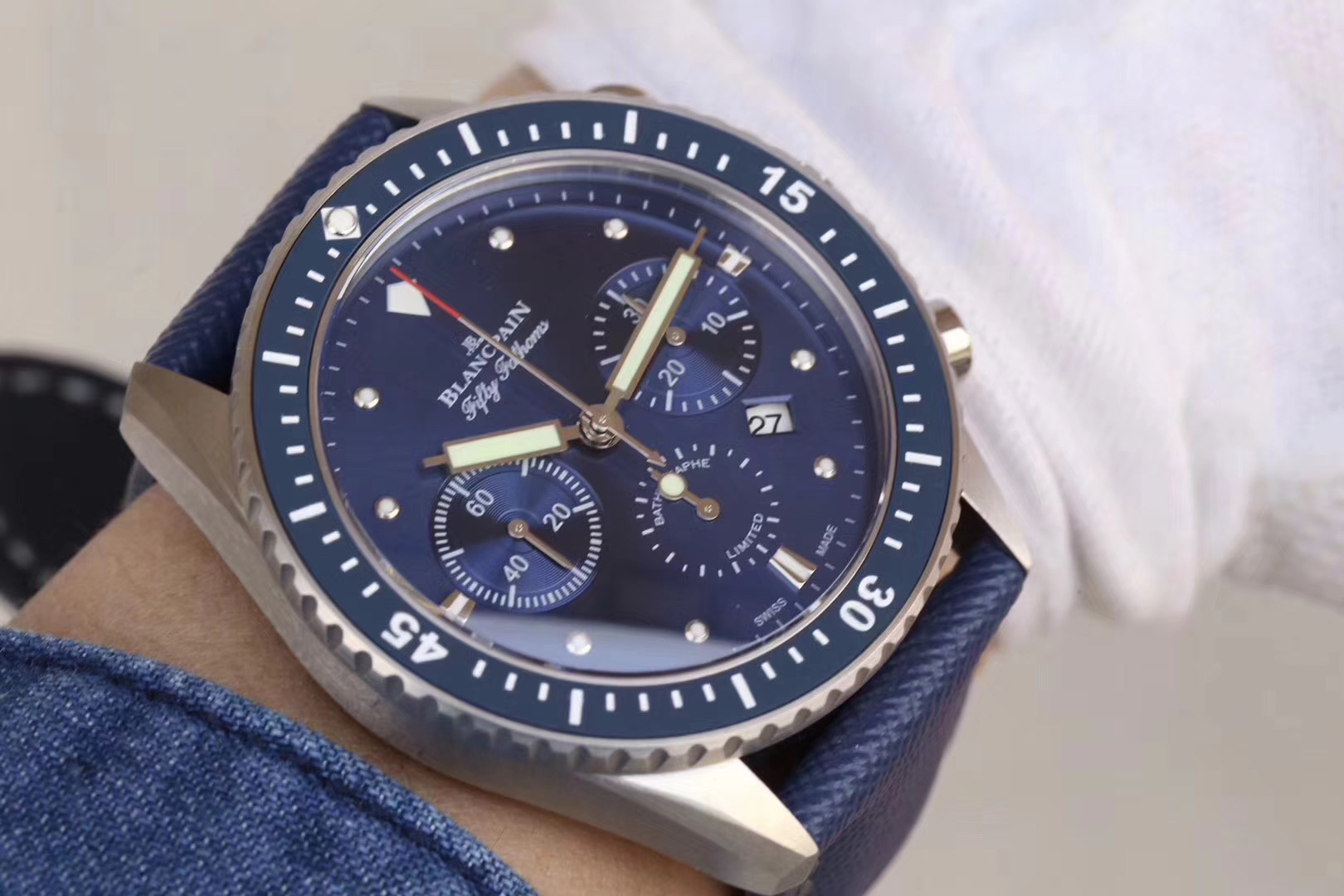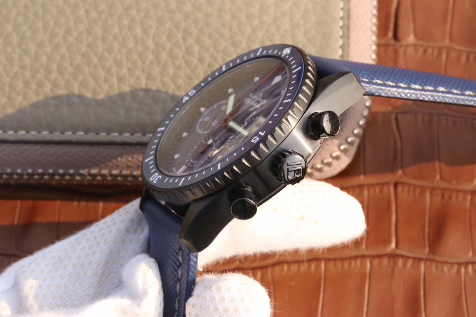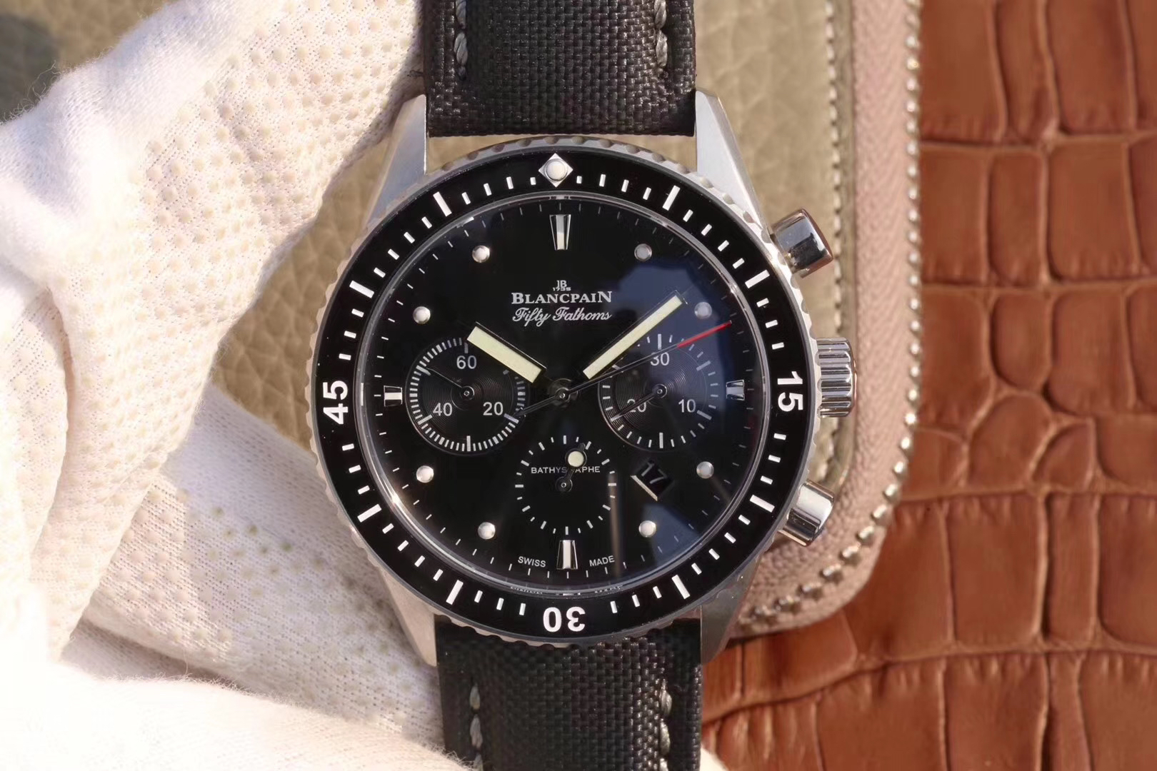 【毒物】宝珀五十噚系列5200-0153-B52A深潜器飞返计时码表问世了,低调中彰显不凡,采用进口泛蓝光蓝宝石玻璃,刀刮不留痕。腕表采用进口7750机芯改原版F385自动机械*日历窗口大小颜色与机芯功能完全对版专柜。直径:43.60mm。夹板宝石轴承颜色与原装一致,真正做到色泽纯良,让夹板不再一眼假!一体式夹板,除了外观更接近原装之余还能更好的保护机芯,质量更稳定!夹板经过研磨处理之后再做倒角加工,历时12个月慢工细琢只为了避免夹板的铜屑跌落机芯而导致机芯偷停。【表盘】日历大小对版,100%瑞士进口C3夜光,亮度持久度直逼原装正品!【防水】出厂100%三度防水测试。The customized version is the only version available in the market.
