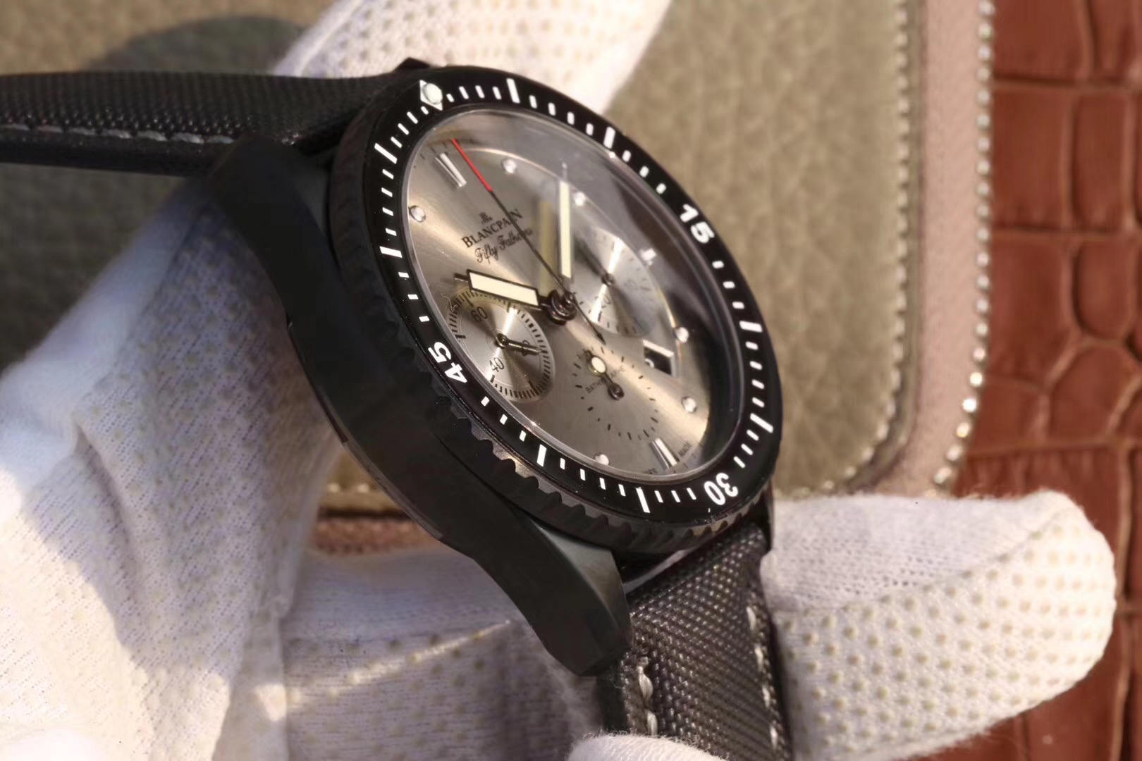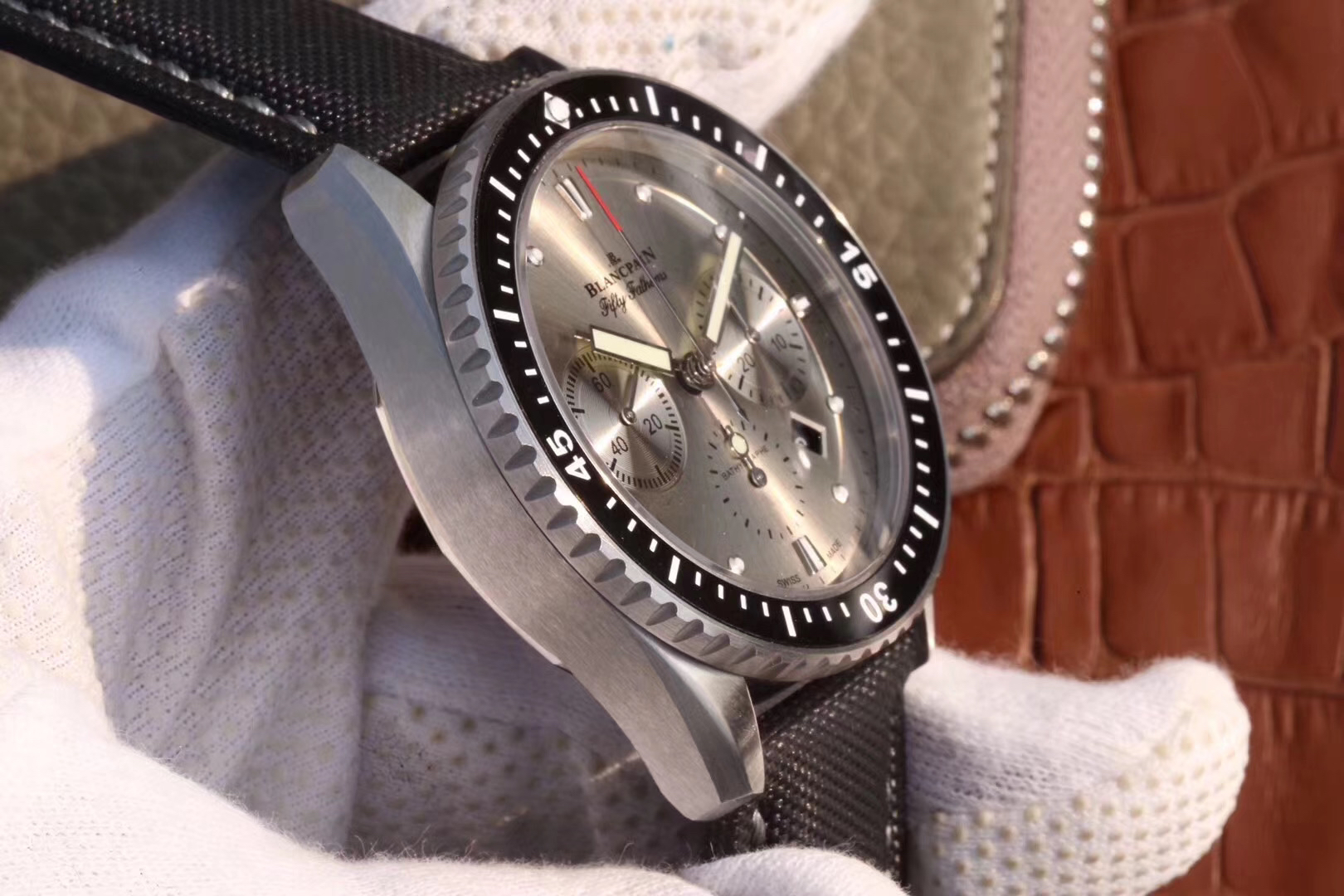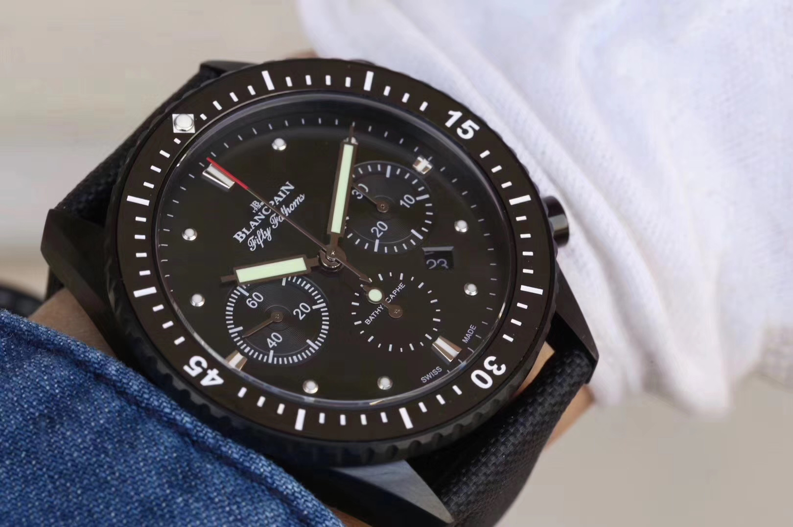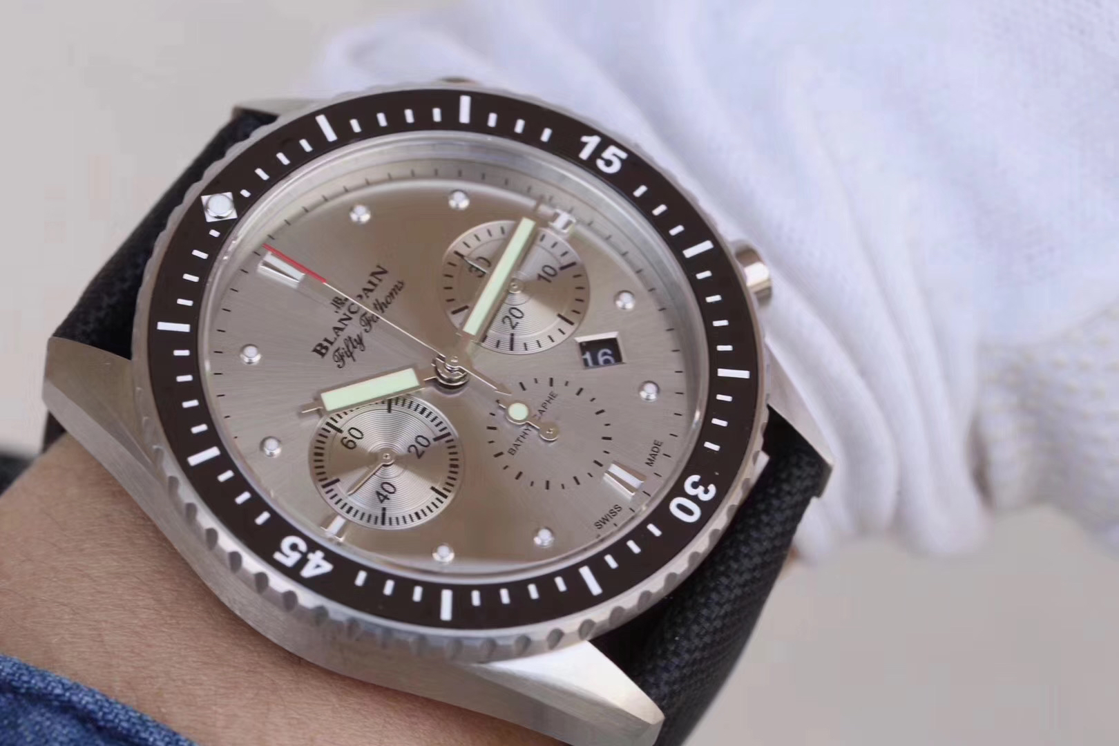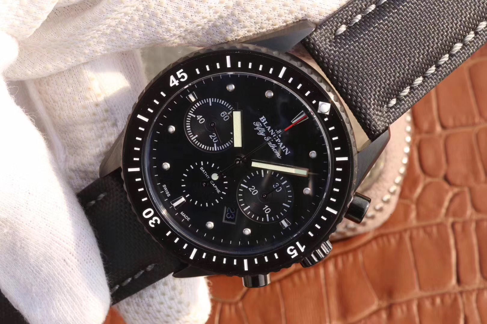 【毒物】宝珀五十噚系列5200-0153-B52A深潜器飞返计时码表问世了,低调中彰显不凡,采用进口泛蓝光蓝宝石玻璃,刀刮不留痕。腕表采用进口7750机芯改原版F385自动机械*日历窗口大小颜色与机芯功能完全对版专柜。直径:43.60mm。夹板宝石轴承颜色与原装一致,真正做到色泽纯良,让夹板不再一眼假!一体式夹板,除了外观更接近原装之余还能更好的保护机芯,质量更稳定!夹板经过研磨处理之后再做倒角加工,历时12个月慢工细琢只为了避免夹板的铜屑跌落机芯而导致机芯偷停。【表盘】日历大小对版,100%瑞士进口C3夜光,亮度持久度直逼原装正品!【防水】出厂100%三度防水测试。The customized version is the only version available in the market.