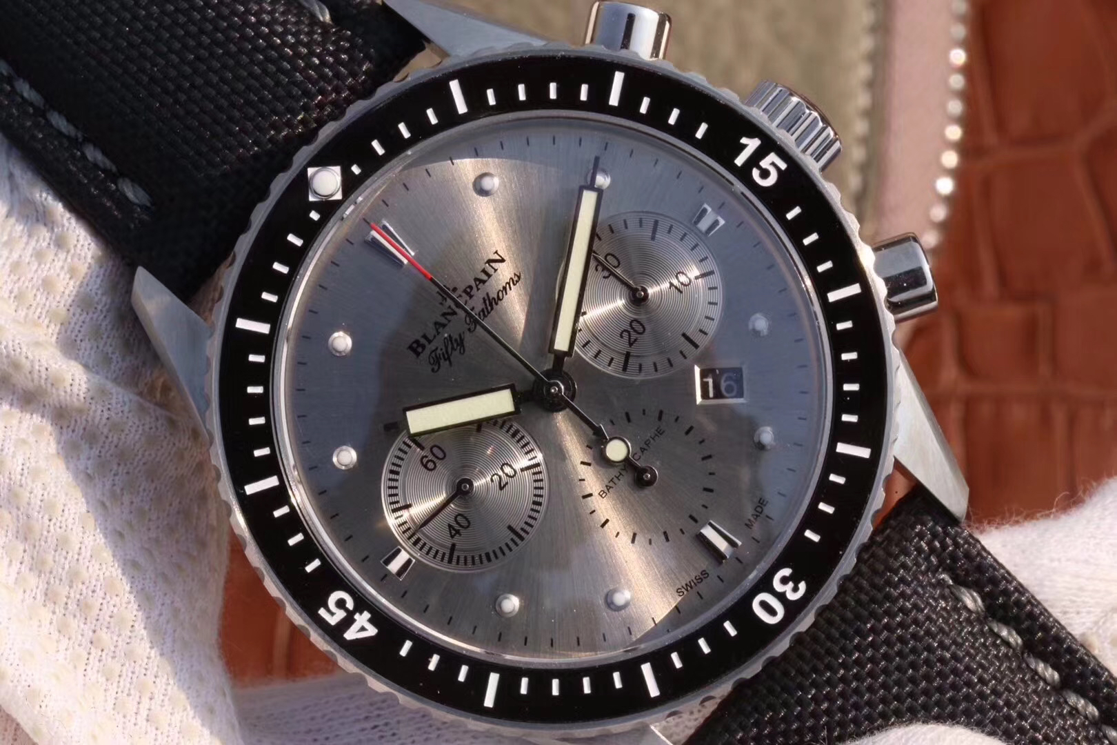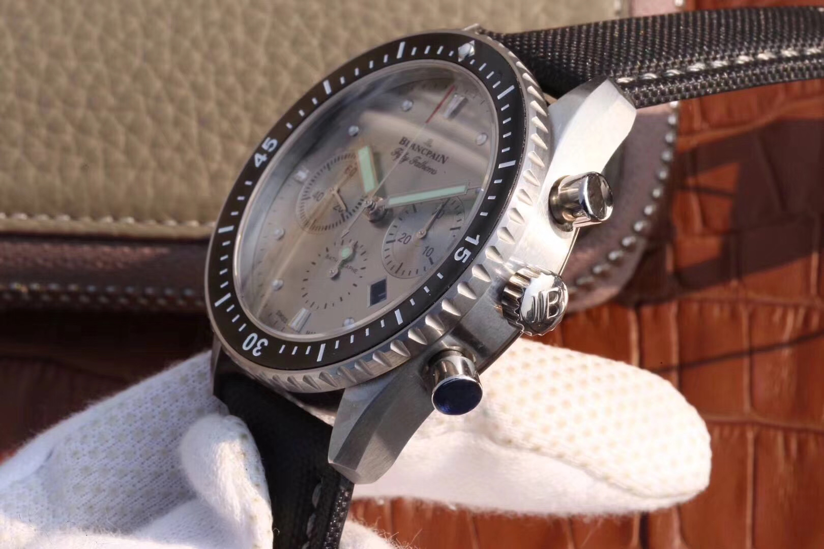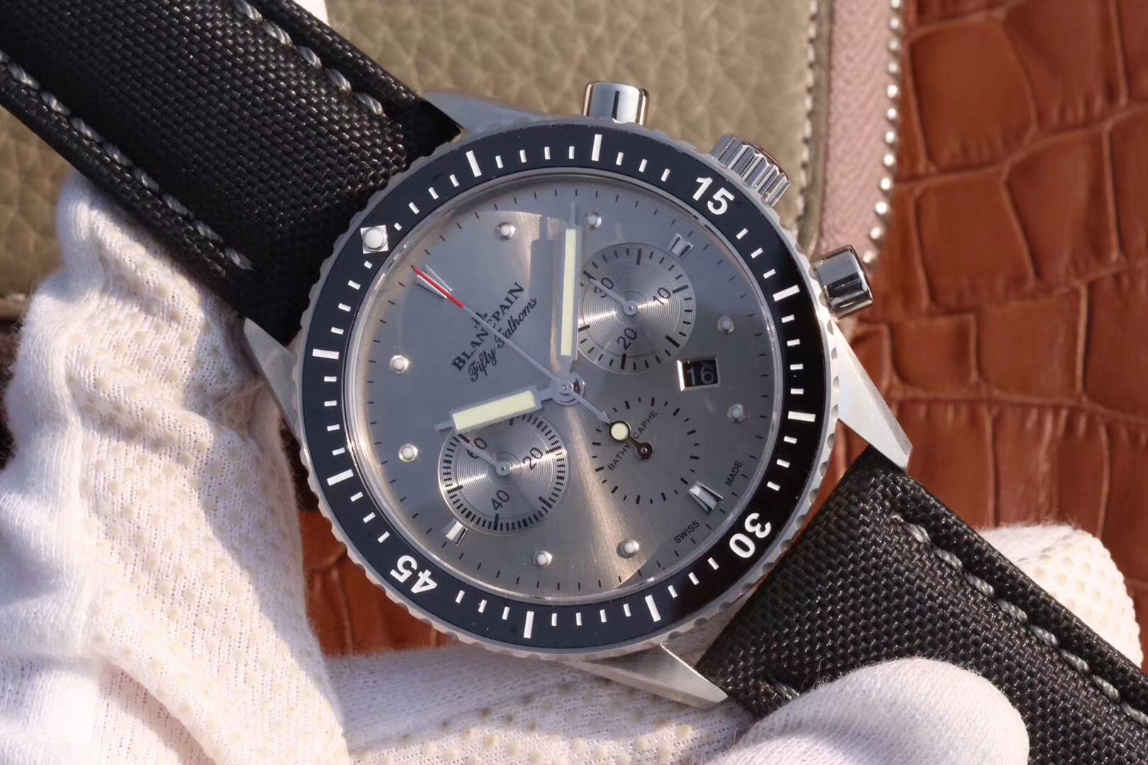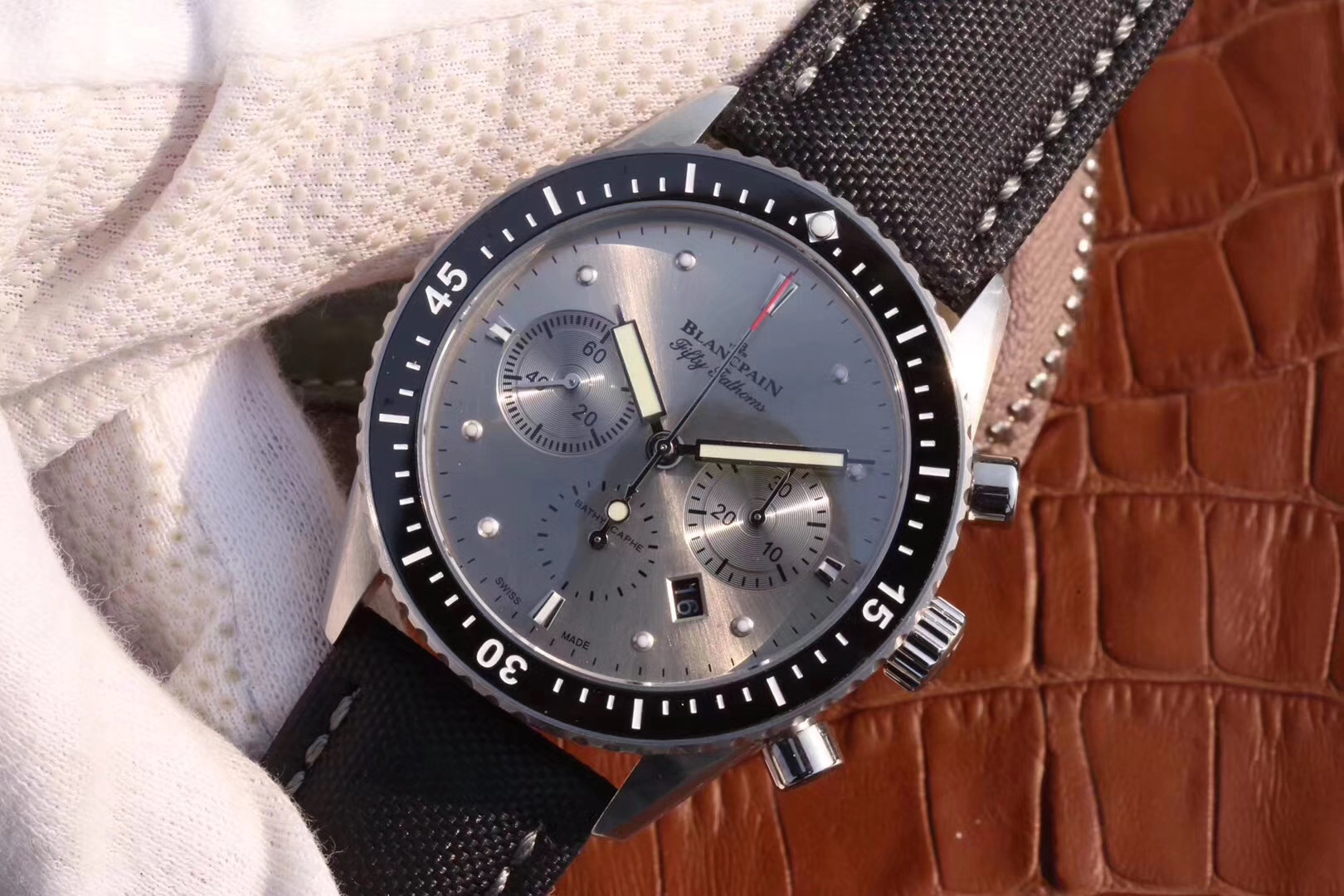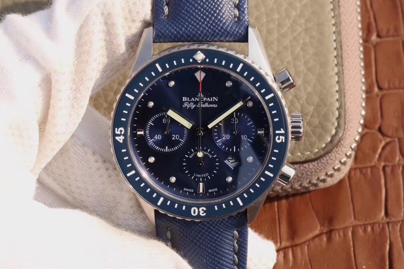 【毒物】宝珀五十噚系列5200-0153-B52A深潜器飞返计时码表问世了,低调中彰显不凡,采用进口泛蓝光蓝宝石玻璃,刀刮不留痕。腕表采用进口7750机芯改原版F385自动机械*日历窗口大小颜色与机芯功能完全对版专柜。直径:43.60mm。夹板宝石轴承颜色与原装一致,真正做到色泽纯良,让夹板不再一眼假!一体式夹板,除了外观更接近原装之余还能更好的保护机芯,质量更稳定!夹板经过研磨处理之后再做倒角加工,历时12个月慢工细琢只为了避免夹板的铜屑跌落机芯而导致机芯偷停。【表盘】日历大小对版,100%瑞士进口C3夜光,亮度持久度直逼原装正品!【防水】出厂100%三度防水测试。The customized version is the only version available in the market.