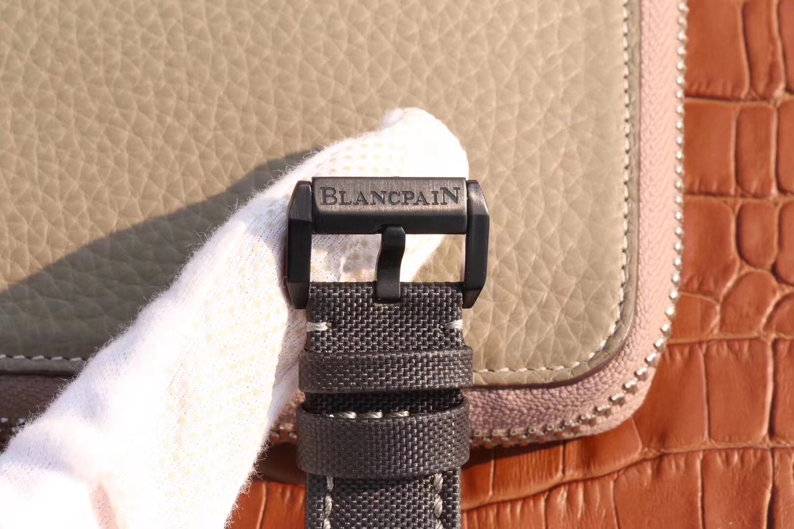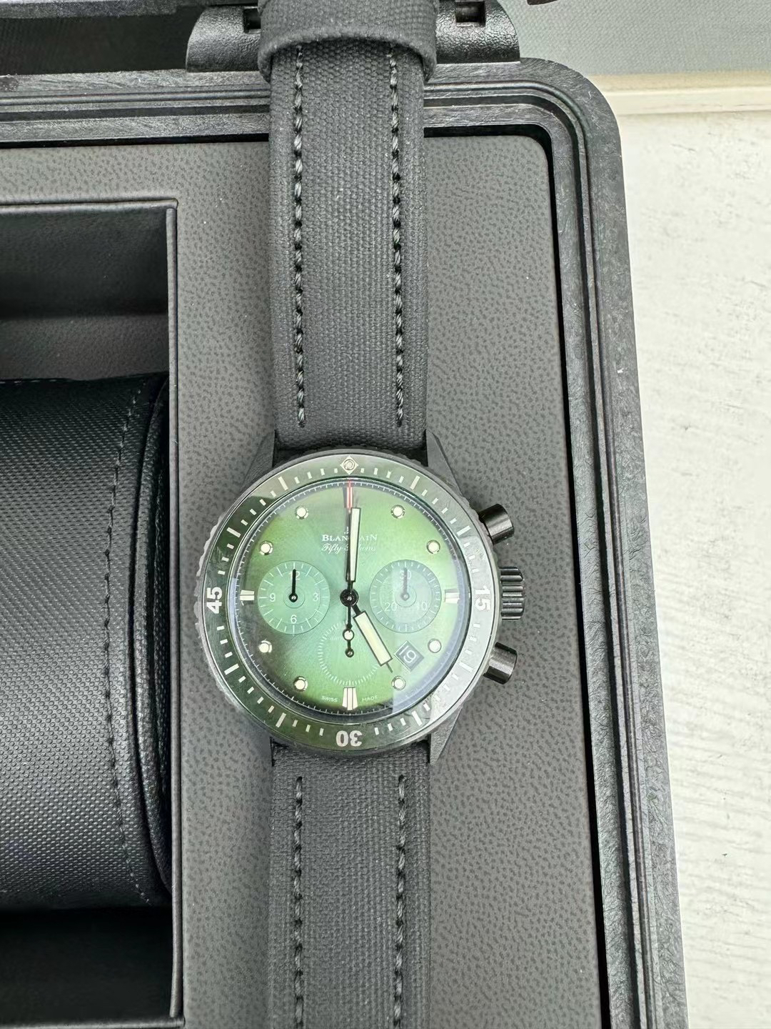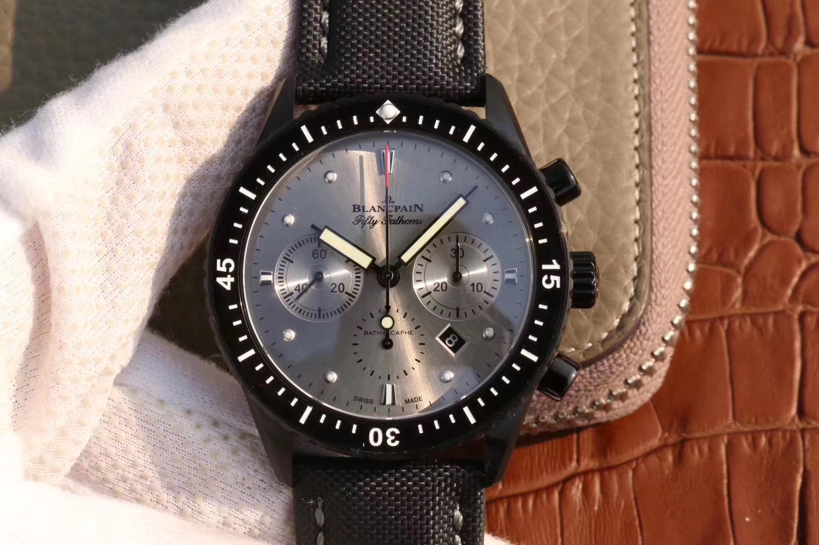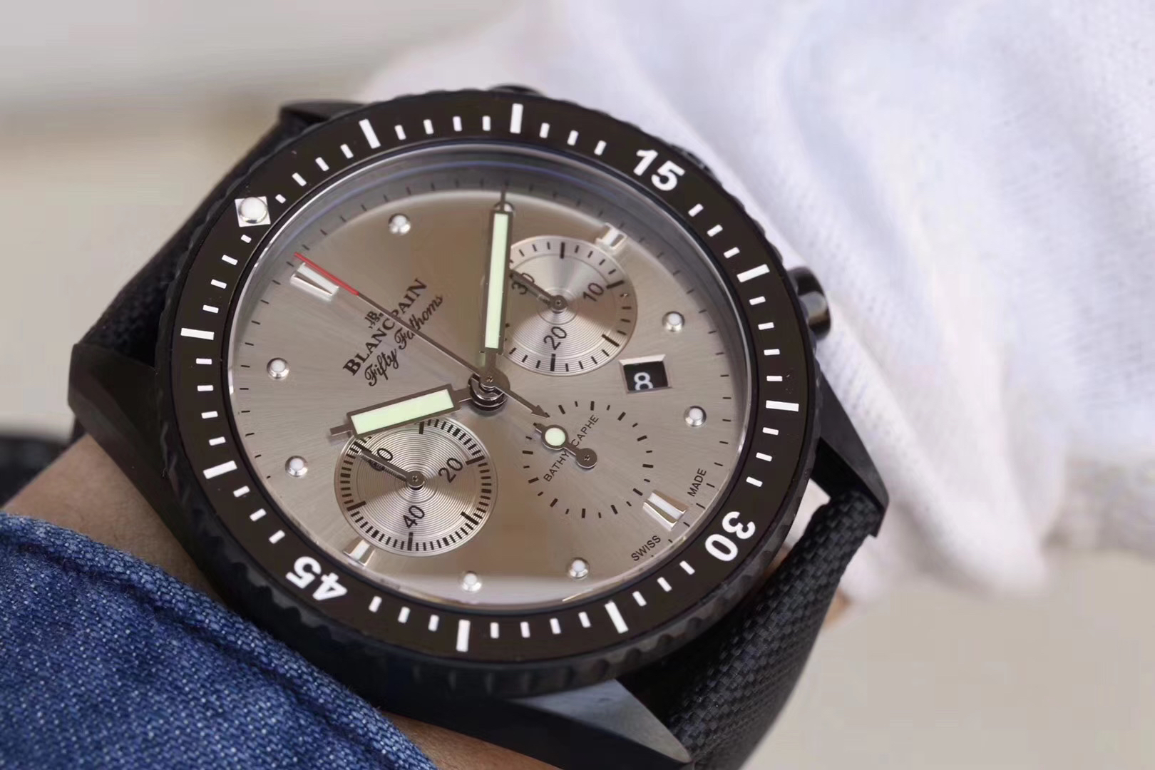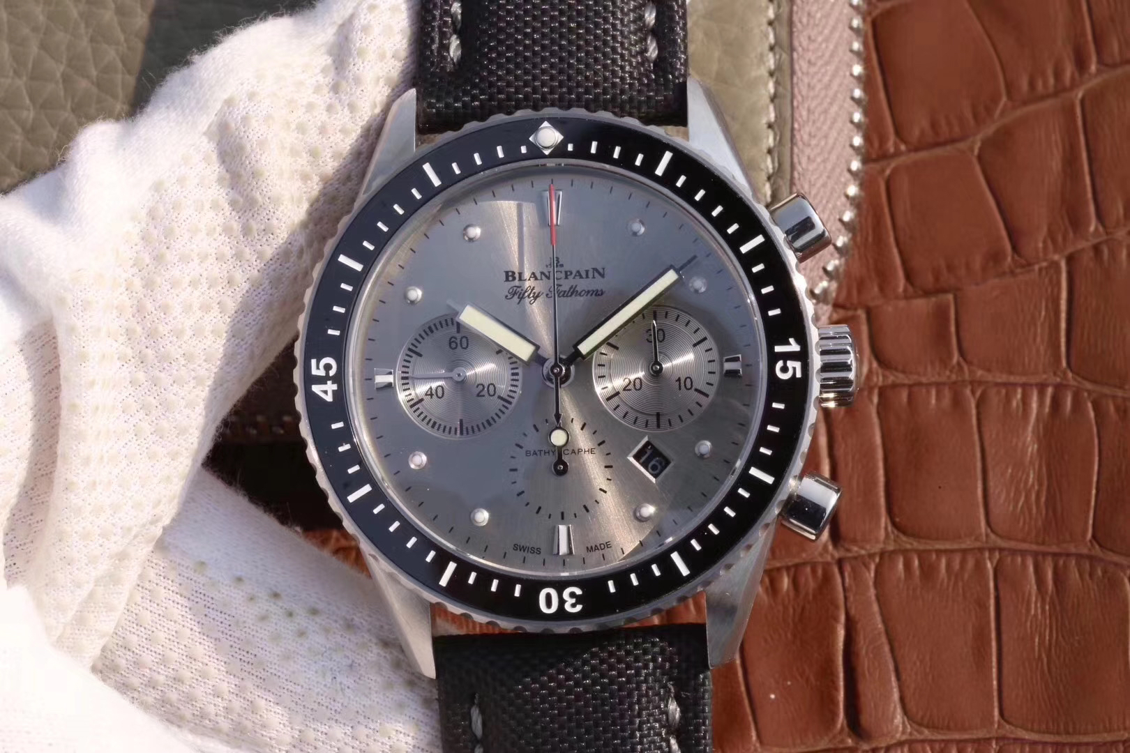 【毒物】宝珀五十噚系列5200-0153-B52A深潜器飞返计时码表问世了,低调中彰显不凡,采用进口泛蓝光蓝宝石玻璃,刀刮不留痕。腕表采用进口7750机芯改原版F385自动机械*日历窗口大小颜色与机芯功能完全对版专柜。直径:43.60mm。夹板宝石轴承颜色与原装一致,真正做到色泽纯良,让夹板不再一眼假!一体式夹板,除了外观更接近原装之余还能更好的保护机芯,质量更稳定!夹板经过研磨处理之后再做倒角加工,历时12个月慢工细琢只为了避免夹板的铜屑跌落机芯而导致机芯偷停。【表盘】日历大小对版,100%瑞士进口C3夜光,亮度持久度直逼原装正品!【防水】出厂100%三度防水测试。The customized version is the only version available in the market.