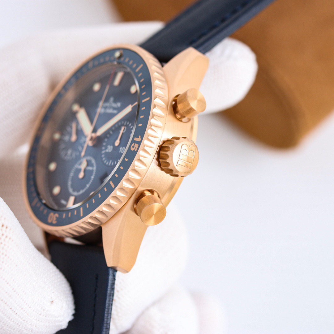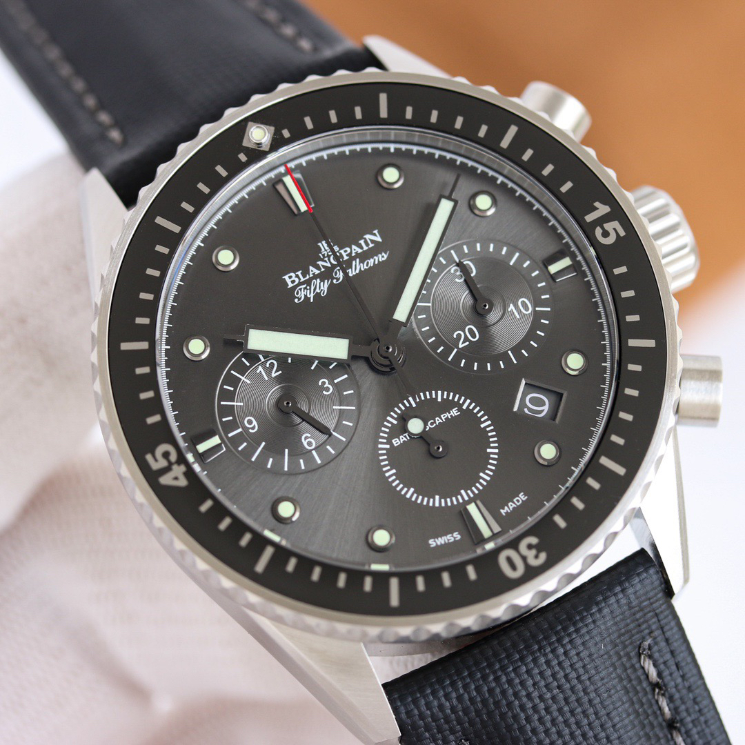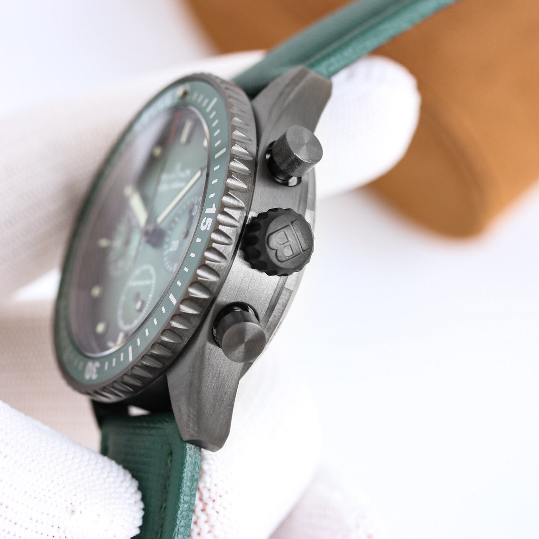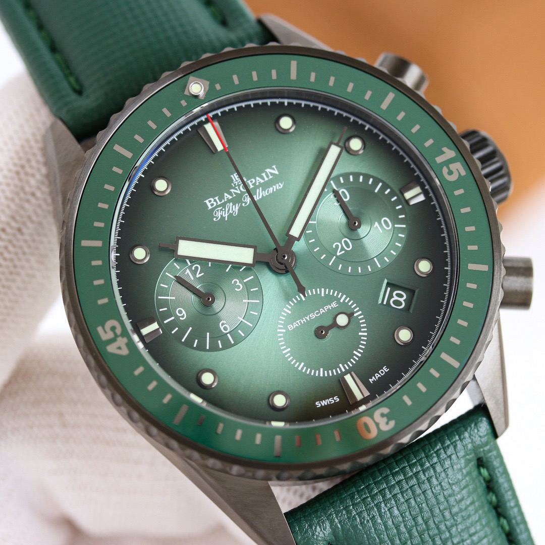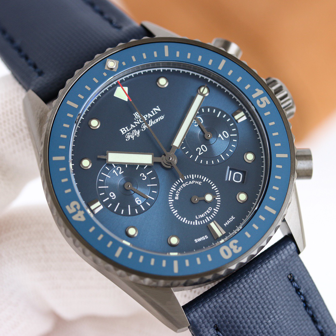 The Blancpain Fifty Fathoms series 5200-0153-B52A deep-sea submersible flyback chronograph has been launched, showcasing its extraordinary performance in a low-key manner. It is made of imported blue sapphire glass, which leaves no marks when scratched with a knife. The watch adopts an imported 7750 movement and the original F385 automatic mechanical * calendar window size, color, and movement function are completely matched in the counter. Diameter: 43.60mm. The color of the gemstone bearing on the clamp plate is consistent with the original, truly achieving pure and good color, making the clamp plate no longer fake at a glance! The integrated clamp not only looks closer to the original, but also better protects the movement and ensures more stable quality! After grinding and chamfering, the clamp plate was carefully crafted over a period of 12 months to prevent copper shavings from falling onto the movement and causing it to stop. 【 Dial 】 Calendar size matching, 100% Swiss imported C3 night light, brightness durability is close to the original genuine product! 【 Waterproof 】 Factory 100% third degree waterproof test.