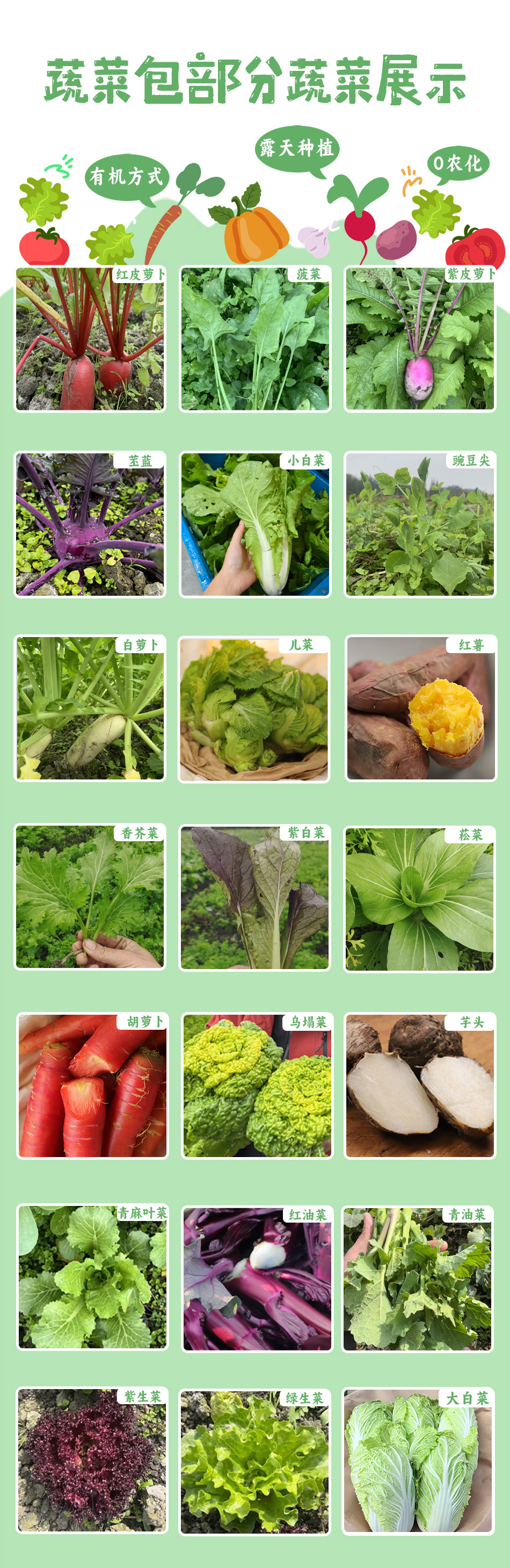 【品名】生态蔬菜包 【近期蔬菜内容】【不支持选菜,有忌口请备注】时令蔬菜——白萝卜、紫皮萝卜、红皮萝卜、胡萝卜、乌塔菜,韭黄,豌豆尖,红薯,洋葱,土豆、紫白菜,苏州青,蒜苗,无筋豆(四季豆),红厚皮菜,油麦菜,红皮莴笋,冬寒菜,油菜 【模式】CSA模式(社区支持农业) 【净重】6斤/箱(不低于5个品种随机搭配)4.5斤/箱(不低于5个品种随机搭配) 【发货区域】 【生产方式】无化学农药,无化肥,按照有机方式露天种植 【发货方式】每周一、周四,顺丰陆运发货,冰袋保鲜 【出品】成都原乡农场 【生产地】四川省成都市郫都区唐昌镇原乡农场 【温馨提示】 1、家庭人数在2-3人的,每天在家吃1-2次饭的,建议每周配送1次6斤蔬菜箱; 2、家庭人数在4-5人的,每天在家吃1-2次饭的,建议每周配送2次6斤蔬菜箱。 3、农场没有大棚,全露天种植,生长时间长,所以蔬菜的品相和口感可能会不如市场上的嫩,介意慎拍。 4、农场不用生长调节剂,发货不用保鲜剂,快递发货,收到的蔬菜可能没有菜市场的新鲜,介意慎拍。 5、蔬菜因利润微薄,不参与粮票赠送。 6、年度蔬菜包须在15个月内配送完。蔬菜套餐若中途退出或15个月内未配送完成,已配送次数不享受套餐优惠价,按原价结算。 【注意事项】 1、农场蔬菜有机方式种植,尽管努力挑选,但依然不排除有虫眼、虫子、烂心、凋萎等品相不佳的现象。如问题严重,请联系客服,好好沟通,协商解决。 2、不用化学农药化肥的蔬菜,大小、品相,甚至口感纤维化多等非标问题较多,不如农化蔬菜好看,我们也不用保鲜剂发货,叶子菜为当天采摘发货,收到会失水、个别可能会变黄,是正常现象,泡水可恢复活力,不以此售后,如果很在意蔬菜商品性的,请谨慎购买。 3、受天气或库存等原因影响快递可能偶有耽误,急单请发货前咨询客服,不接受没有提前沟通的拒收。 4、已发货后不接受没有沟通的退款申请。 5、生鲜类产品,快递抵达后请尽快取件。 【售后标准】 1、由于顾客电话关机、停机、不接电话联系不上收货人、收货信息有误等原因导致的快递延迟签收,以及导致腐坏,不在售后范围。 2、每个人口味偏好不同,不保证口感完全满足您的喜好,不以口感售后。 3、运输过程中挤压碰撞造成的严重破损、腐坏变质、产品不符、数量不符、重量不足等请于签收后6小时内发照片或视频联系客服,超出时效不售后哦。 |